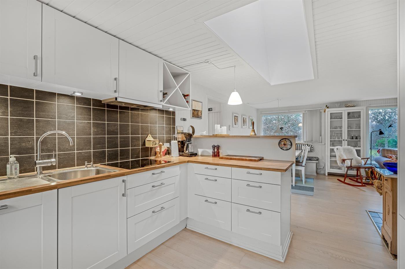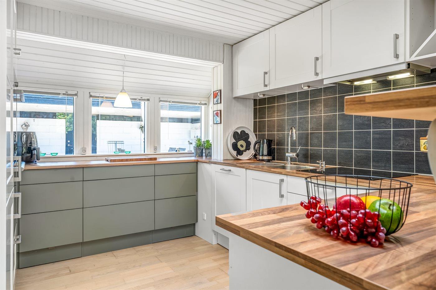 Køkkenet er udstyret med 1 køleskab. Der er 4 keramiske kogeplader, varmluftovn, mikrobølgeovn, Airfryer samt opvaskemaskine.