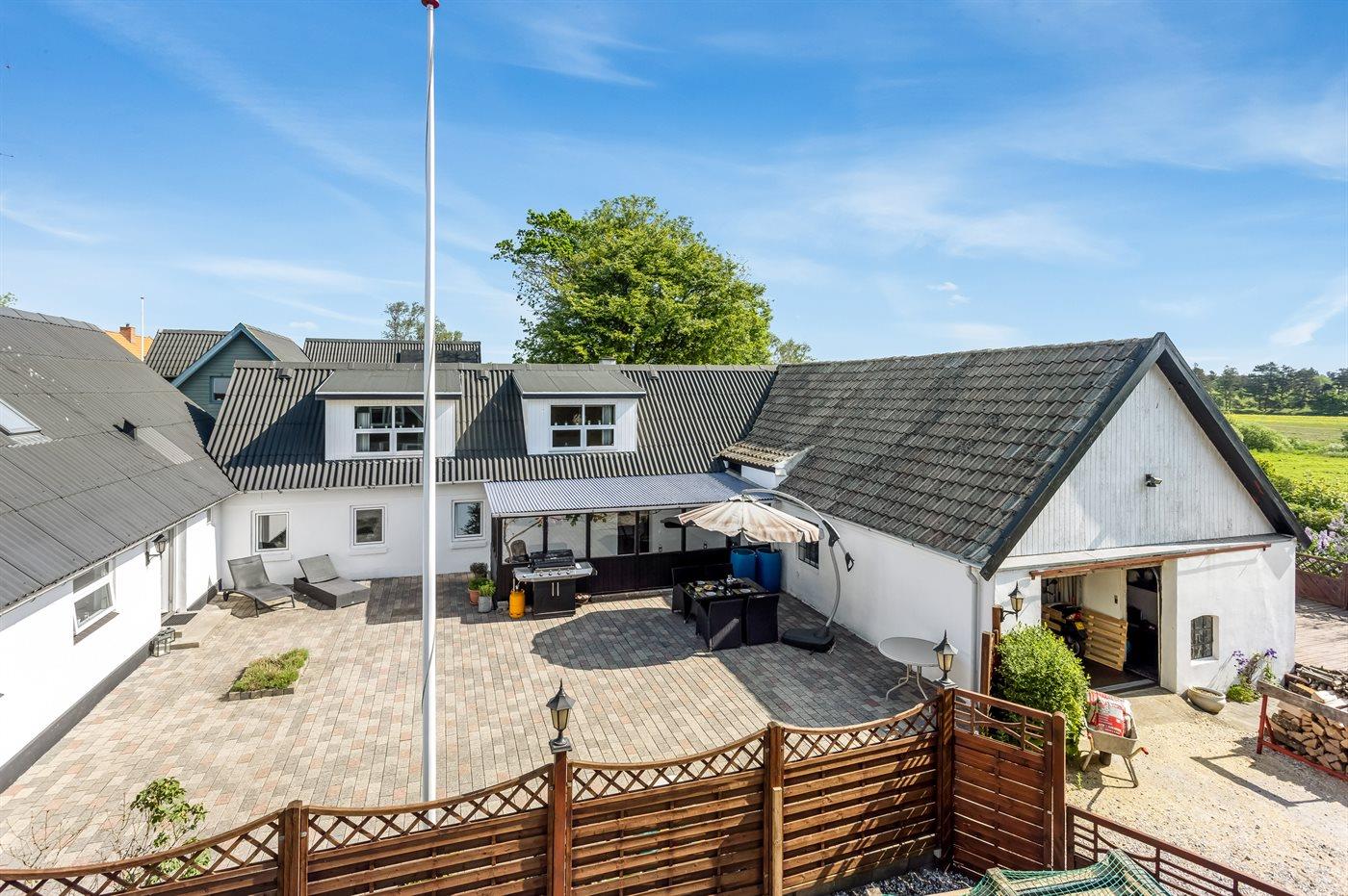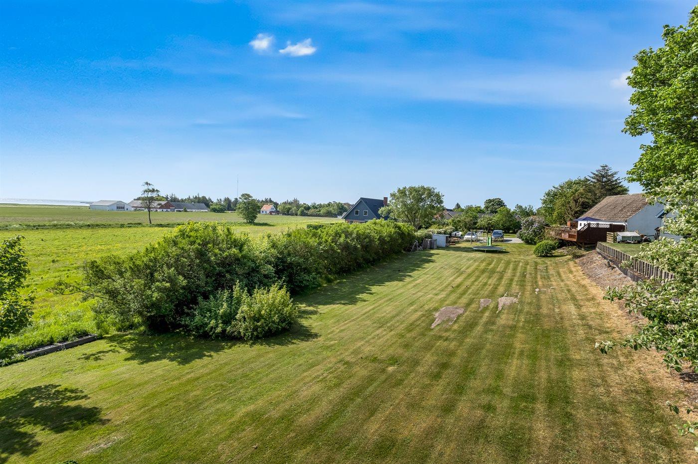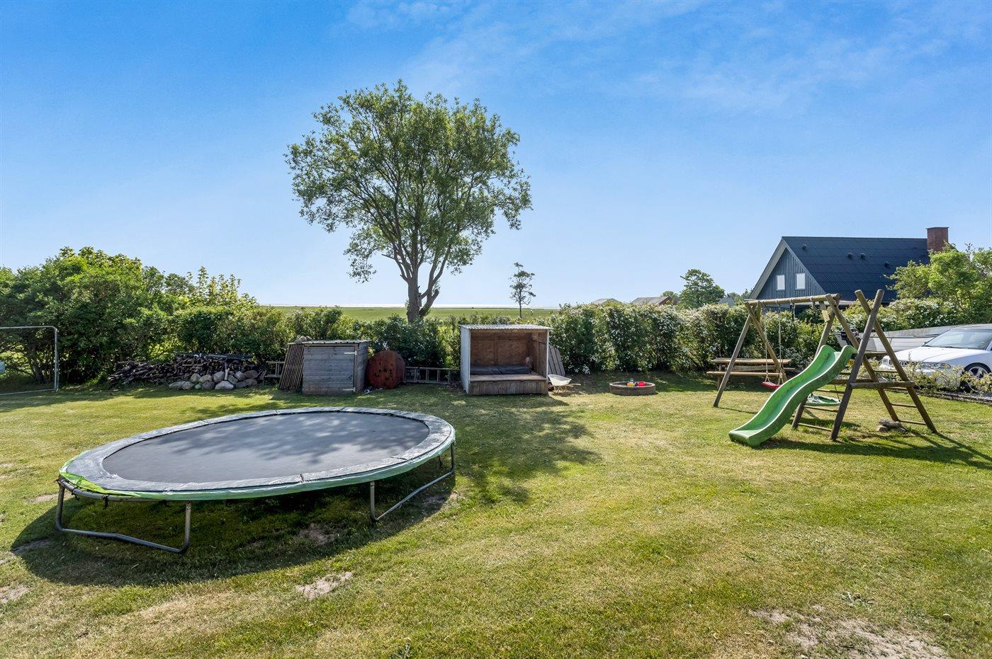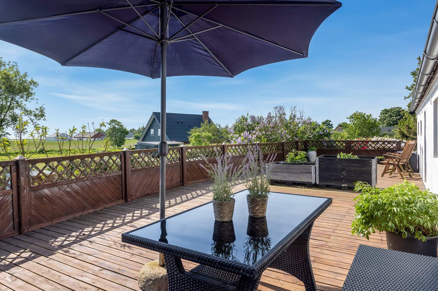 Til lejligheden hører der en privat overdækket terrasse på 20 m2 samt en stor åben terrasse mod øst (bag lejligheden) med udsigt til marker og havet. Nedenfor den åbne terrasse er der en stor fælles græsplæne med tilhørende legeplads, hvor der er plads til at spille bold, lege i sandkasse, gynge eller få en hoppetur på trampolinen. Det er også muligt at benytte den fælles gårdhave, hvor der er mulighed for at grille. Der er parkering ved ferieboligen.