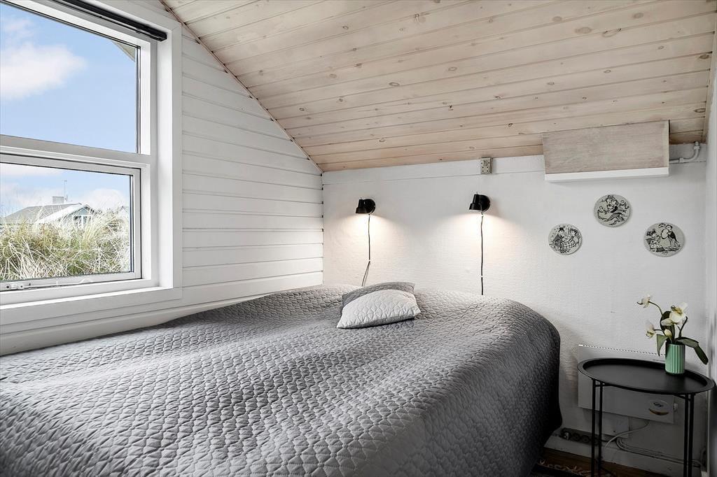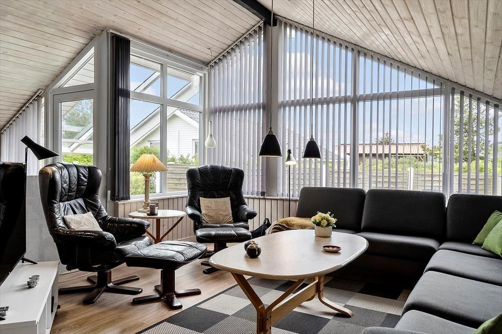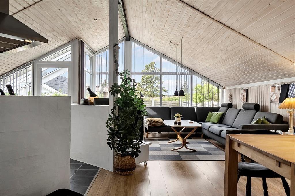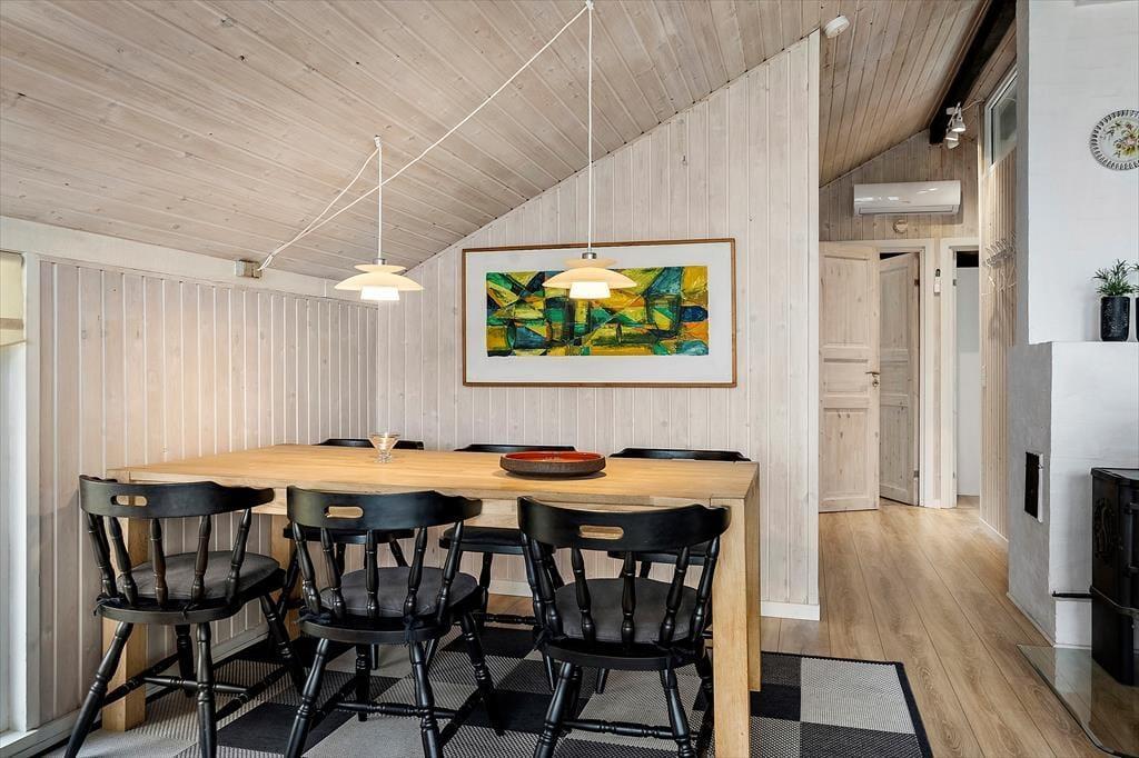 Der er noget helt særligt over stemningen i dette hyggelige sommerhus på Mose-Bølle Vej 8 i Vorupør. Her bliver du mødt af en lys og imødekommende atmosfære, hvor renoverede detaljer og moderne komfort går hånd i hånd med klassisk sommerhuscharme. Det store vinduesparti trækker dagslyset helt ind i stuen og giver et skønt udsyn til haven – mens den knitrende brændeovn sætter scenen for ro, nærvær og varme efter en lang dag i naturen. De lyse trævægge og den rolige indretning gør det let at falde til og føle sig hjemme, og her er god plads til, at hele familien kan samles om feriehyggen. Uanset årstiden er dette et skønt tilflugtssted, hvor du kan sænke skuldrene og bare være – om det så er med en kop kaffe i morgensolen eller et spil kort i brændeovnens skær, når aftenen falder på.
