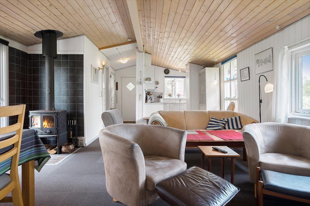 Træd indenfor i dette hyggelige sommerhus, hvor stemningen straks indbyder til afslapning og samvær. I husets hjerte finder du en dejlig opholdsstue, hvor en knitrende brændeovn skaber en varm og hyggelig atmosfære – perfekt til de kølige aftener, hvor du kan læne dig tilbage med en god bog eller en kop varm kakao. Her kan du også samle familien til brætspil eller en god film efter en dag fyldt med oplevelser i naturen. Indretningen er lys og venlig med et åbent opholdsrum, der binder stue og køkken sammen og giver en rummelig fornemmelse. Der er god plads til op til seks personer, så både børnefamilier og vennepar kan nyde ferien sammen.