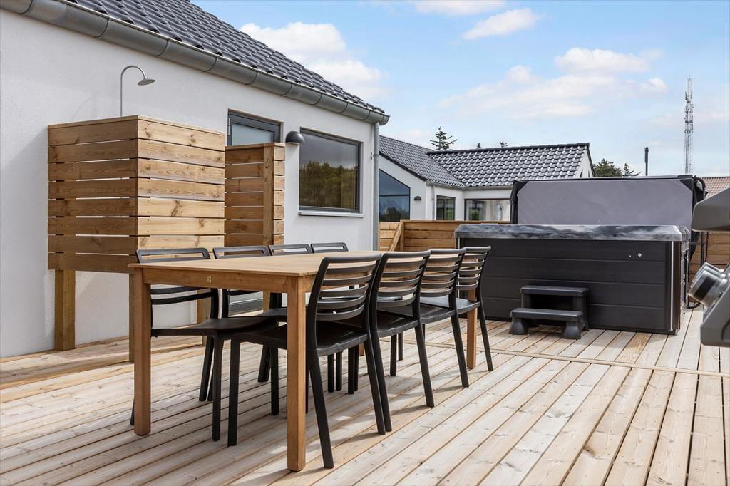 Udenfor finder du et stort terrassemiljø med både åbne og overdækkede arealer, hvor du kan nyde udelivet uanset vejret. Start dagen med en forfriskende udebruser og slut den af med en afslappende stund i det udendørs spabad. Den rummelige grund er perfekt til leg og aktiviteter, mens den overdækkede terrasse indbyder til hyggelige grillaftener eller en stille stund med en god bog. Her kan du nyde morgenkaffen i solopgangen eller afslutte dagen med et glas vin i solnedgangen.