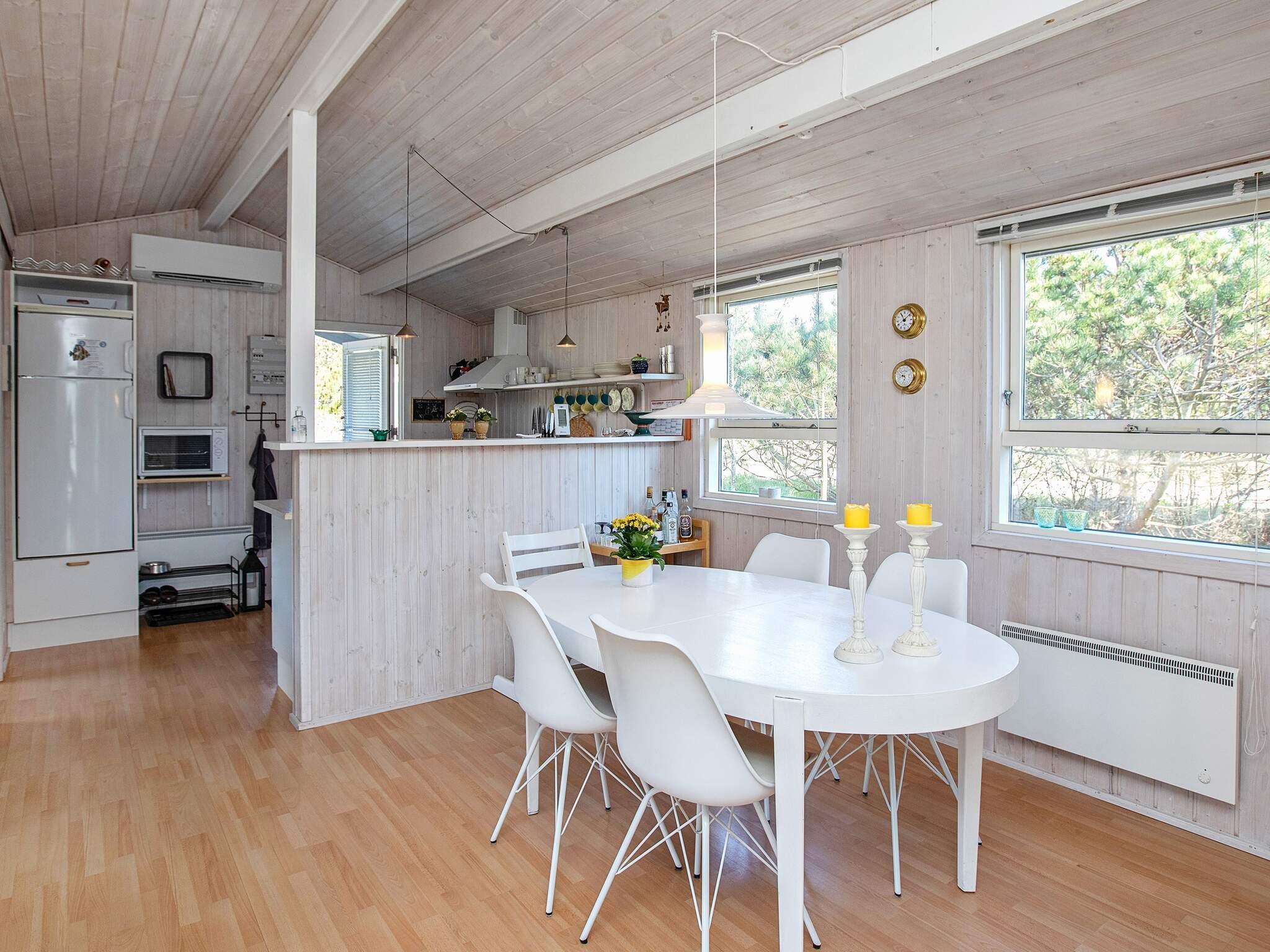 Ved Vorupør finder I dette sommerhus renoveret i 2004, så det fremstår særdeles lyst og velholdt. Der er kombineret køkken/spise/opholdsstue med direkte udgang til terrassen. I opholdsstuen er der bl.a. tv og brændeovn. Der er installeret gratis internet og der er mulighed for at se både danske og tyske kanaler. Køkkenet har keramiske kogeplader, separat ovn, køle/frys og mikroovn. Der er to lyse soverum med dobbeltsenge samt direkte udgang til en morgenterrasse. Flot badeværelse med fliser og bruseniche samt gulvvarme. Der er vaskemaskine. Der er endvidere en overdækket terrasse ved køkkenindgangen. Der er gasgrill. Huset ligger ud til et lille plantageområde og tæt ved huset findes en fælles legeplads med gynger m.m. Udlejes ikke til ungdomsgrupper.
