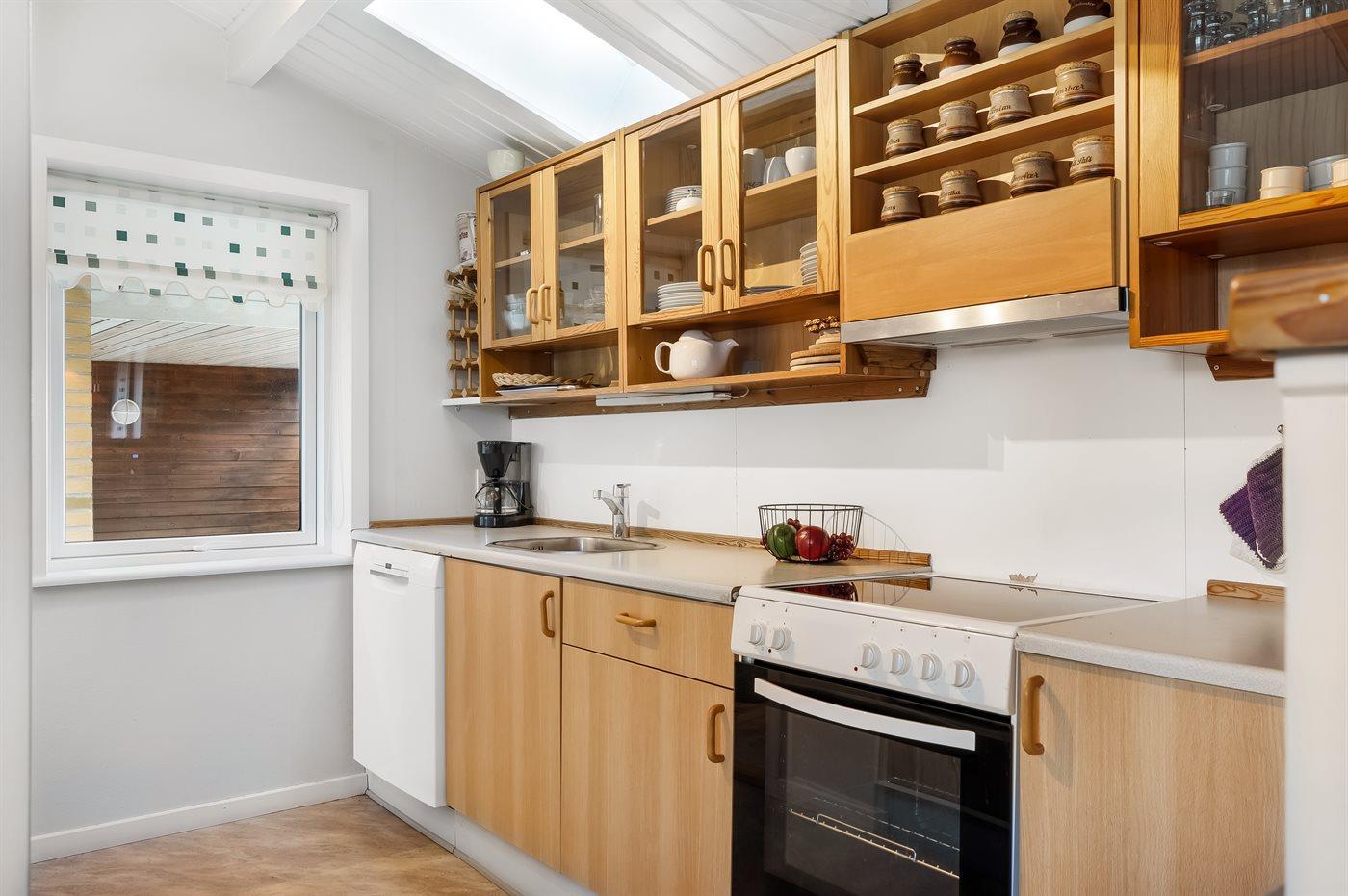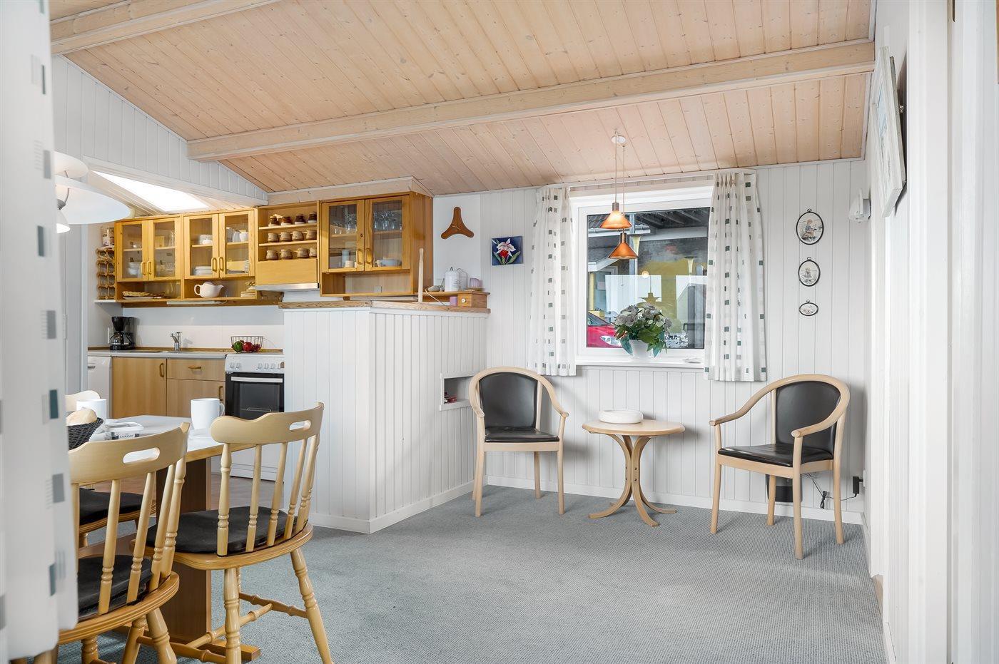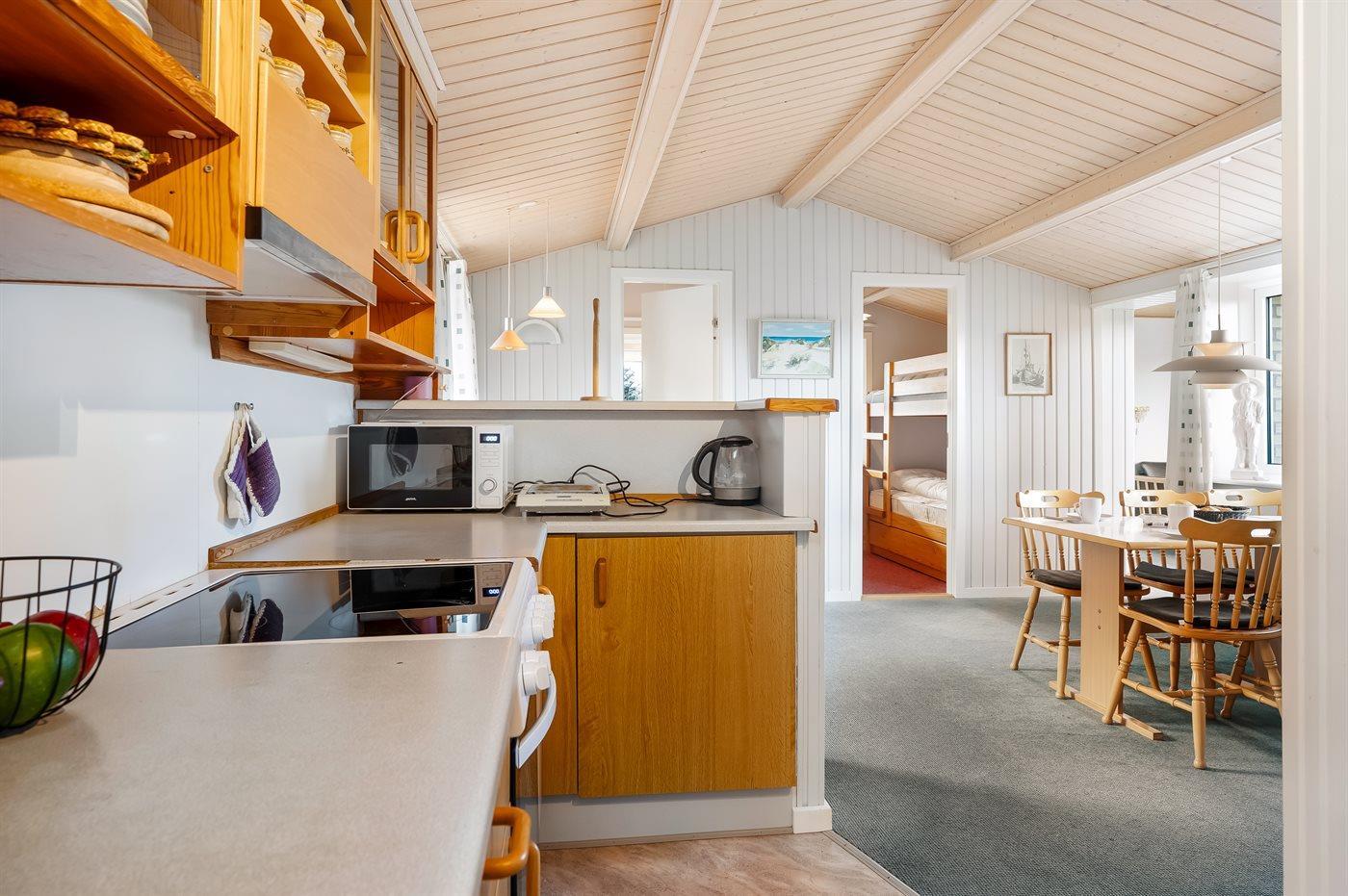 Køkkenet er udstyret med 1 køleskab. Der er 4 elkogeplader, varmluftovn, mikrobølgeovn samt opvaskemaskine.