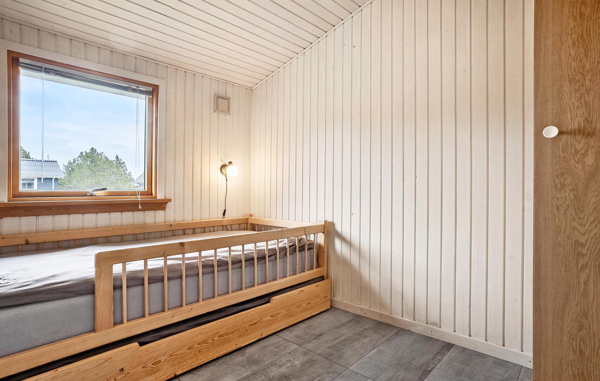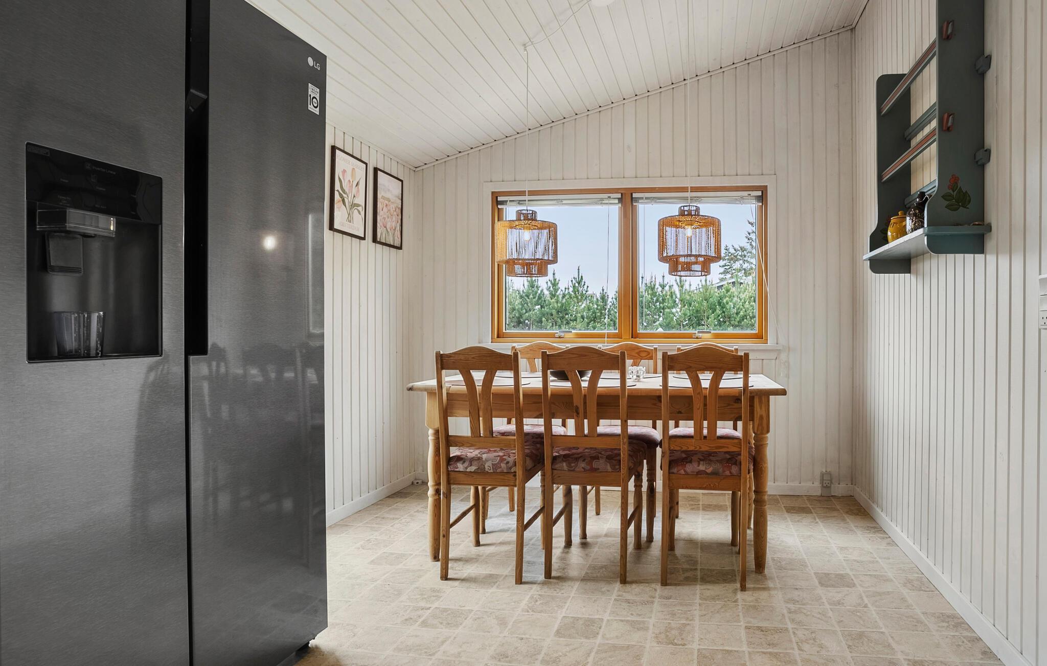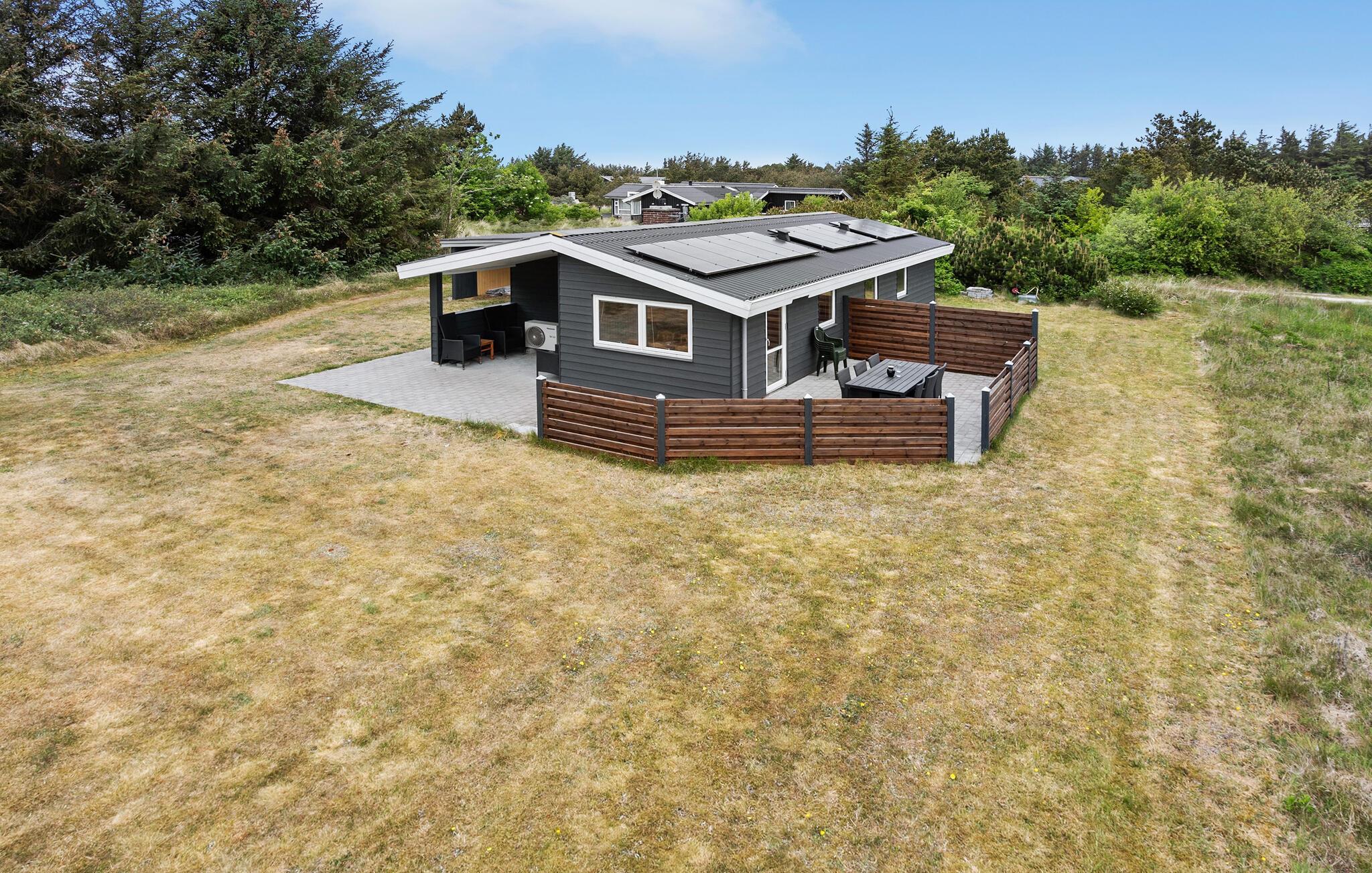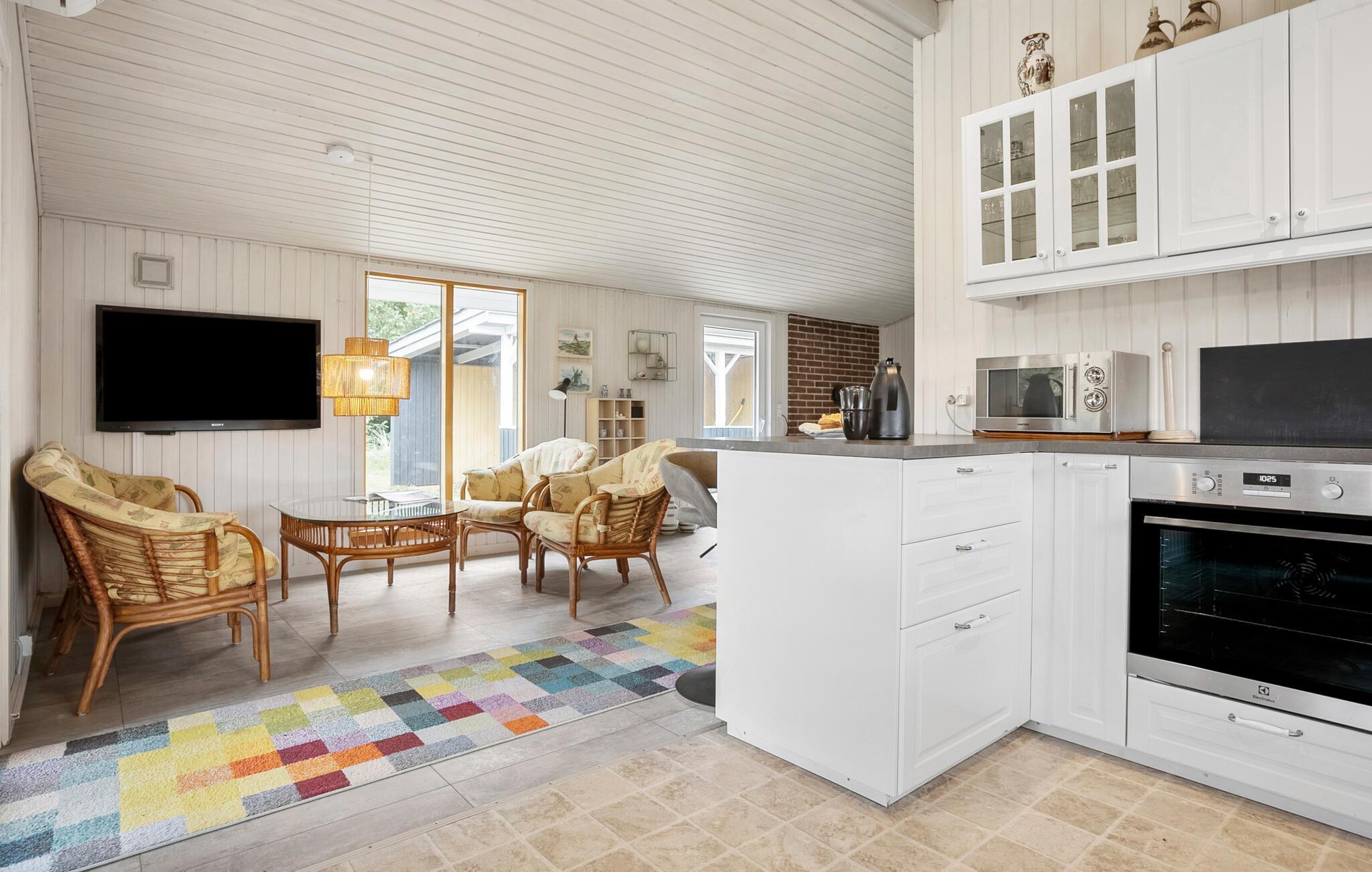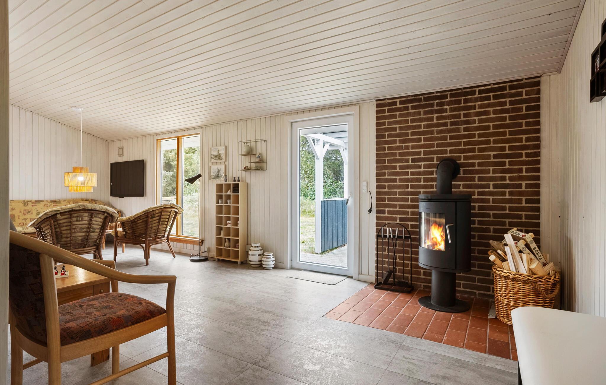 Dette feriehus i ét plan byder jer velkommen med lyse og venlige værelser, hvor I altid har udsigt over den store have, der omgiver jeres hjem. Tilbered jeres yndlingsmåltider i det åbne køkken, spis i den indbydende spiseplads og lad brændeovnen sørge for ekstra hygge om aftenen, mens I slapper af med en film eller et brætspil.