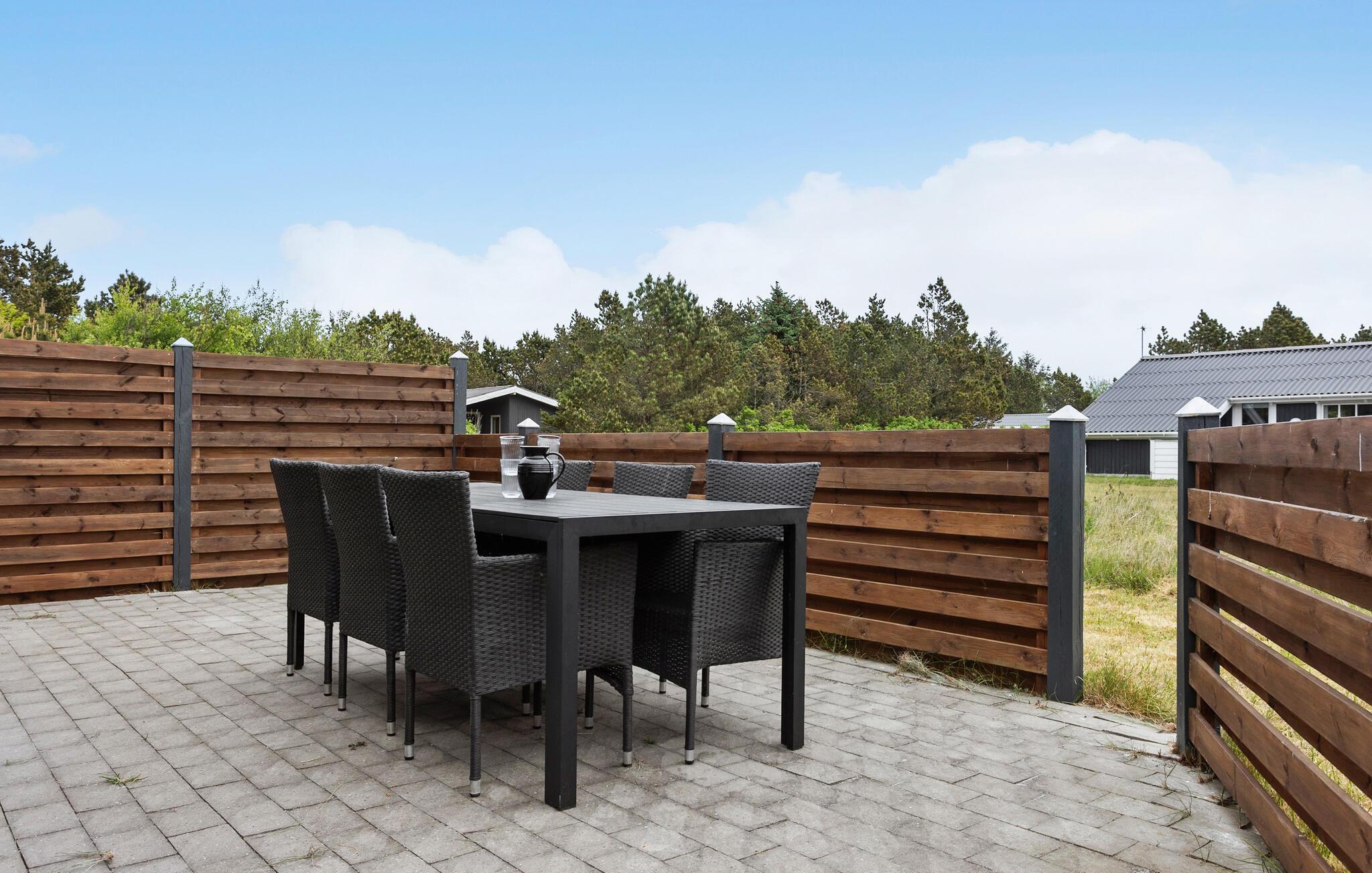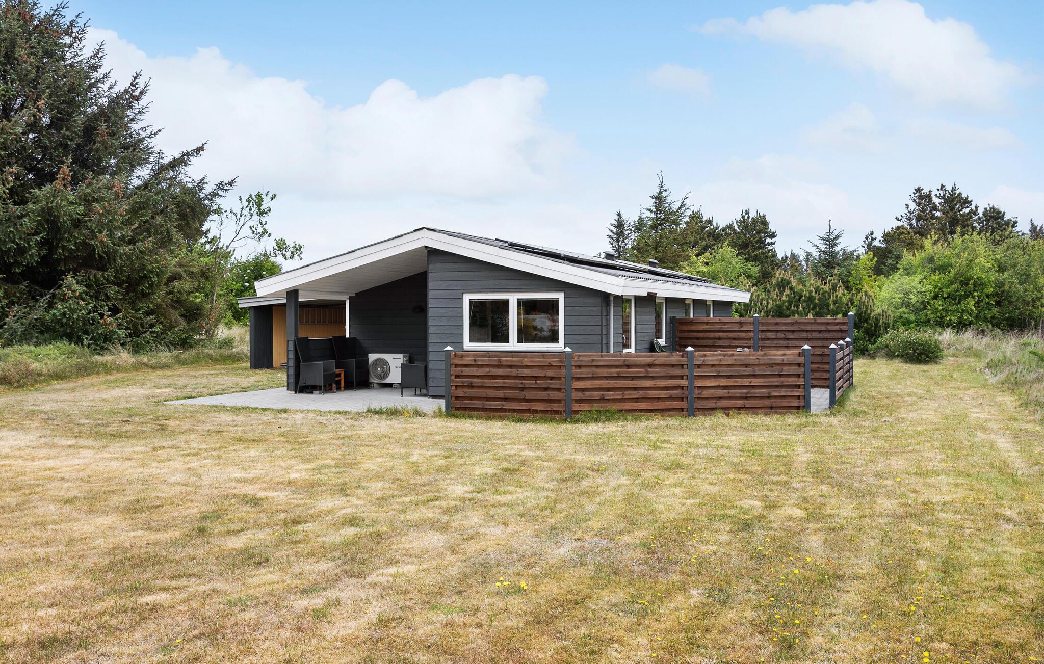 Nyd en fredfyldt ferie i dette lyse, komfortable træhus nær Vorupør Strand med have og åben terrasse.