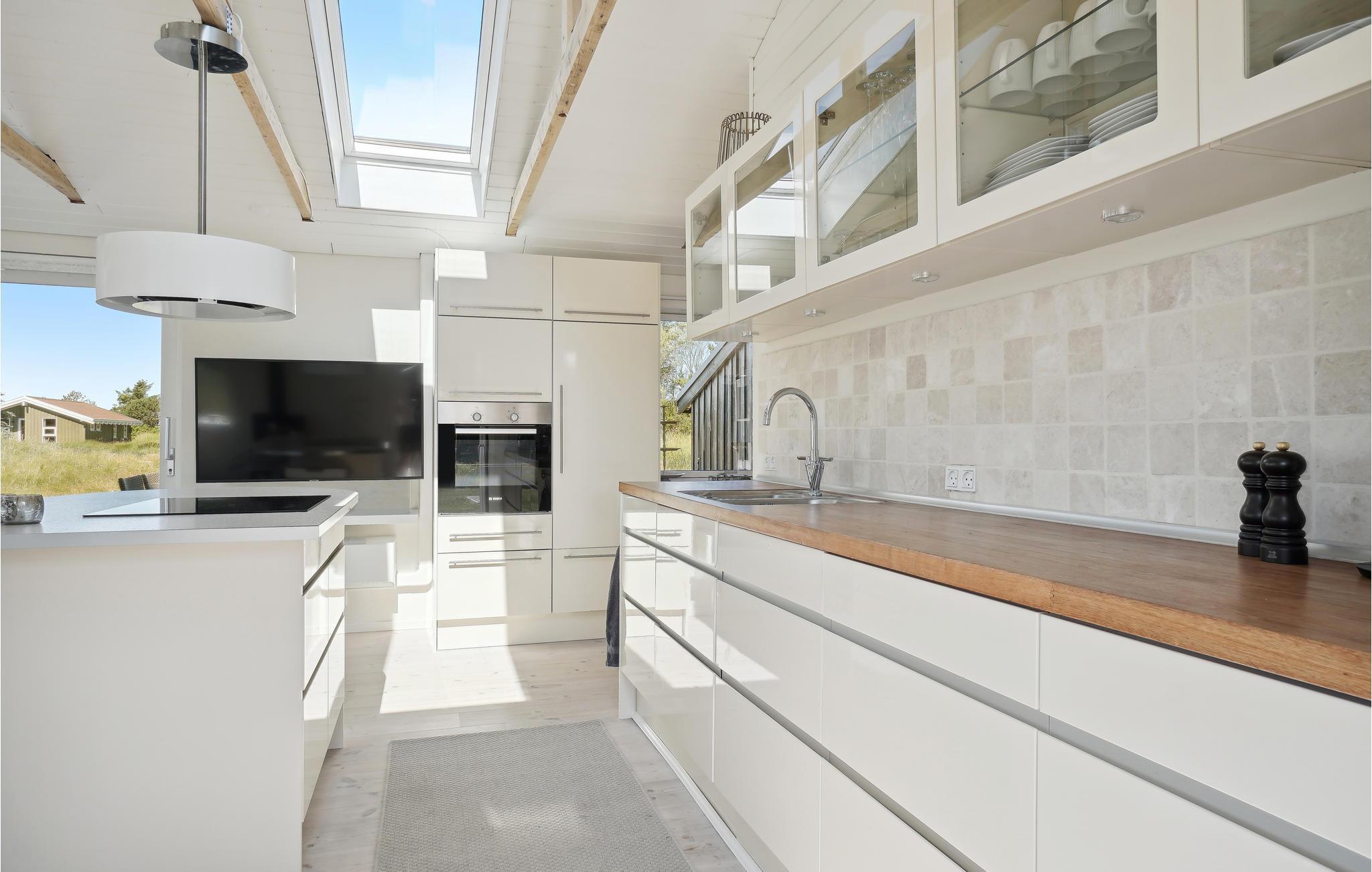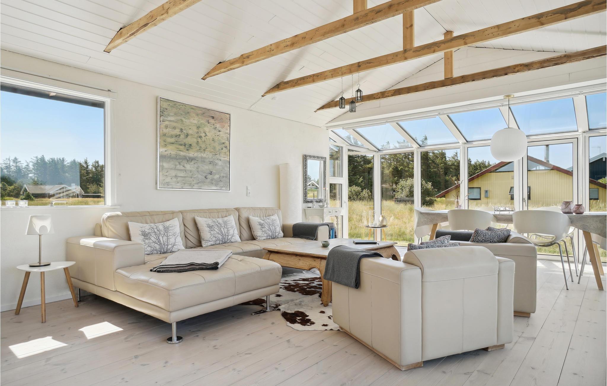 Lyst, venligt og meget højt til loftet, såvel ude som inde, er vist det, der bedst betegner dette sommerhus. Her kan I nyde det store, lyse opholdsrum, som skaber de bedste ferierammer. Der er terrasser på begge sider af huset, så I næsten altid kan finde en god lækrog, uanset om det blæser fra vest eller ej. Sommerhuset ligger centralt i Nørre Vorupør, kun en rask gåtur fra Vesterhavet og ikke langt fra de små butikker og spisesteder, som kendetegner byen. Vorupør rummer oplevelser for hele familien, idet den lille fiskerby har alt fra shopping til kunst og kultur. Byen ligger helt ned til Vesterhavet, og på den store strandterrasse kan I nyde specialiteter fra de lokale restauranter med udsigt til det smukke hav - uden at få sand mellem tæerne. Cold Hawaii er betegnelsen for kyststrækningen fra Agger Tange til Hanstholm, og er oprindeligt udsprunget af surferkulturen på grund af de usædvanlig gode bølger og vindforhold. Derfor favner naturen omkring Vorupør mange forskellige aktiviteter, idet havet giver nogle af Nordeuropas bedste surfsteder, men er samtidigt et dejligt sted at bade eller fiske direkte fra molen. Der er mulighed for rideture og vandreture gennem Nationalpark Thy, hvor I kan opleve naturen helt tæt på.
