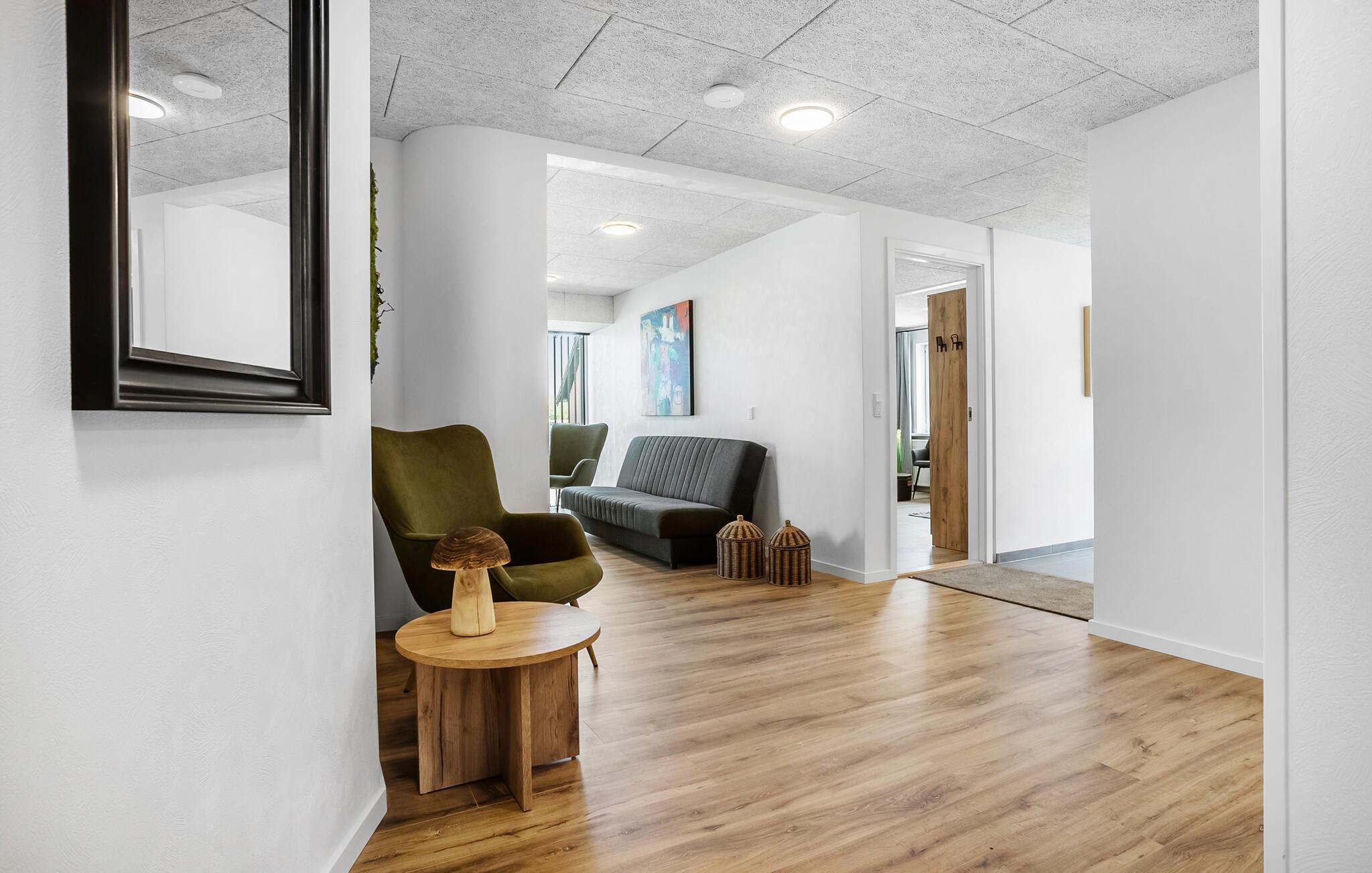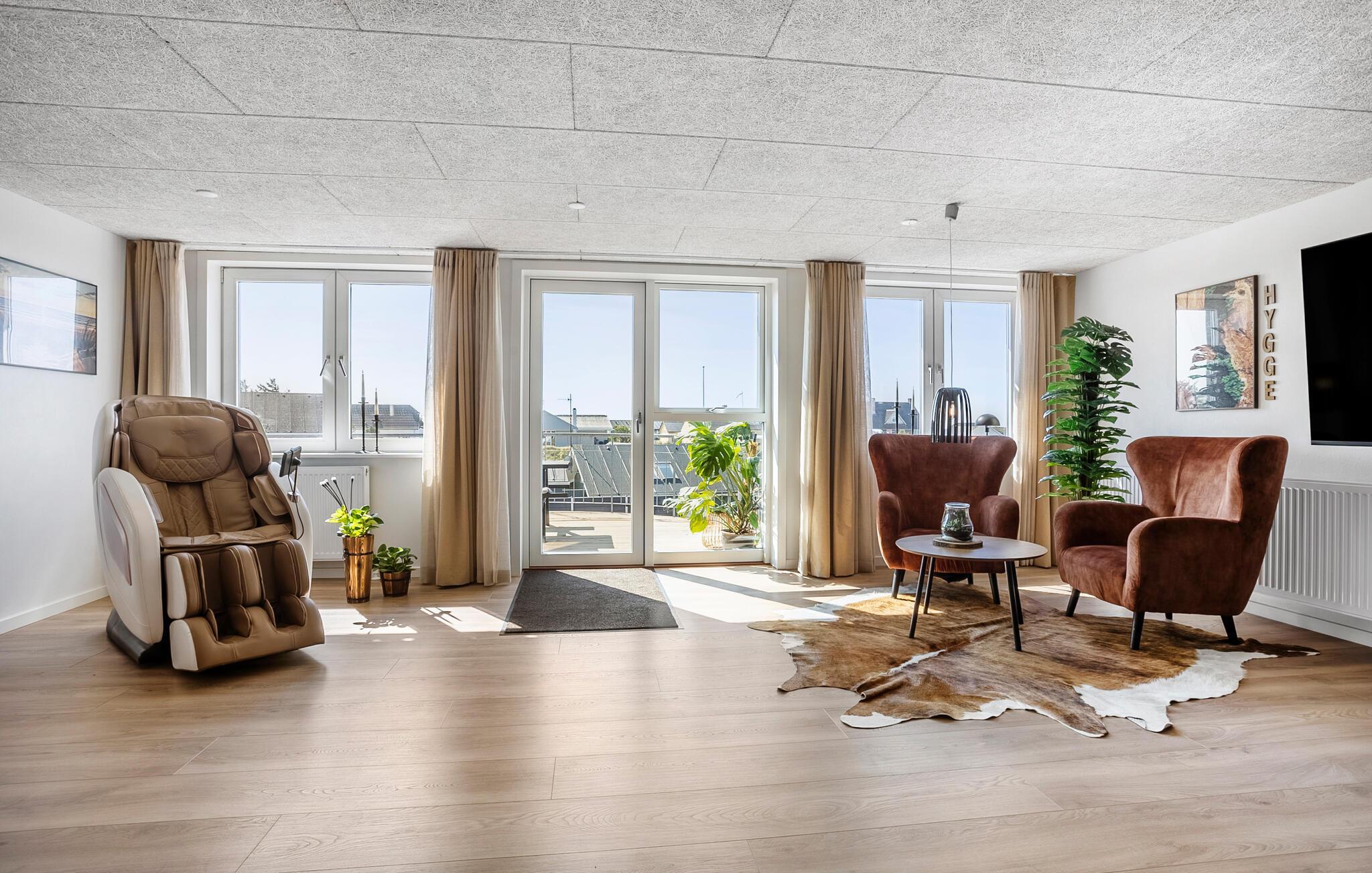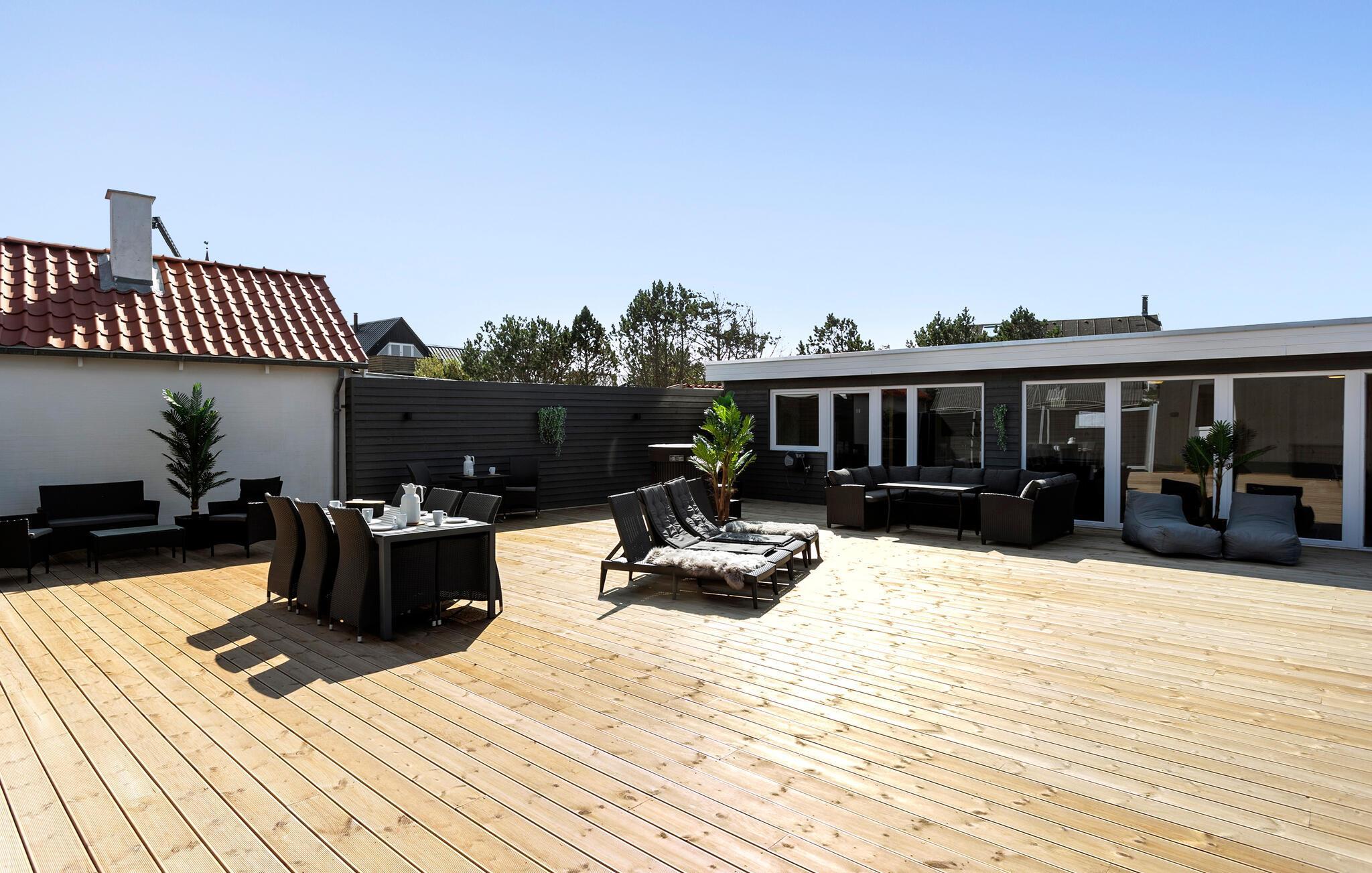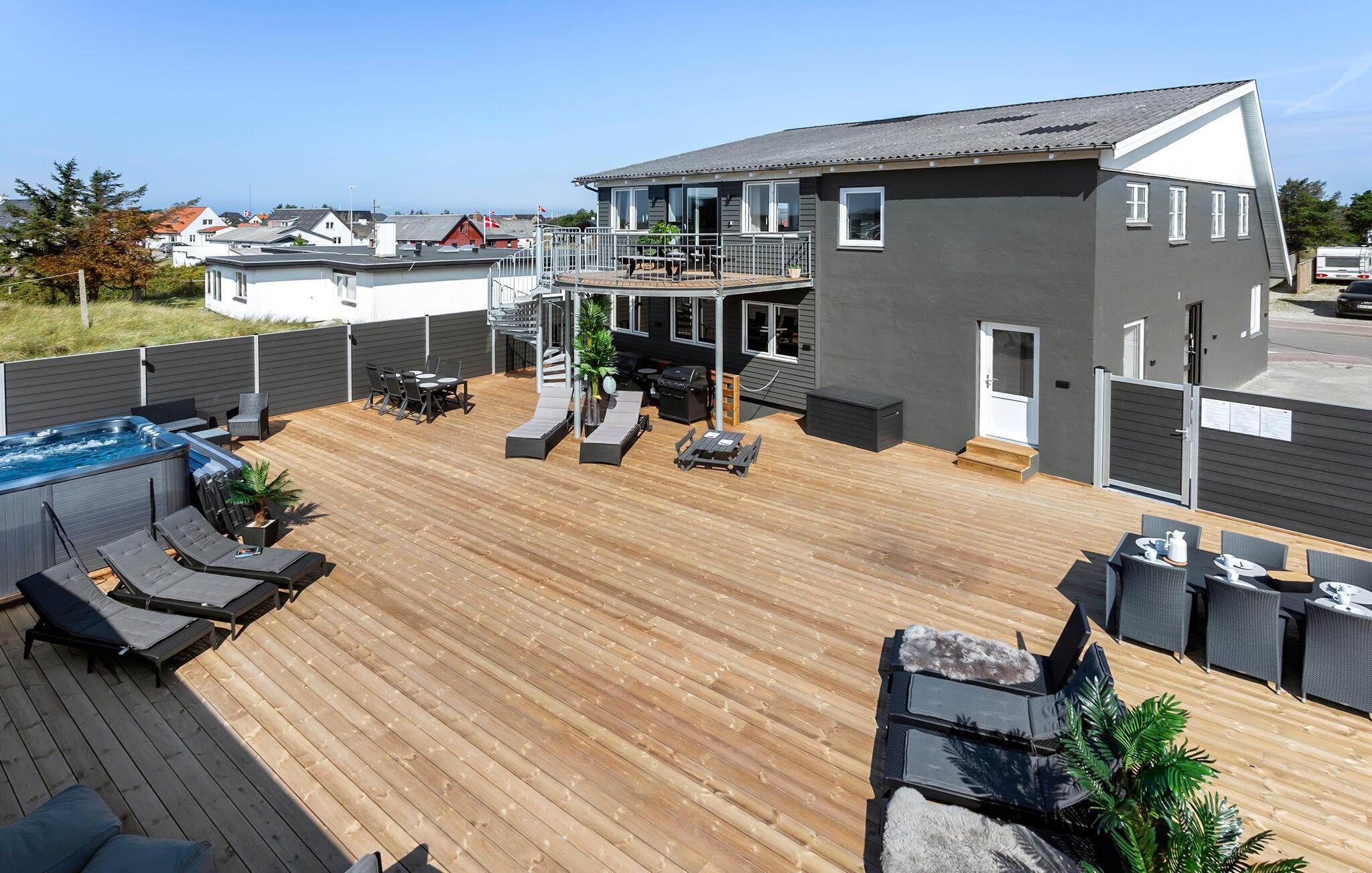 Gå ud på den rummelige træterrasse, perfekt til solrige eftermiddage eller lune aftener. Læn jer tilbage i liggestolene, saml jer i loungeområderne, eller sæt jer ved et af de store borde. Udendørsspabadet tilbyder beroligende afslapning.
