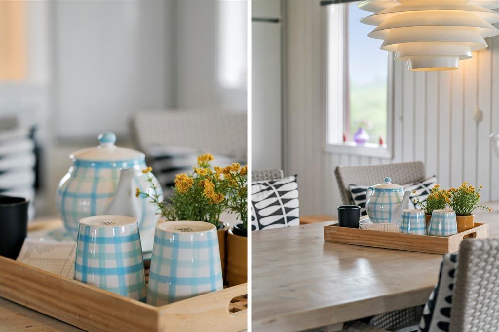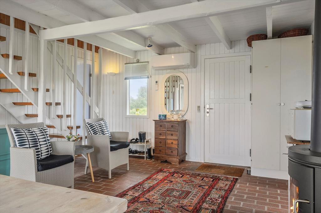 Indenfor mødes du af en lys og indbydende atmosfære, hvor både indretning og materialer er udvalgt med øje for komfort og feriestemning. Sommerhusets to etager giver en fornemmelse af luft og rummelighed – og gør det nemt at finde sit eget fristed, når der er brug for ro. Køkken og stue ligger i åben forbindelse, og her kan du samles med de andre i selskabet over madlavning, spil og hyggelige stunder i sofaen. Store vinduer sørger for et skønt lysindfald, og det er nemt at lade blikket glide ud mod haven og naturen, mens man bare nyder roen og nærværet.