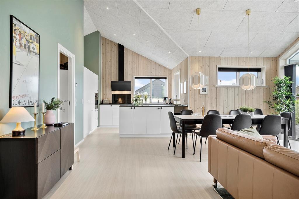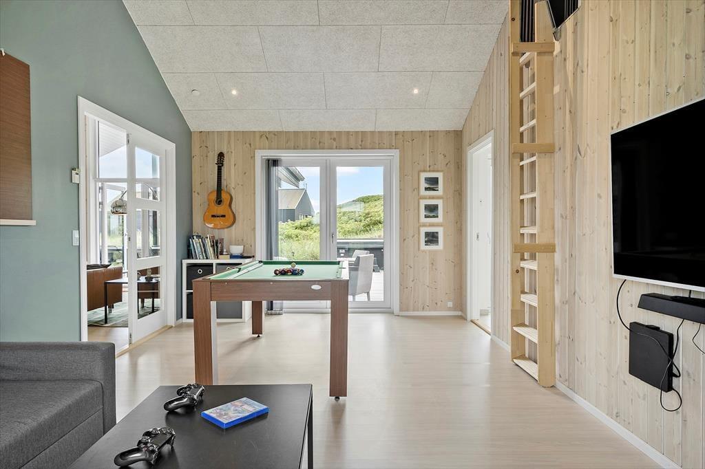 Indenfor bliver du mødt af et sommerhus, hvor der er kræset for detaljerne. Materialerne er moderne og lyse, og den velindrettede planløsning skaber de perfekte rammer for både hygge og afslapning. Køkken og stue ligger i åben forbindelse, og det store vinduesparti lukker dagslyset ind og åbner rummet op mod den omkringliggende natur. Du kan læne dig tilbage i sofaen med en god bog, mens lyden af Vesterhavets bølger svagt høres i baggrunden. Den flotte stue ligger i åben forbindelse med et veludstyret køkken, og fra stuen har I desuden direkte adgang til et stort aktivitetsrum med poolbord og PlayStation. Badeværelset er ikke bare praktisk – det er også en del af oplevelsen. Her finder du nemlig både en dejlig sauna og direkte udgang til terrassen, så du nemt kan kombinere saunagus med et frisk udendørsbad. Huset har en gennemført og indbydende atmosfære, der skaber ro fra det øjeblik, du træder ind ad døren.