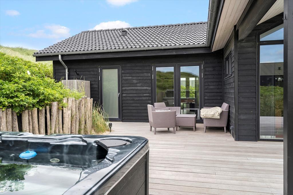 På Byskovvej 36 i Vrist får du alt det bedste fra Vestkysten i én ferieadresse: Et moderne og smagfuldt sommerhus, der ligger helt fremme i første klitrække – med udespa, sauna og en solrig terrasse som prikken over i’et. Her kan du nyde naturens nærvær og samtidig være tæt på havet og områdets oplevelser.