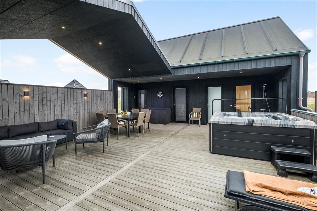 Terrassen er det perfekte sted at nyde de lange sommerdage. Den er både overdækket og lukket, hvilket gør den ideel for familier med små børn, da de kan lege trygt udenfor. Det nye kvalitetsudespa på terrassen giver dig mulighed for at slappe af under åben himmel, uanset vejret. Forestil dig at sidde i det varme vand med en drink i hånden, mens du ser solen gå ned over klitterne. Der er også rig mulighed for at grille på terrassen, så du kan tilberede og nyde lækre måltider udendørs.