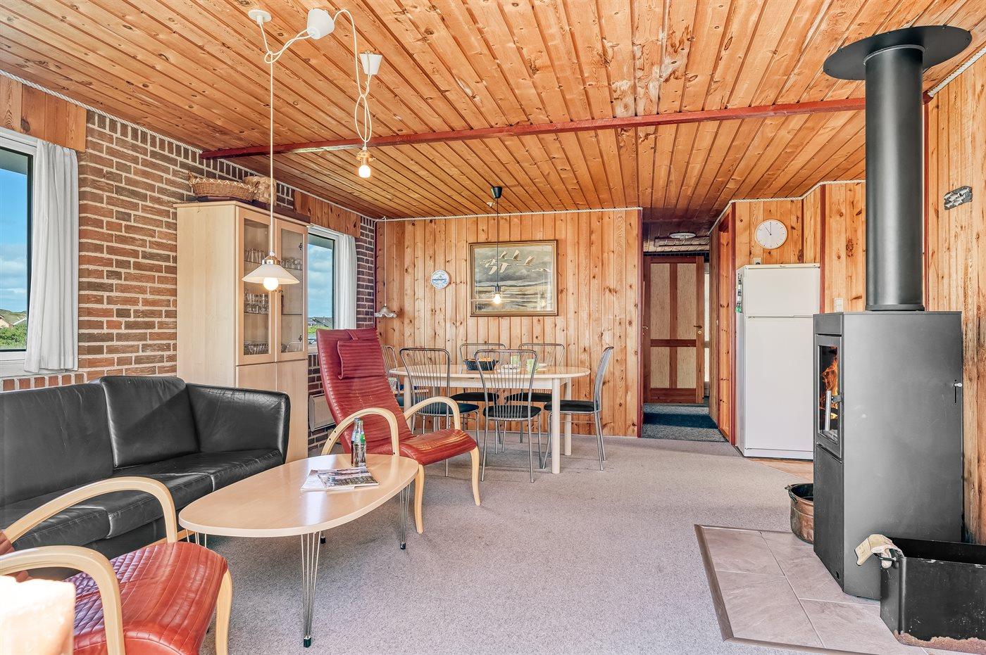 Dette sommerhus ligger i gåafstand til klitter og strand, og skal man en tur til Lemvig eller Thyborøn, kan man fordel tage områdets autentiske jernbane VLTJ, der kører i regn og blæst.