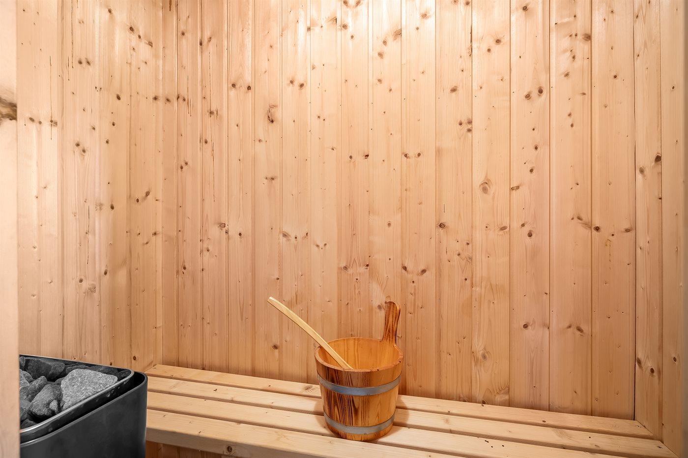 Der er 1 badeværelse med bruser og 1 toilet.. Der er gulvvarme på 1 badeværelse. I saunaen er der mulighed for afslapning.