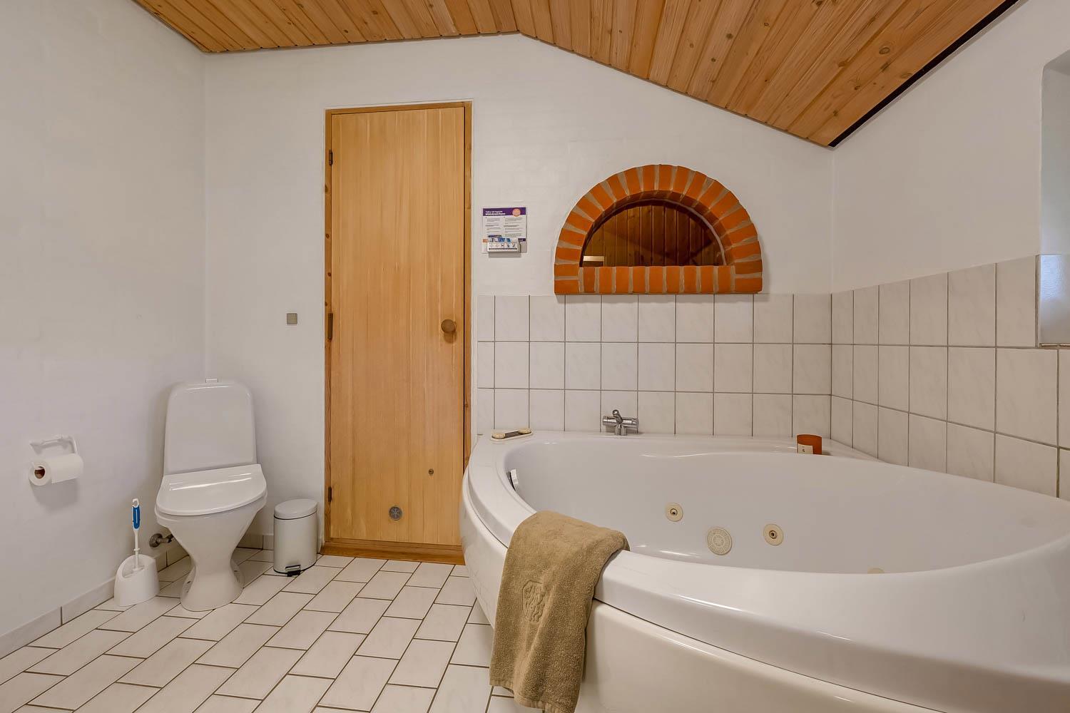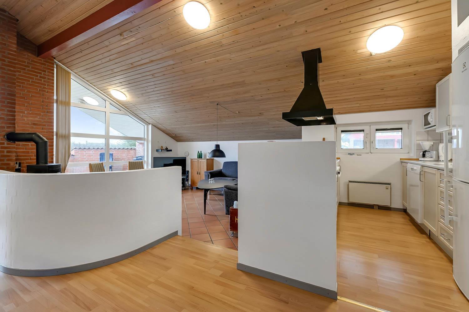 Komfortabelt indrettet feriehus i sten med nedsænket pejsestue med pæne møbler og inventar her der flisegulv. Stuen er indrettet med brændeovn og varmepumpe som begge kan give en behagelig varme og er med til at gøre jeres forbrug billigere, stereoanlæg med CD og TV med DR-kanalerne, der er desuden trådløst internet. Køkkenet som er kombineret med stuen, indeholder glaskeramisk komfur, emhætte, køleskab med 40 l. frostboks, mikroovn og opvaskemaskine. Gulv i køkken og stue er træ. 4 soverum: 1DS + 2S + 2S + 1DS. Huset har 2 badeværelser begge med toilet, håndvask og bruser. Det store badeværelse har desuden en spa og adgang til sauna. Begge badeværelser har klinkegulv og gulvvarme. Til de mindste gæster er der en barnestol. I depotrummet er der vaskemaskine og tørretumbler. Ikke rygerhus. 2 velopdragne husdyr er tilladt. Adgang til Harboøre-Centeret www.harbooere.dk/hallen