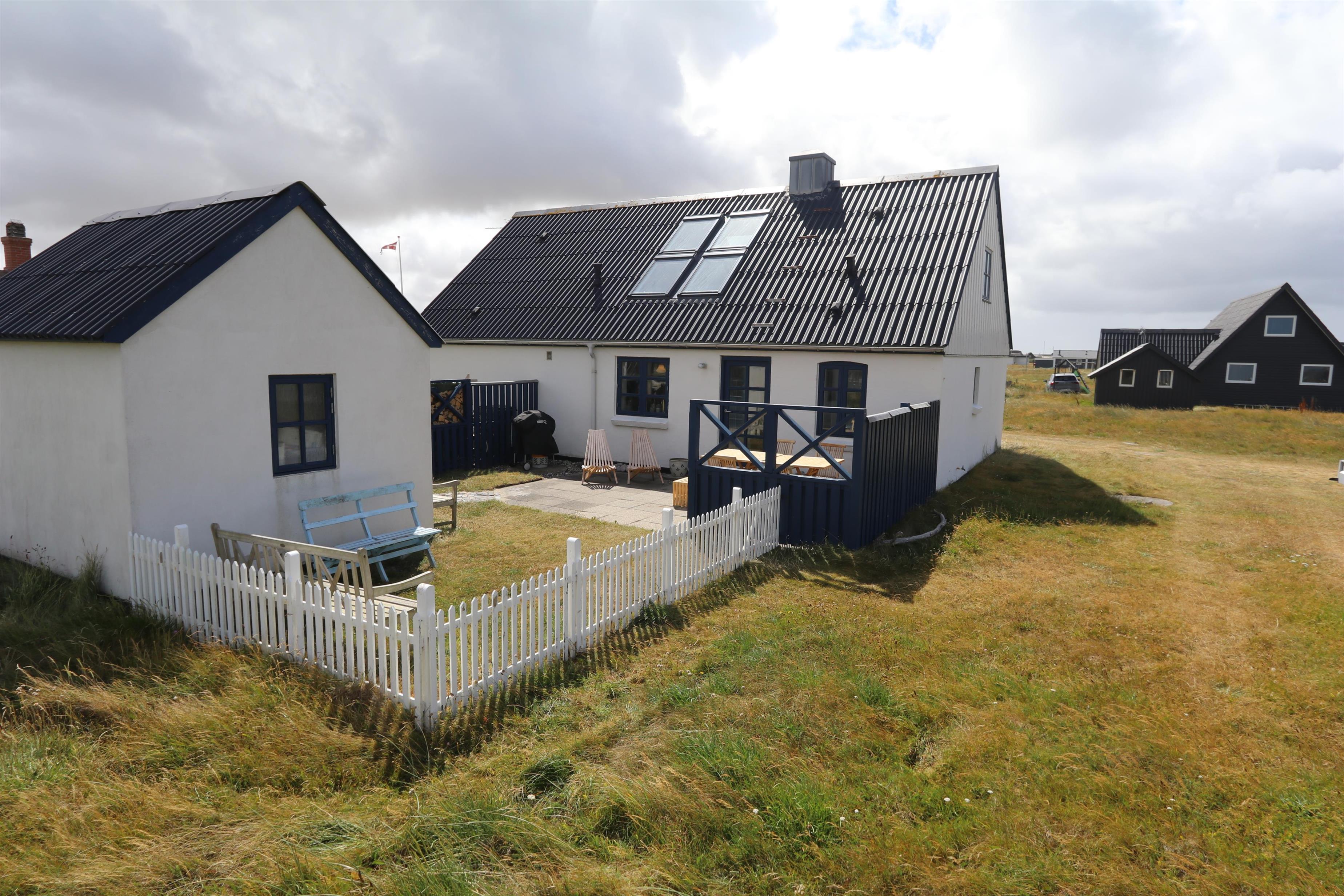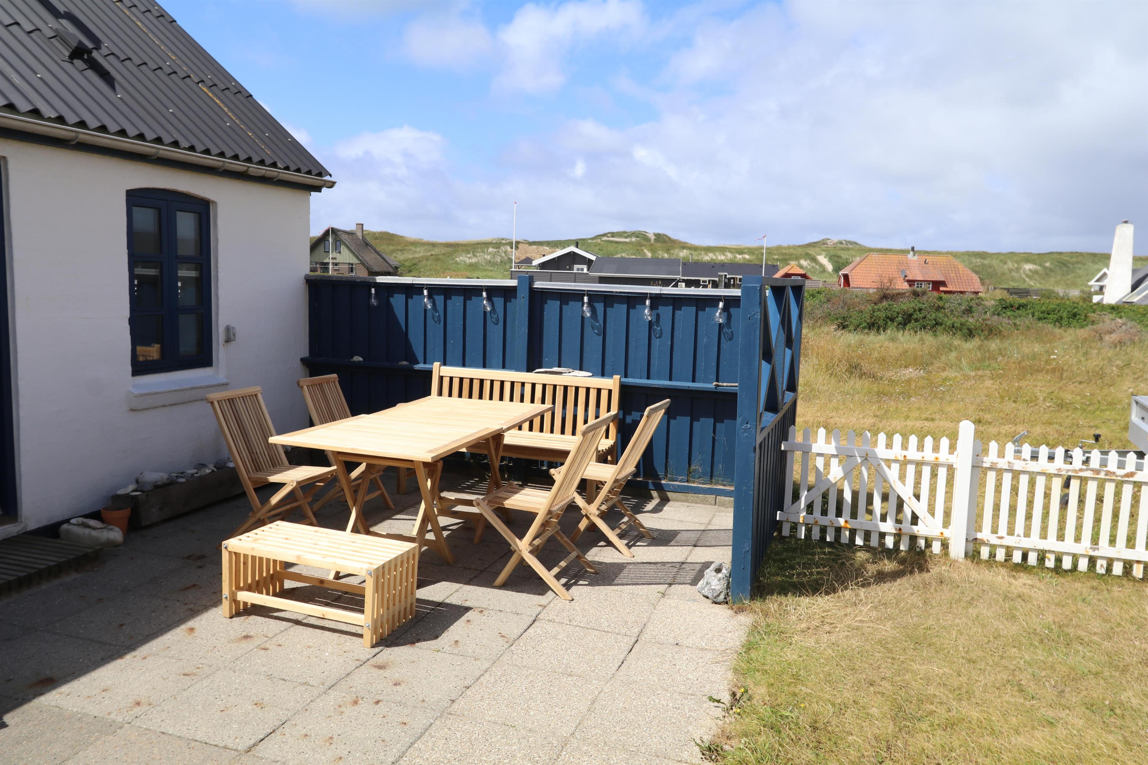 Feriehuset er beliggende på en 1.387 m2 stor naturgrund kun 250 meter fra Vesterhavet. Dejligt indhegnet solgård med havemøbler og gas grill. Nyd den helt unikke mulighed det er at sidde og høre Vesterhavet lige på den anden side af klitterne, Der er også rig mulighed for at nyde solen, hinanden eller en god grillaften. Gå en tur i det rolige feriehusområde, henover de høje klitter og straks derefter åbenbarer Vesterhavet sig. Hver dag byder Vesterhavet på nye maleriske oplevelse, der invitere til en frisk gå- eller løbetur. Eller hvad med en lille tur på ca. 10 - 15 min op til områdets lille købmand, som i sæsonen har åbent og byder på frisk morgenbrød og hvor de daglige indkøb også kan klares. Så hvad enten du er til aktiv ferie eller total afslapning danner dette autentiske feriehus den perfekte ramme både hvad angår hus, beliggenhed og omgivelser. Indenfor kort køreafstand nås både den aktive handelsby i Lemvig med flere specialbutikker eller den unikke fiskerby Thyborøn, som udover den aktive fiskerihavn også byder på badestrand og op til flere aktivitetstilbud, som alle er et besøg værd.