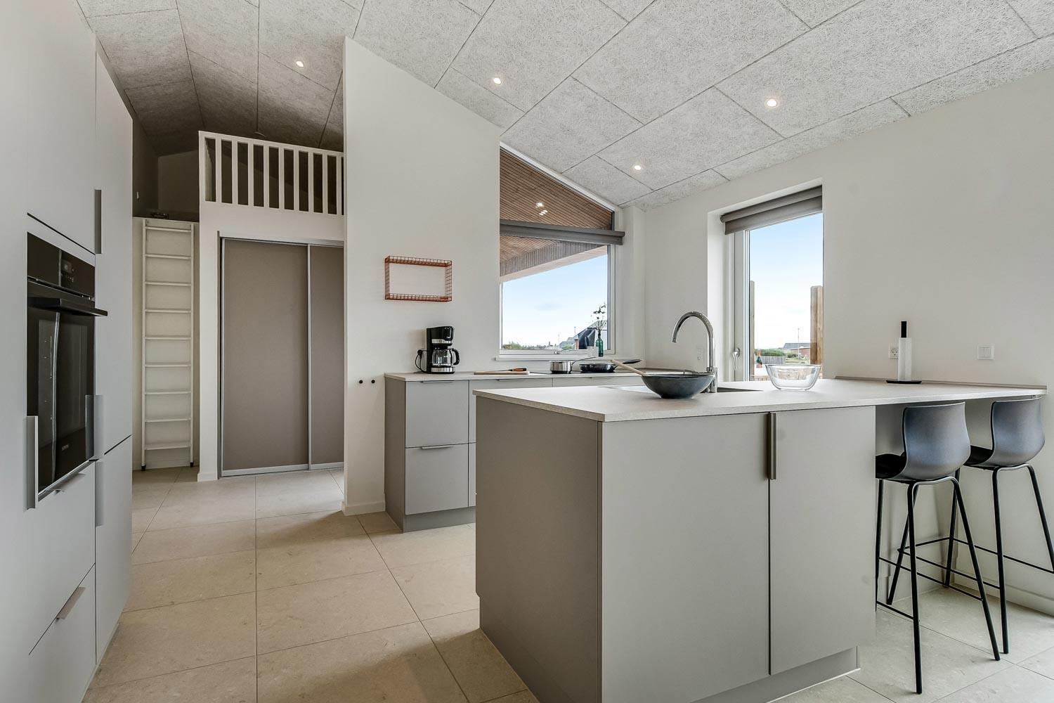 Køkkenet er moderne og funktionelt med ovn, keramisk komfur, mikroovn, kaffemaskine og køle-/fryseskab – alt, hvad I har brug for til feriens måltider.