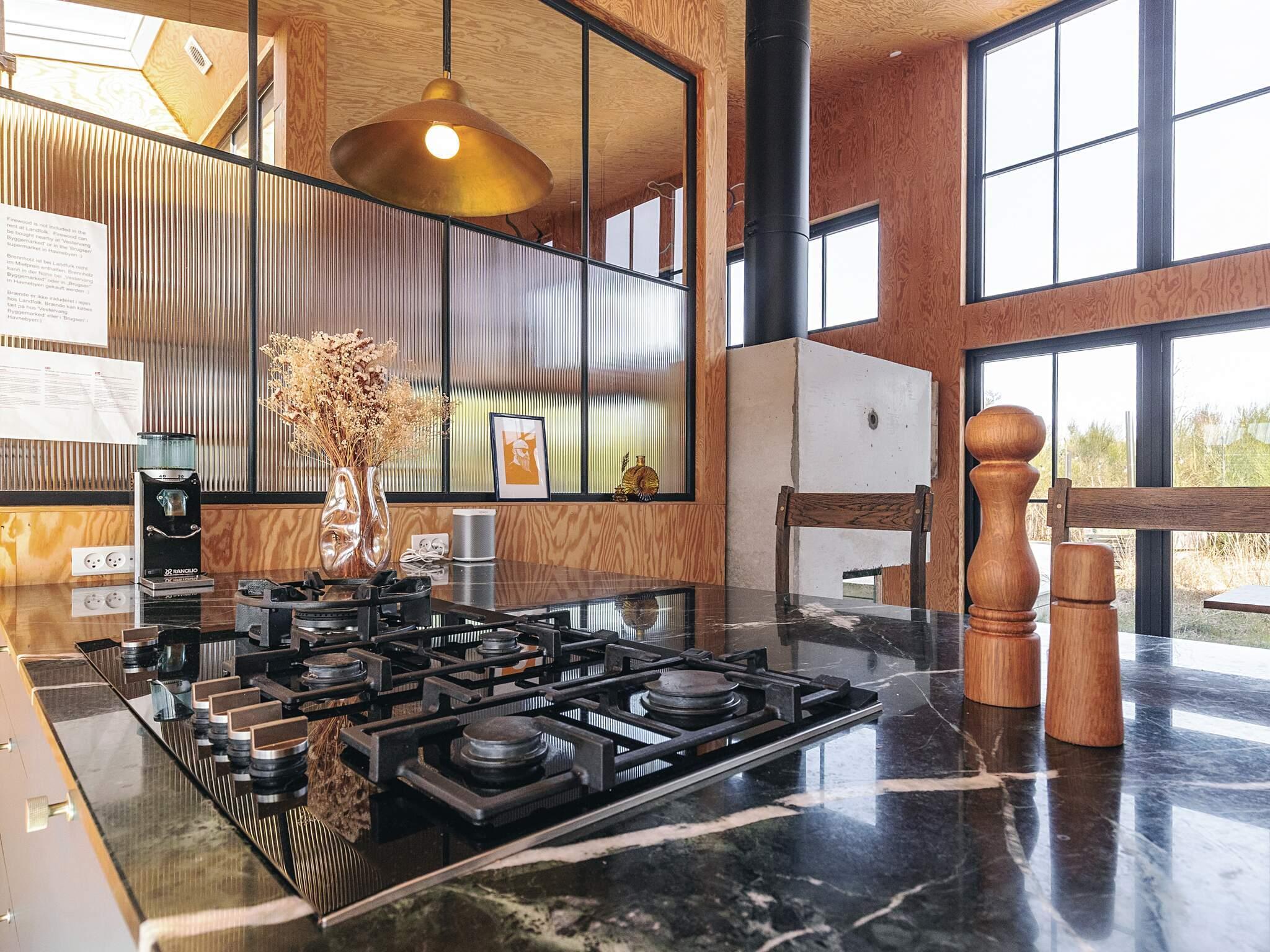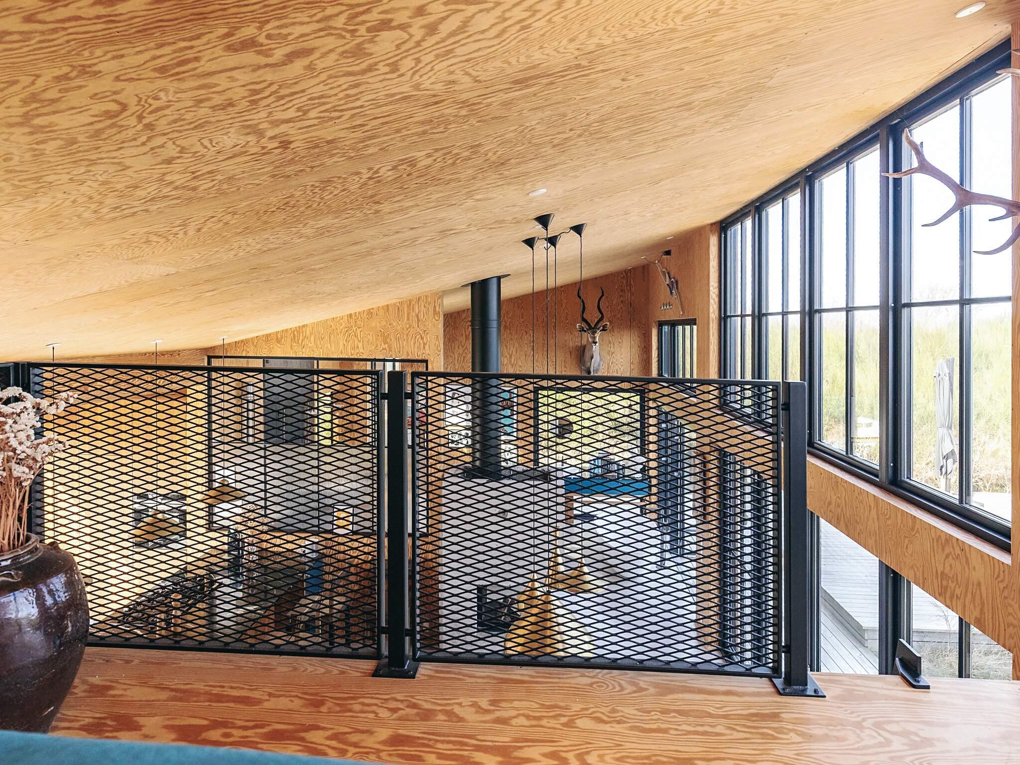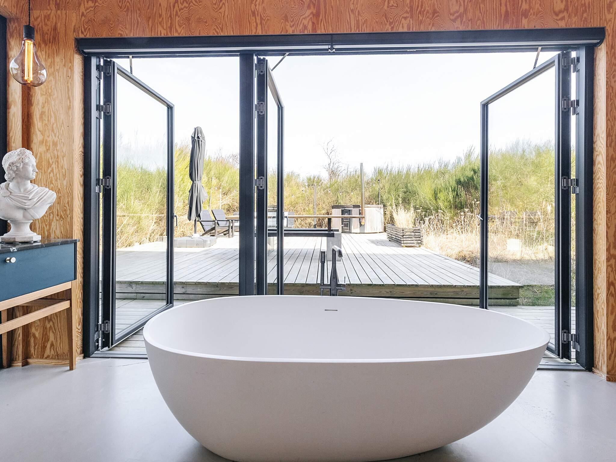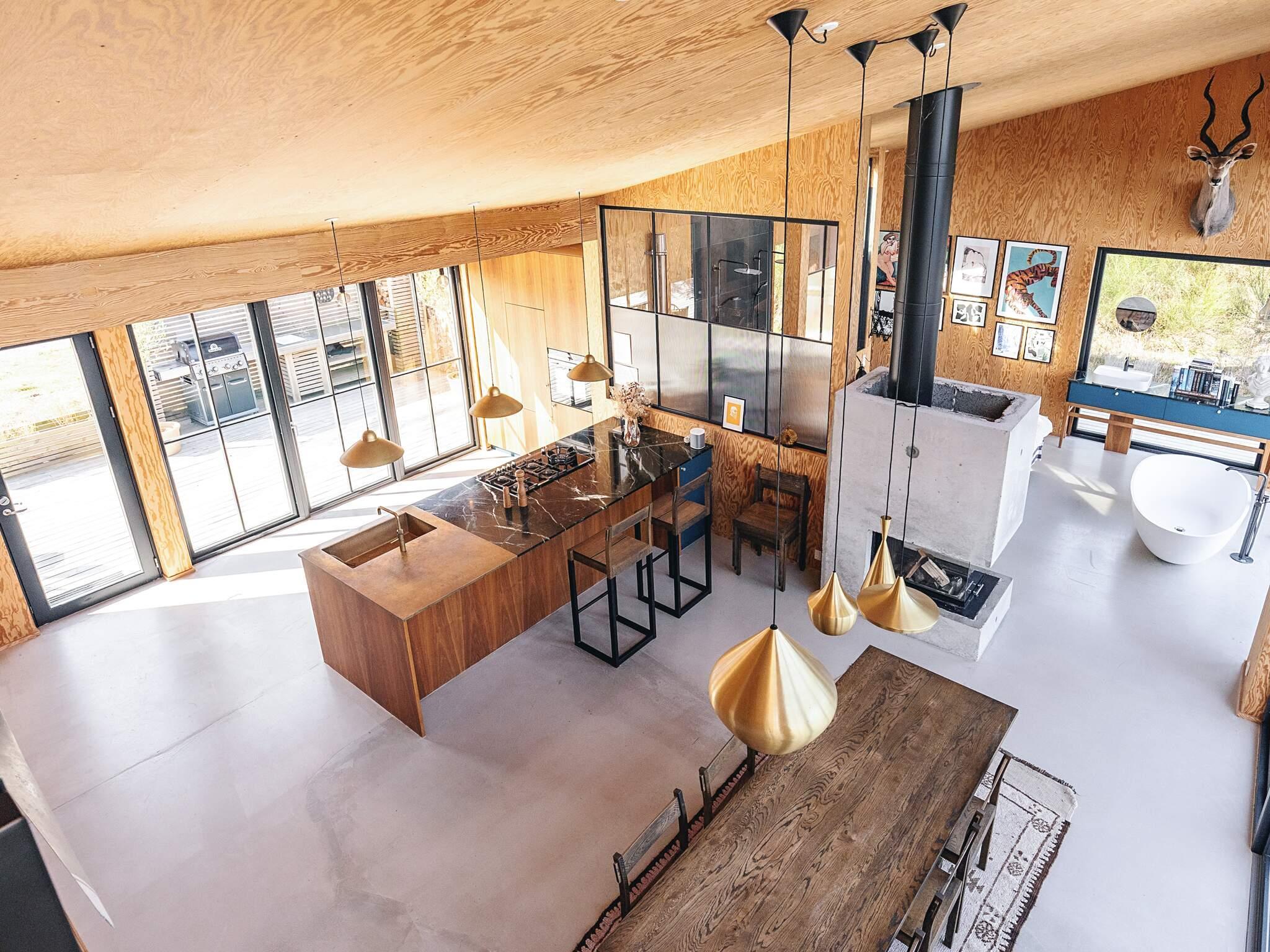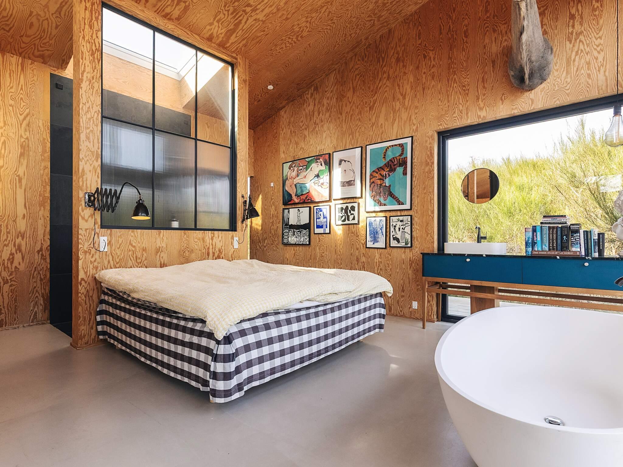 Husets hjerte er centreret omkring den stilrene, 3-sidede pejseindsats. Her hersker en klassisk New York-stemning med store fabriksvinduer, der giver et fantastisk lysindfald og et særligt robust udtryk. Nyd den smukke udsigt over Kattegat fra den store dobbeltseng på loftet med en god podcast i ørerne, eller brug en stille stund i badekarret i soveværelset med dørene åbne til haven. Hele huset emmer af eksklusivitet med detaljer i marmor, gyldne farver og krydsfinerbeklædte vægge og lofter.