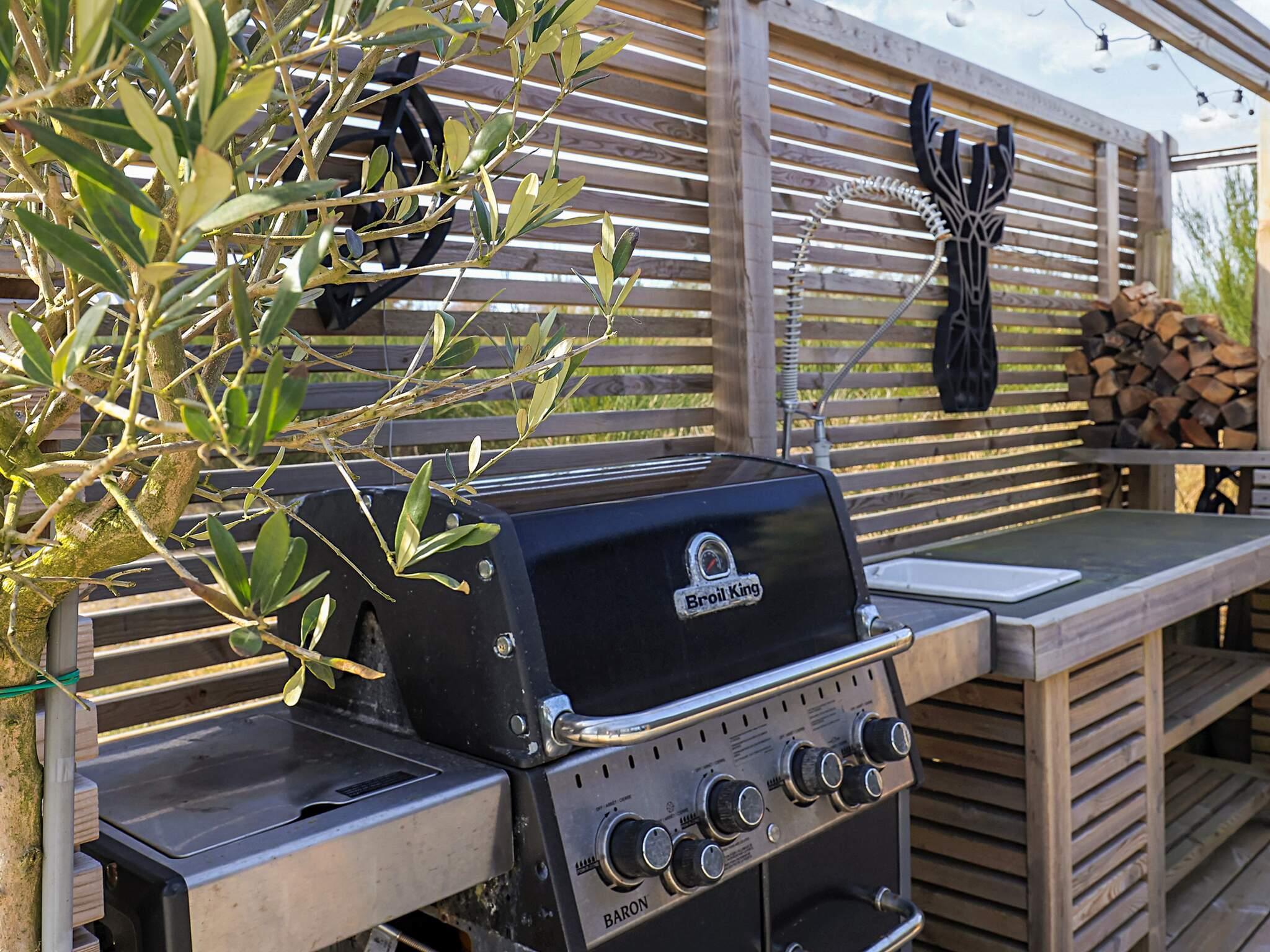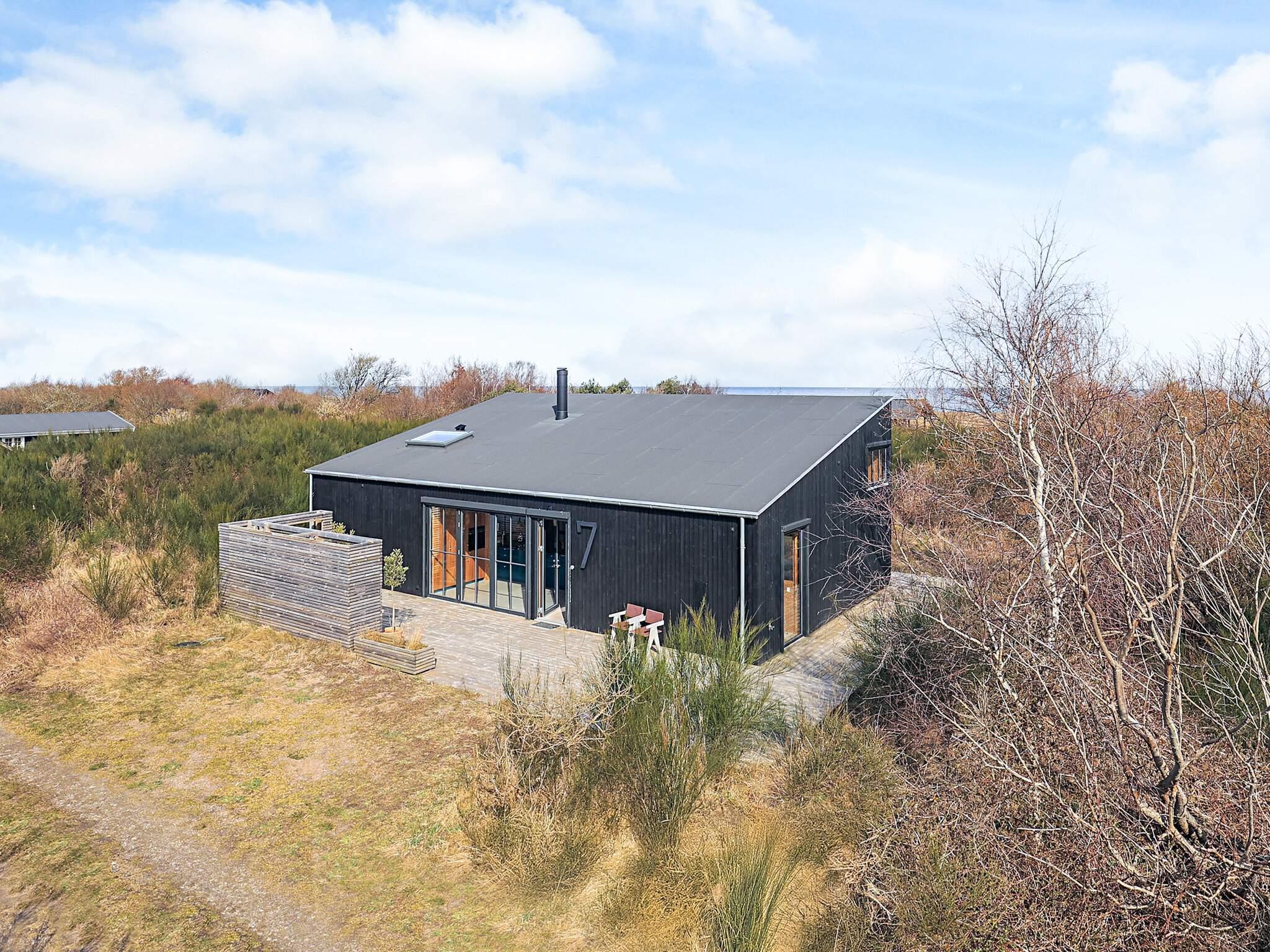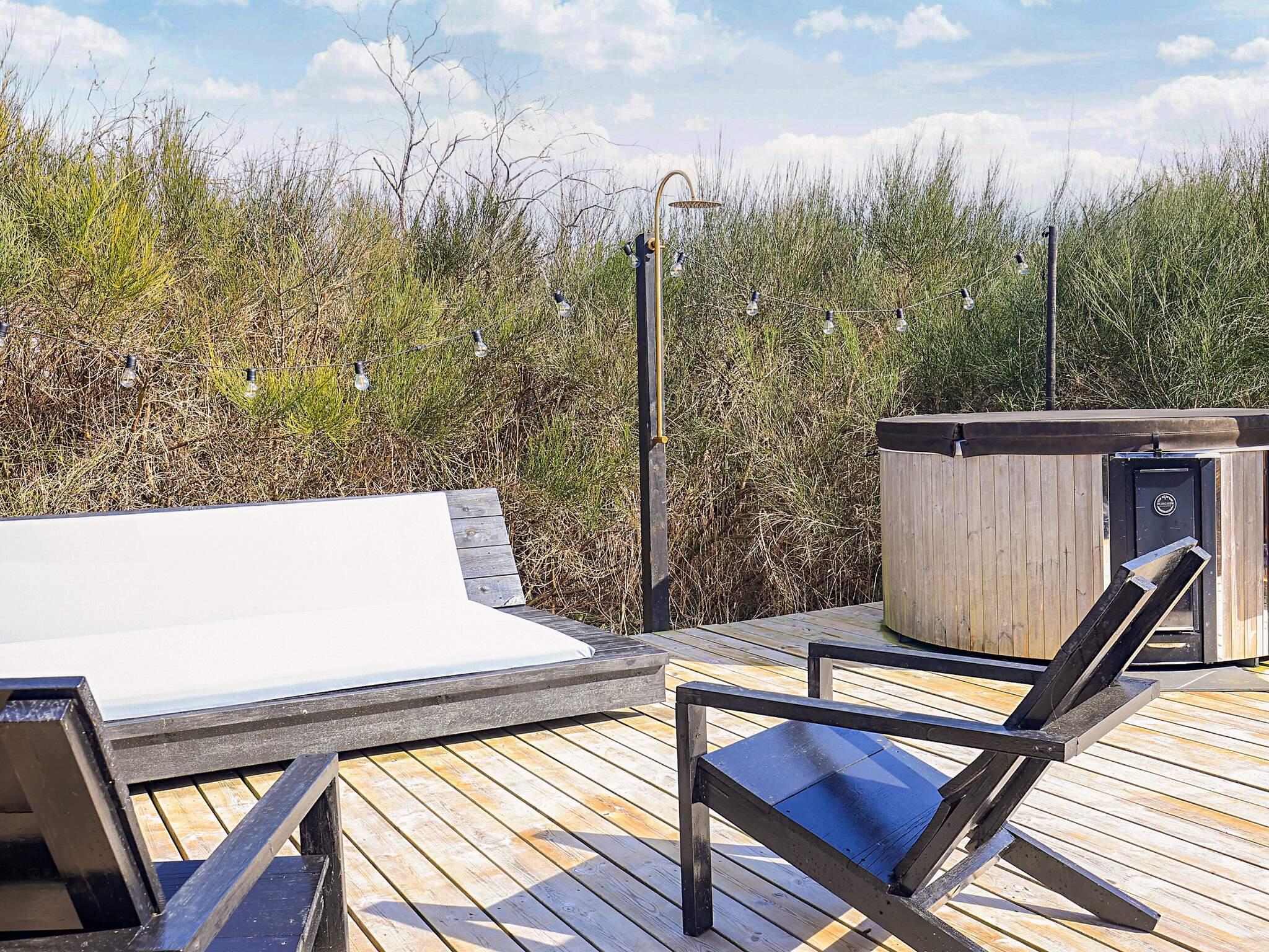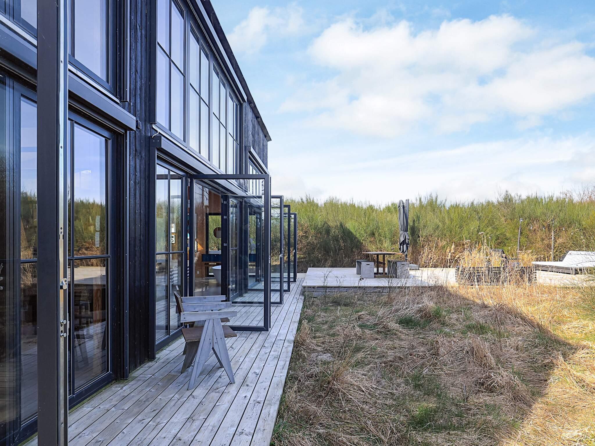 Udenfor finder I den skønne, solrige træterrasse, der snor sig rundt om huset. Tilbered en skøn middag på grillen under åben himmel i det lækre udekøkken eller nyd de lange sommeraftener i spabadet. Der er også plads på terrassen til at tænde et hyggeligt bål, mens en smuk solnedgang sætter aftenhimlen i brand.