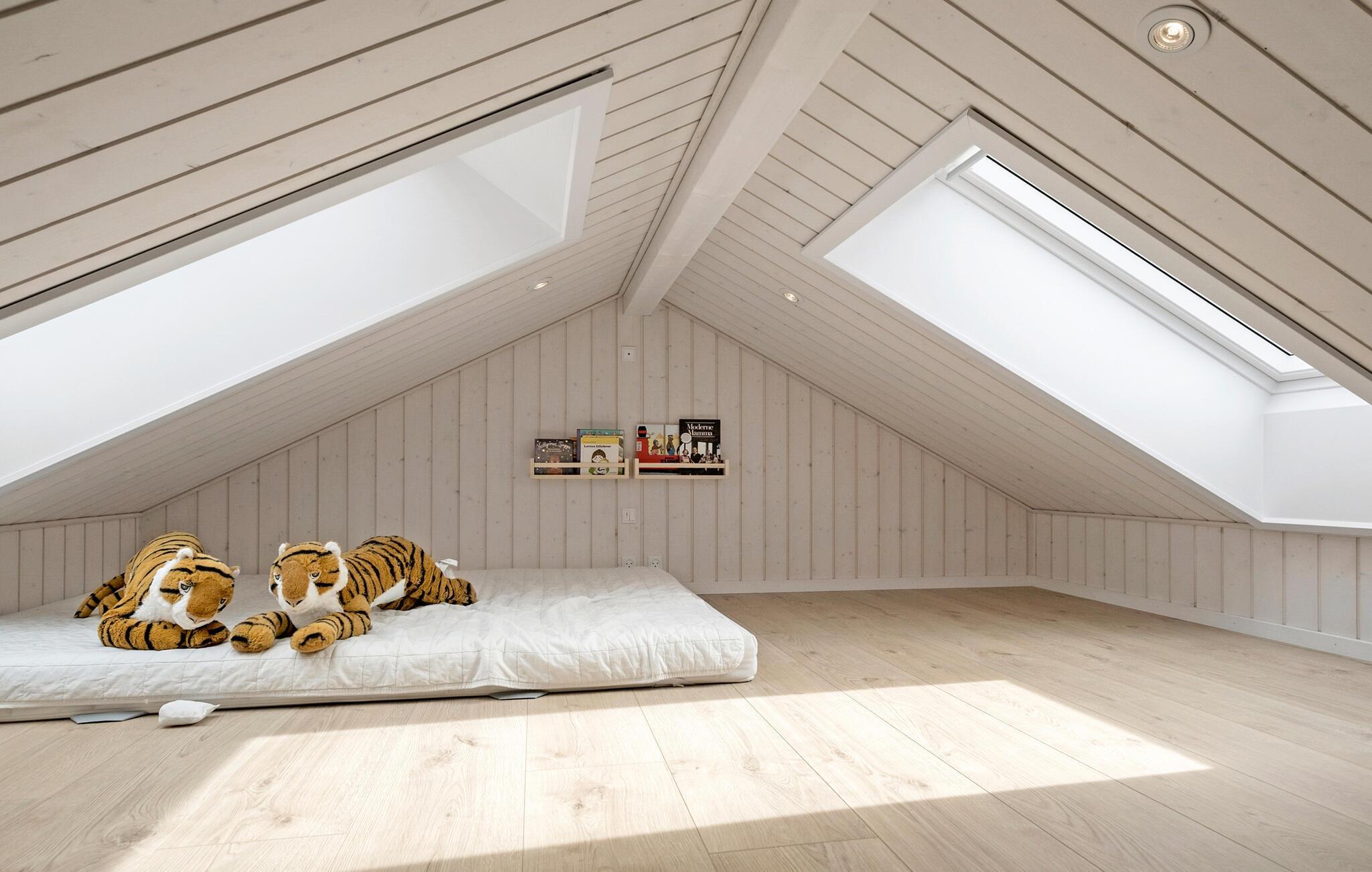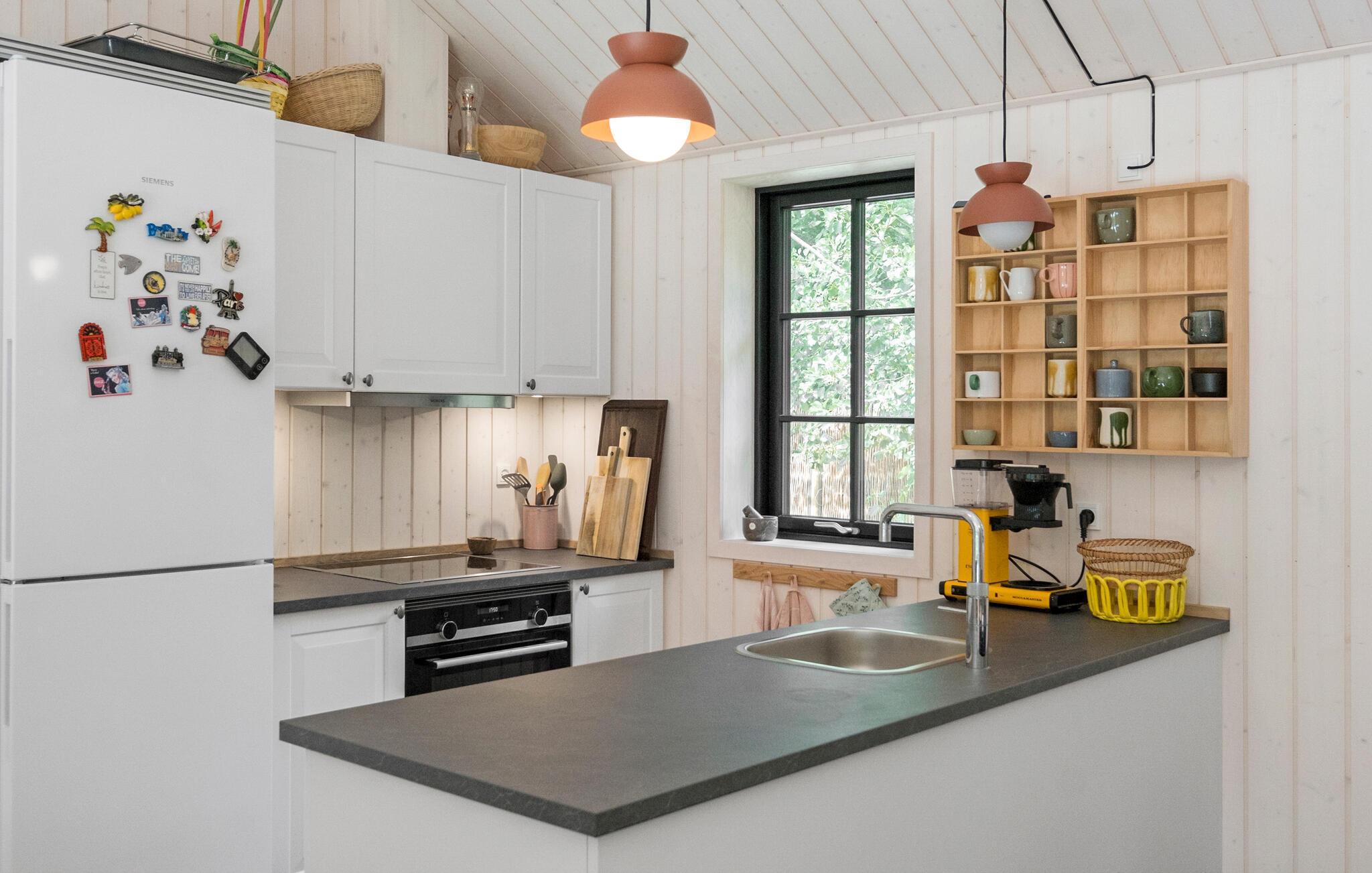I dette moderne og hyggelige sommerhus med hems og åbent køkkenalrum. I sofahjørnet kan I tænde op i brændeovnen og slappe af efter en lang dag med ferieoplevelser. Aftensmaden kan I enten forberede i det veludstyrede køkken eller ude på grillen på terrassen. Herude kan spise under parasollen og nyde solen på liggestolende. Imens kan børnene hygge sig i haven med boldspil, gynge og rutchebane. I kan slutte aftenen af med skumfiduser eller pølser over bålfadet. Hvis vejret er til det, kan I redde op til at sove udenfor under træerne i shelteret.