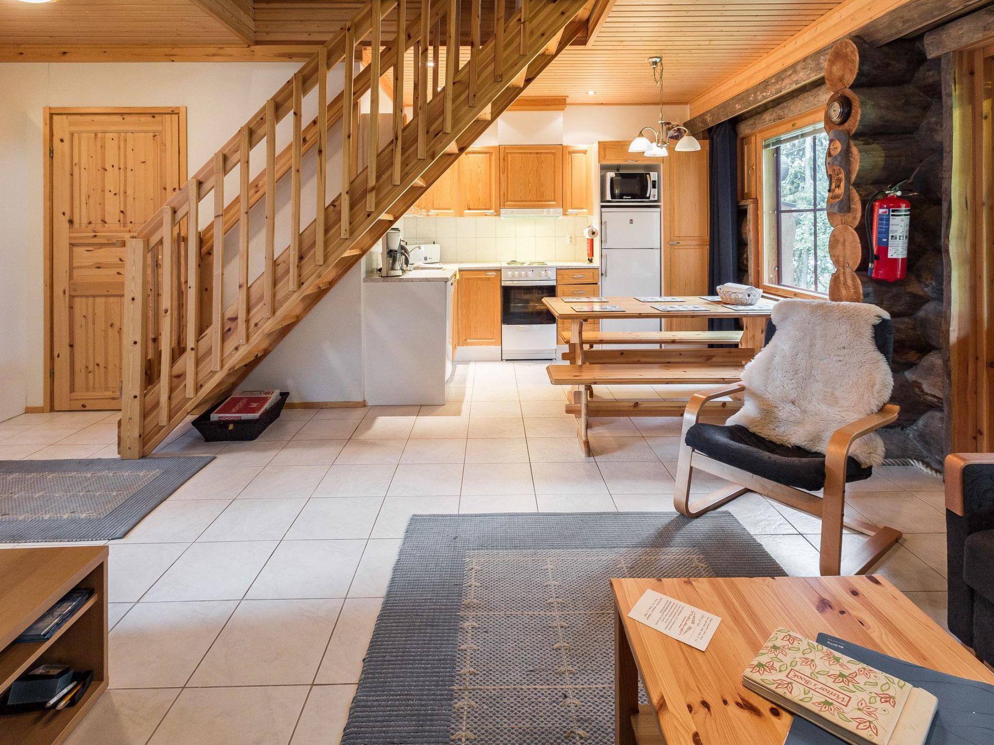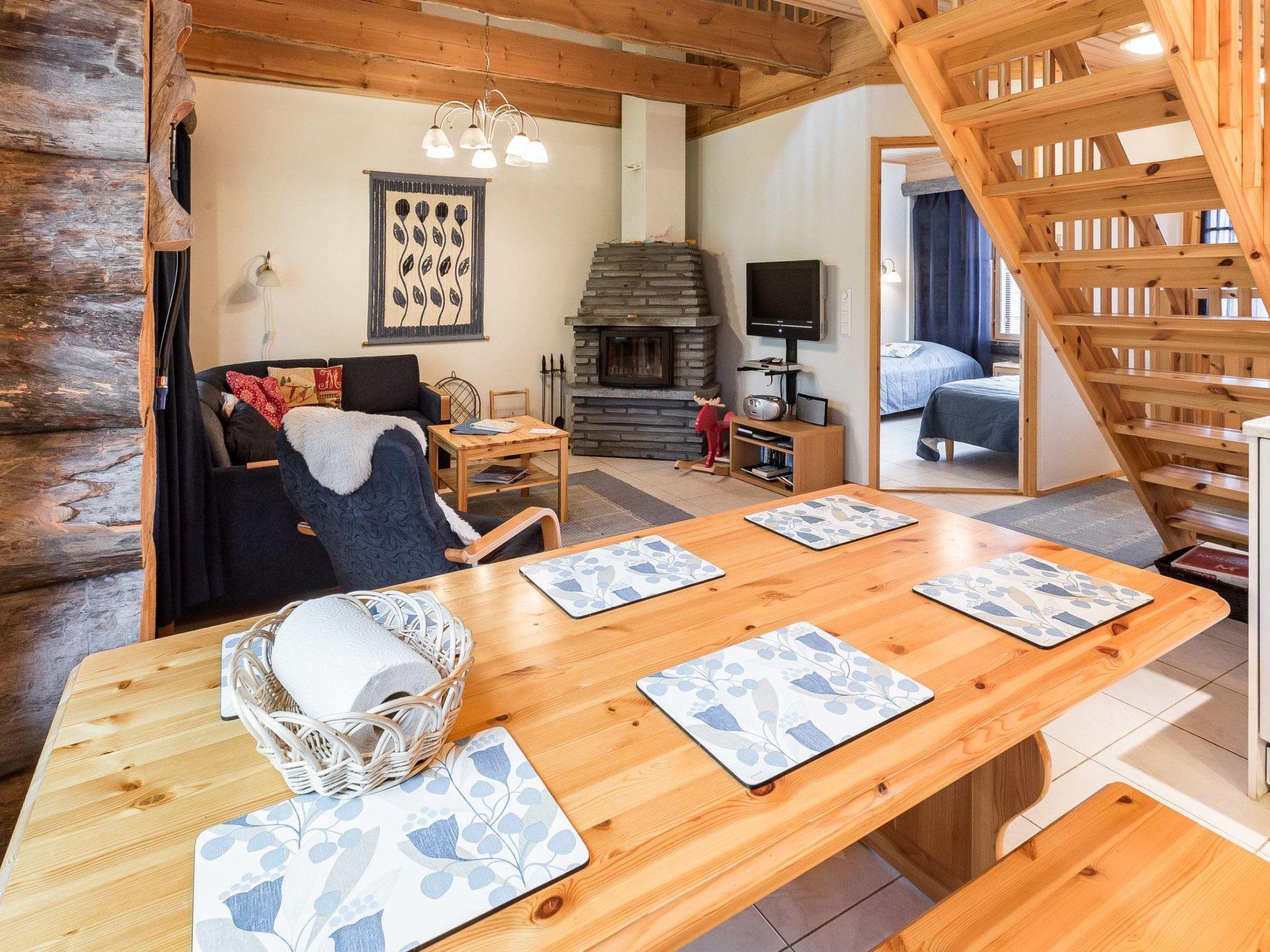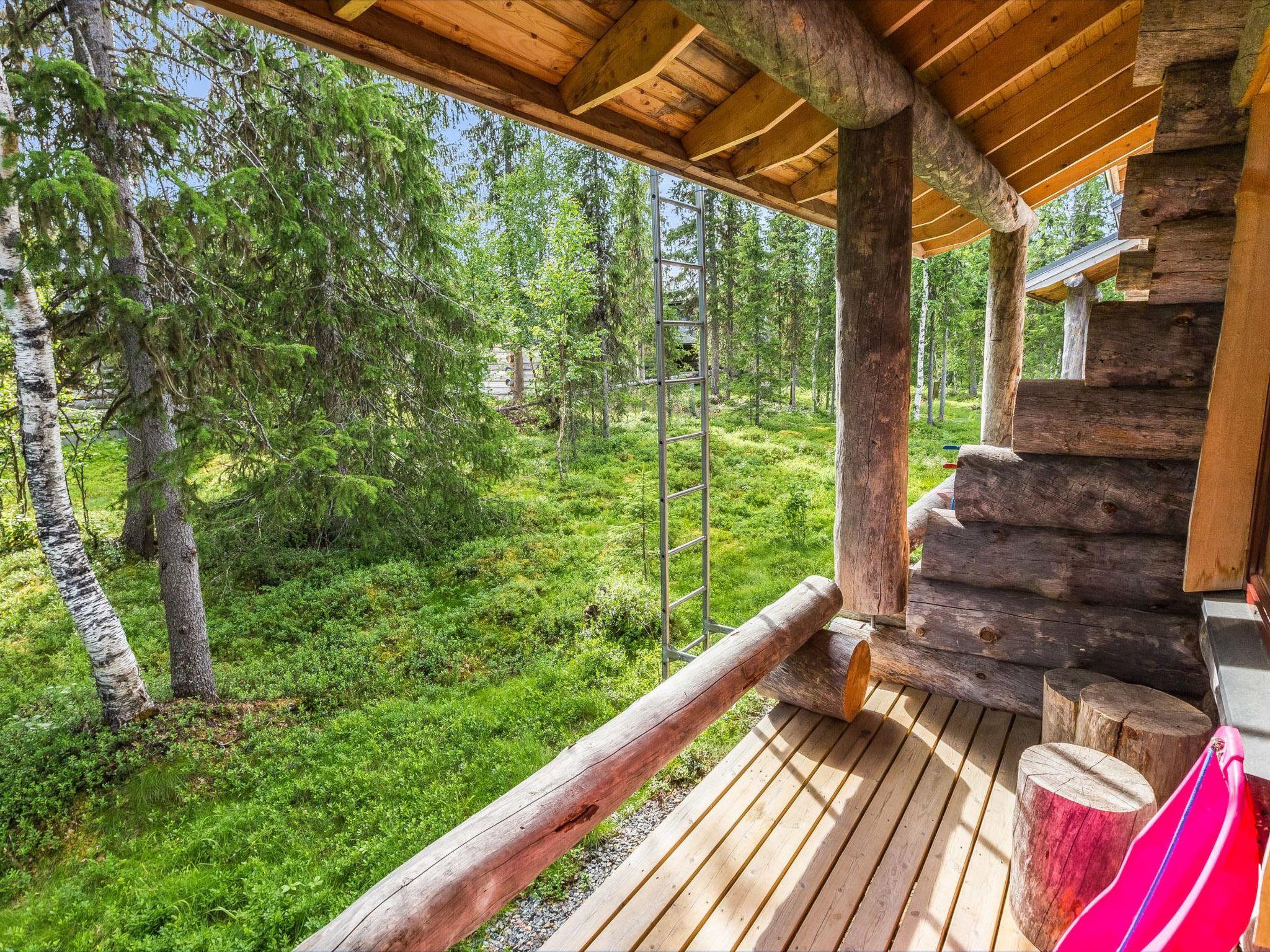 40 km north of Kolari, Lake Äkäslompolojärvi 1 km, swimming shore 2.5 km. Silverlog row house apartment 2008. Area 53 m² of which 11 m² on the loft. Living room/kitchen, 1 bedroom, both with 2 separate beds, in sleeping loft 2 separate beds, in living room/kitchen also convertible sofa/bed, sauna (electric stove), washroom/WC, sleeping loft has separate WC. The apartments share a ski maintenance room in the yard.