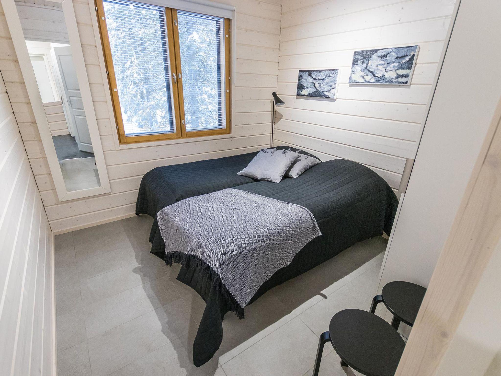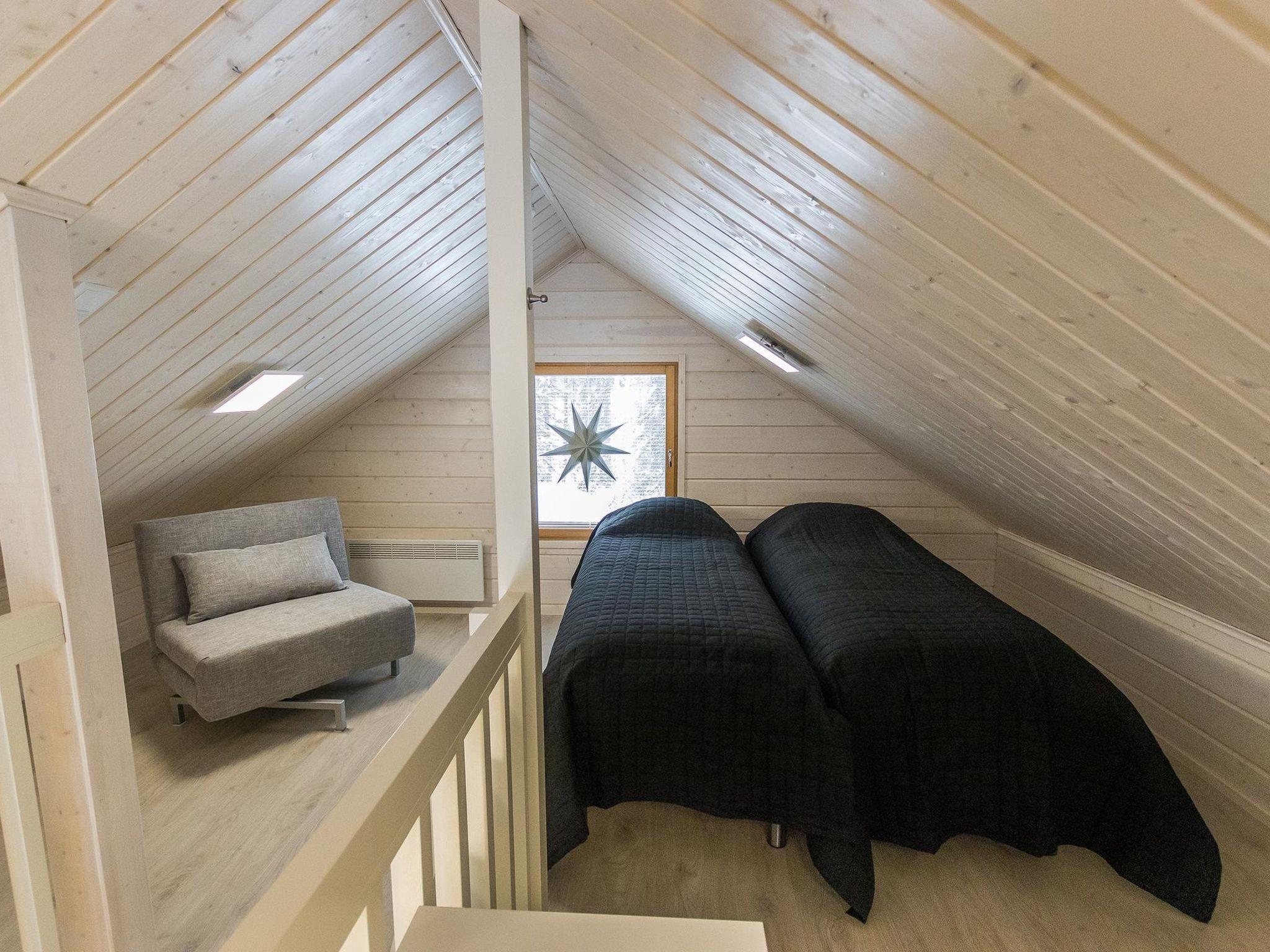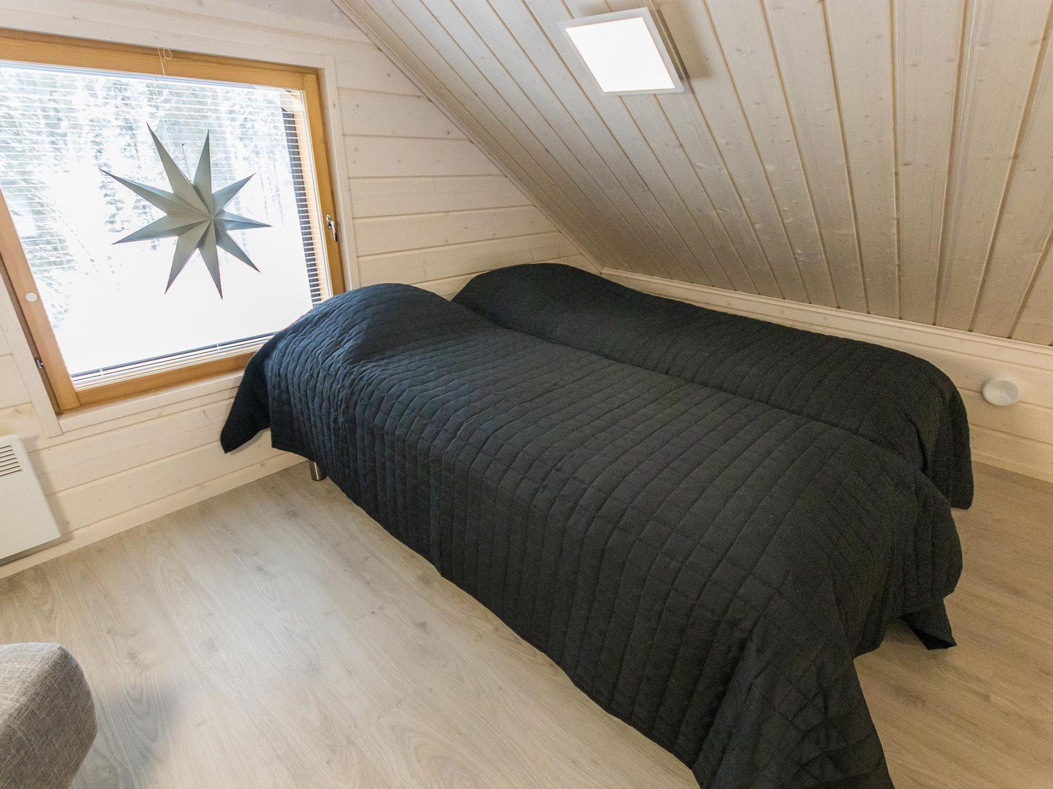 40 km north of Kolari, lake Äkäslompolo 1,5 km, swimming beach about 2 km. Separate wooden house, built in 2021. Livingroom/kitchen, two bedrooms, one with two separate beds and other with a double bed, loft with 2 separate beds and 2 lounge chairs that fold into beds, electric sauna, shower, 2 toilets, one in the shower room.