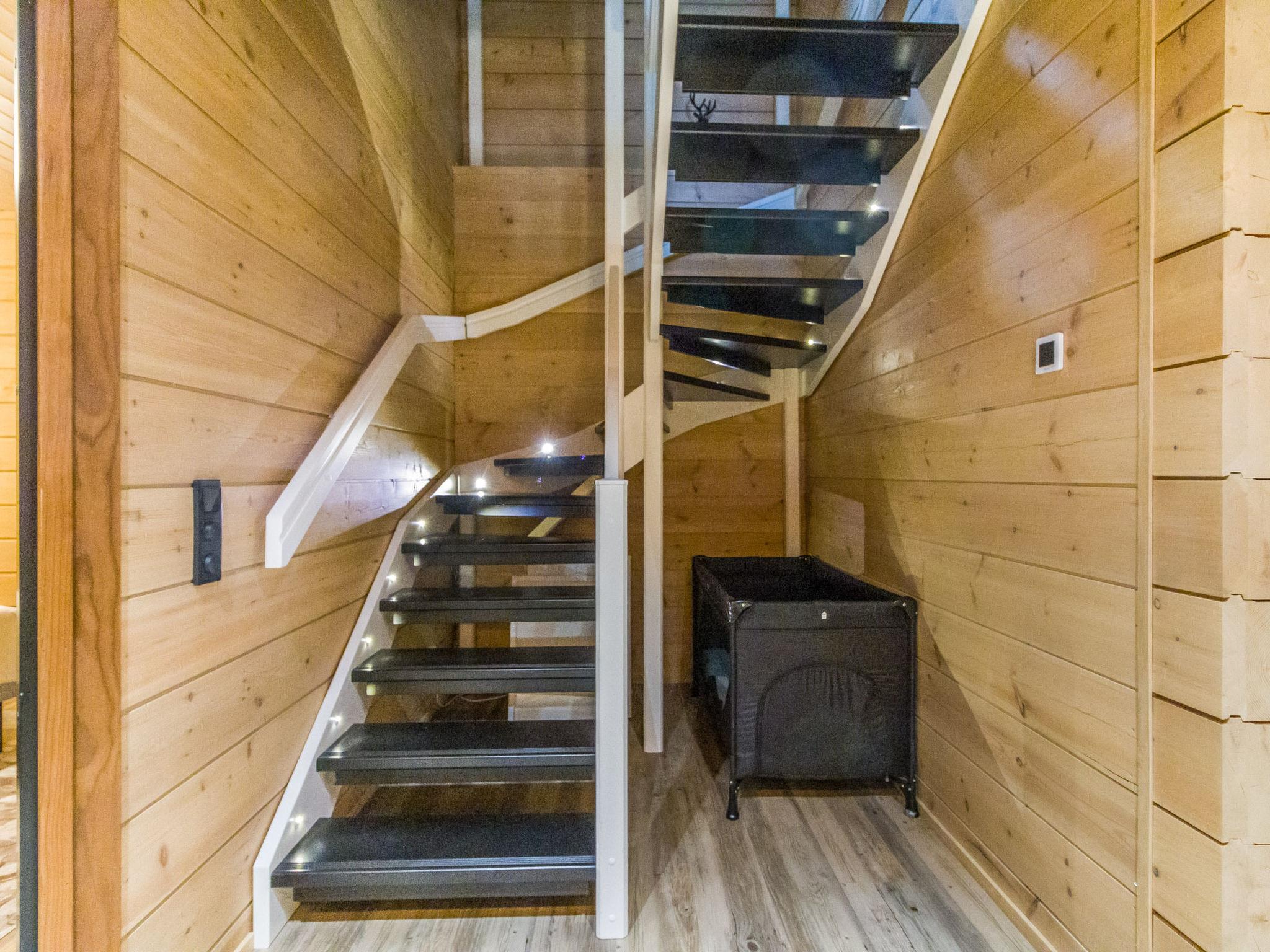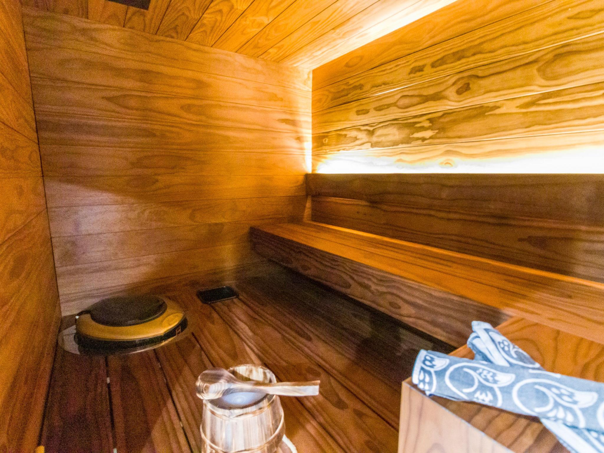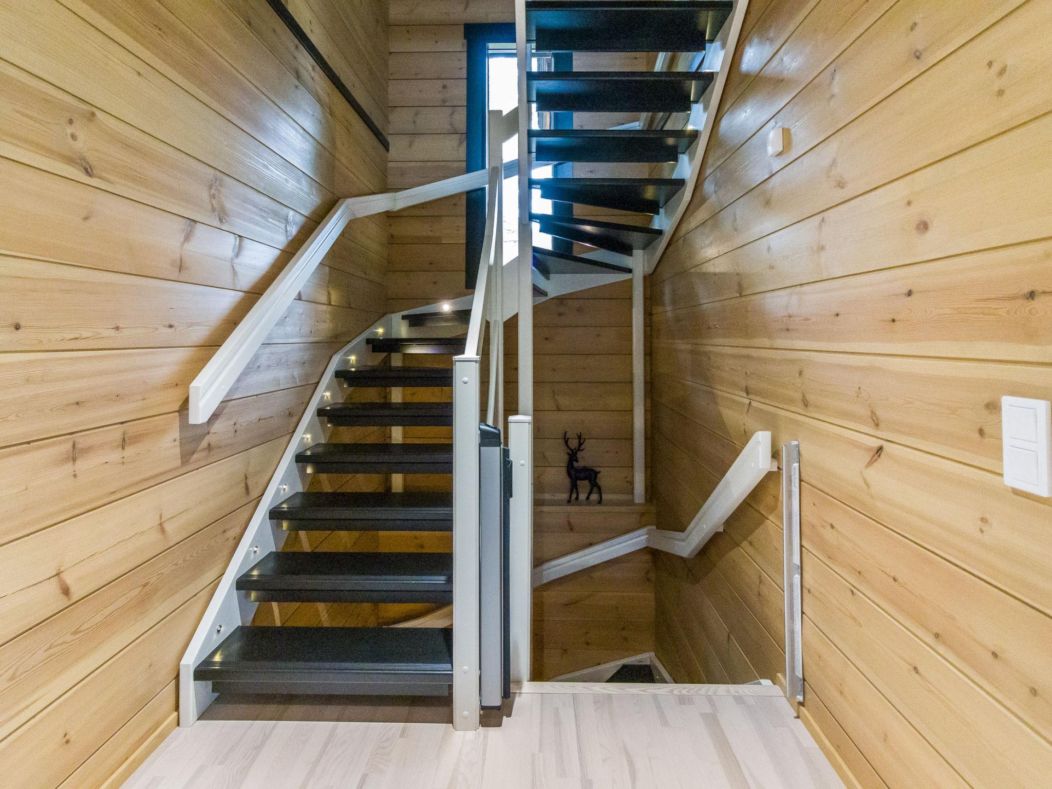 The ground floor of this three-story villa has a spacious living area with an atmospheric electric fireplace. The ground floor has one bedroom with 2 beds (width 80 cm) and washing facilities; an electric sauna with an always-ready stove and a high-quality bathroom with two showers and a hydro massage bath. In addition, there is a dressing room, separate toilet, and a covered terrace. There is also a ski maintenance room on the ground floor.