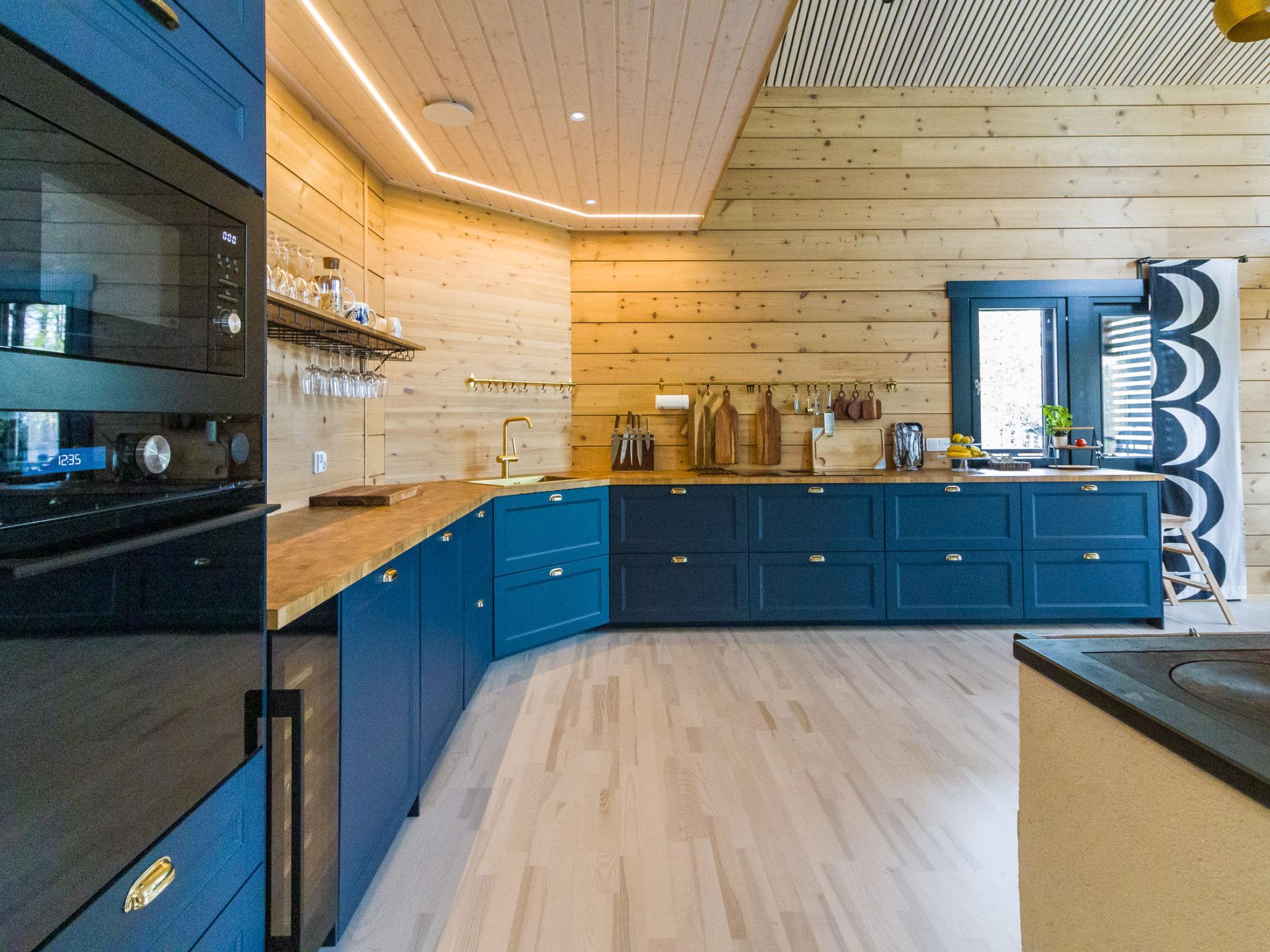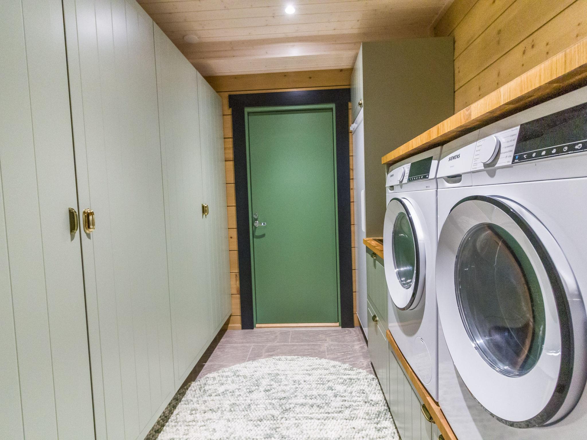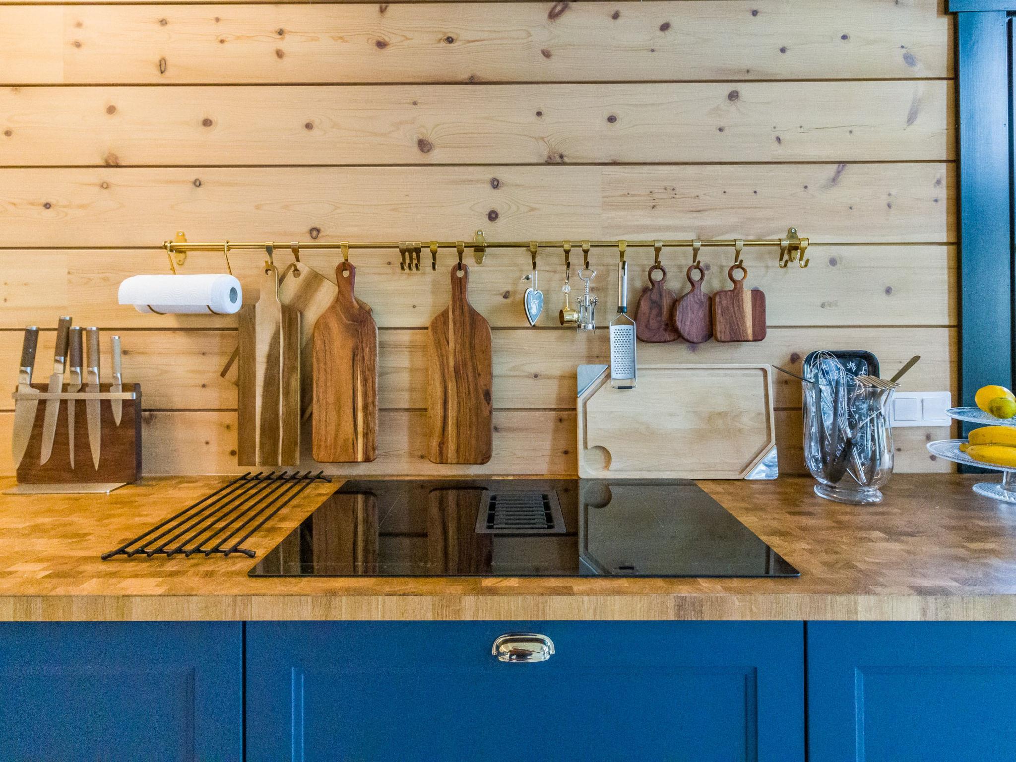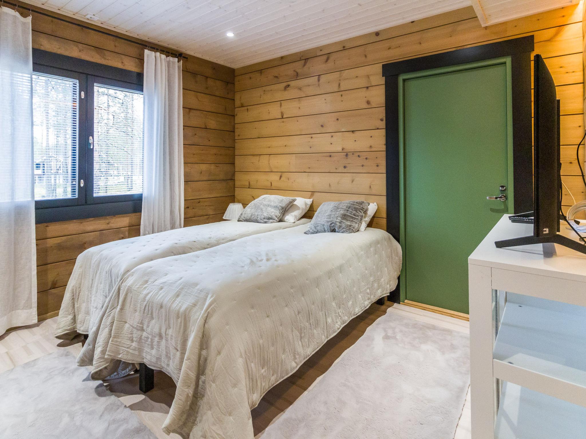 The ground floor of this three-story villa has a spacious living area with an atmospheric electric fireplace. The ground floor has one bedroom with 2 beds (width 80 cm) and washing facilities; an electric sauna with an always-ready stove and a high-quality bathroom with two showers and a hydro massage bath. In addition, there is a dressing room, separate toilet, and a covered terrace. There is also a ski maintenance room on the ground floor.