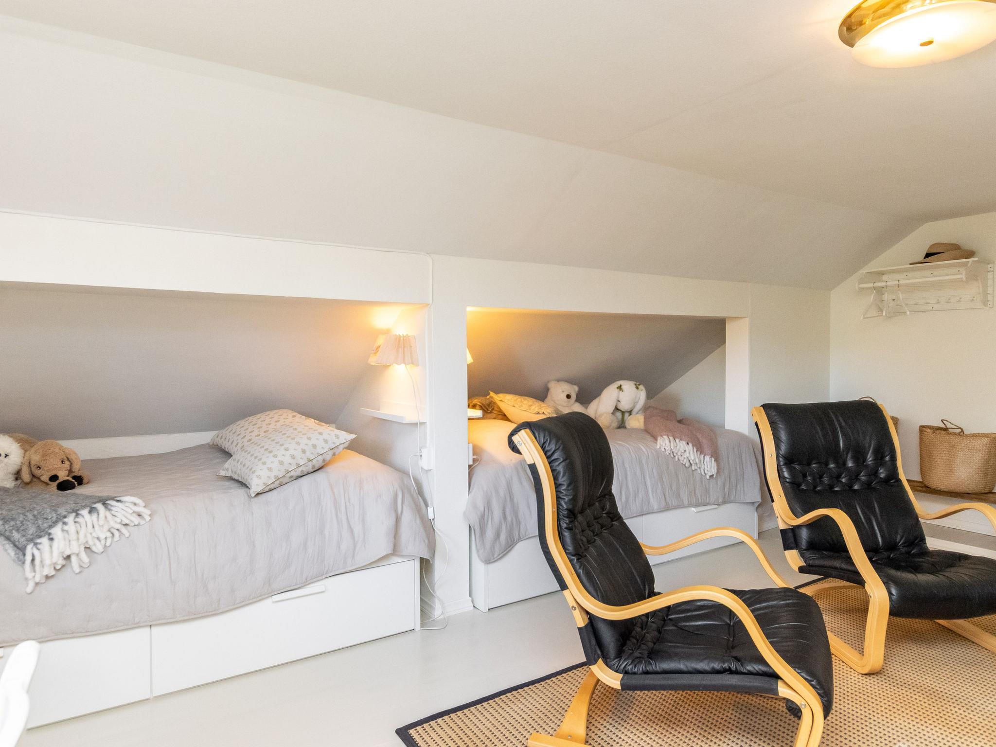 Upstairs, hall/bedroom with two 140 cm double beds, passage to another bedroom with a double bed, balcony.