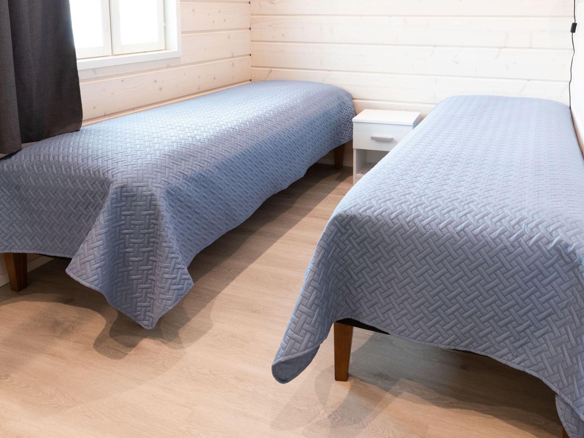 Wooden villa, built in 2022. Living room/kitchen, two bedrooms, both with two beds, sauna, washroom/WC, utility room, separate WC and covered terrace.