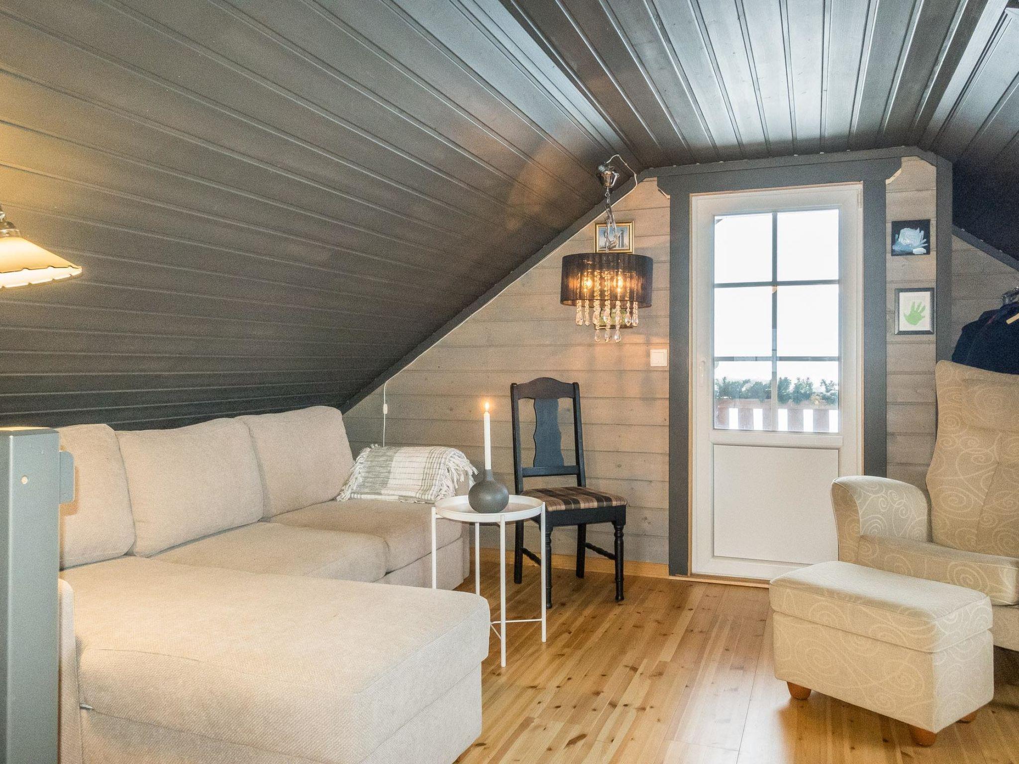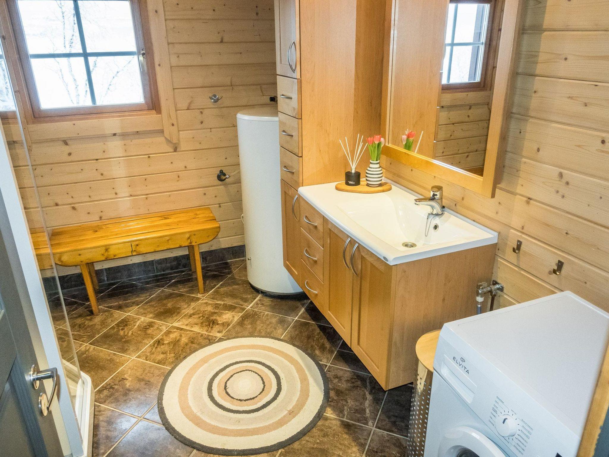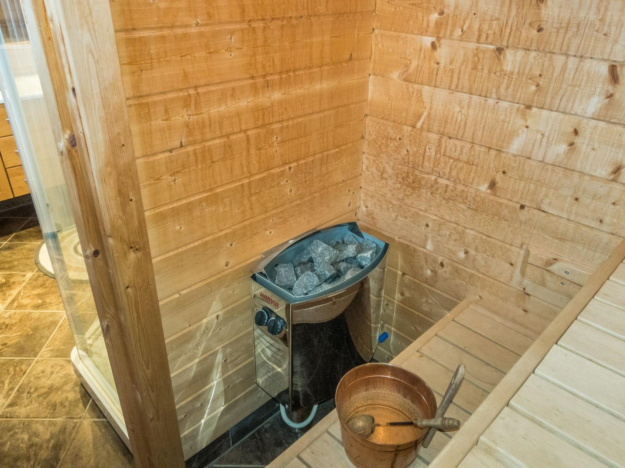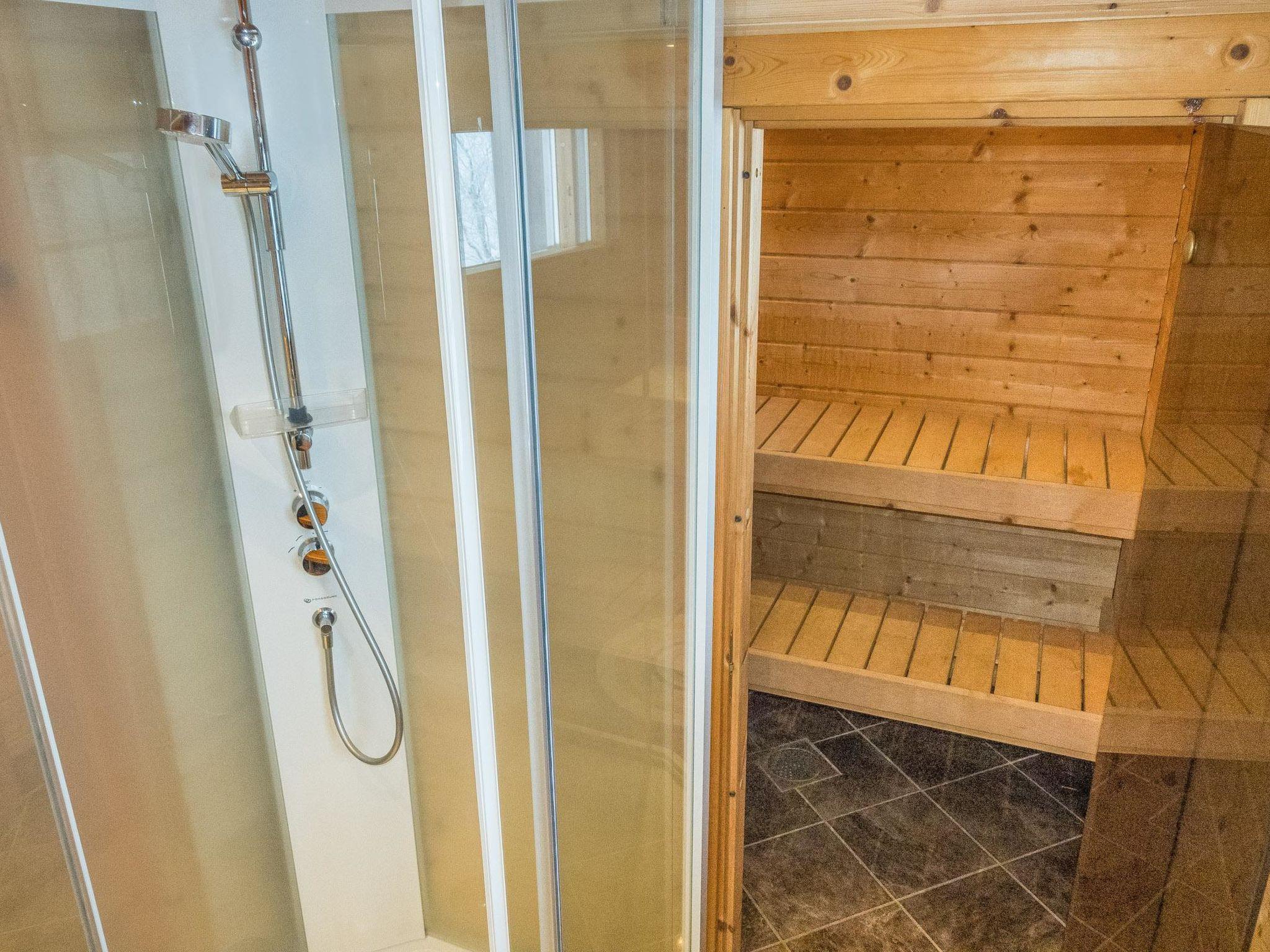 On the ground floor, living room/kitchen, bedroom with double bed, sauna, washroom, separate WC.