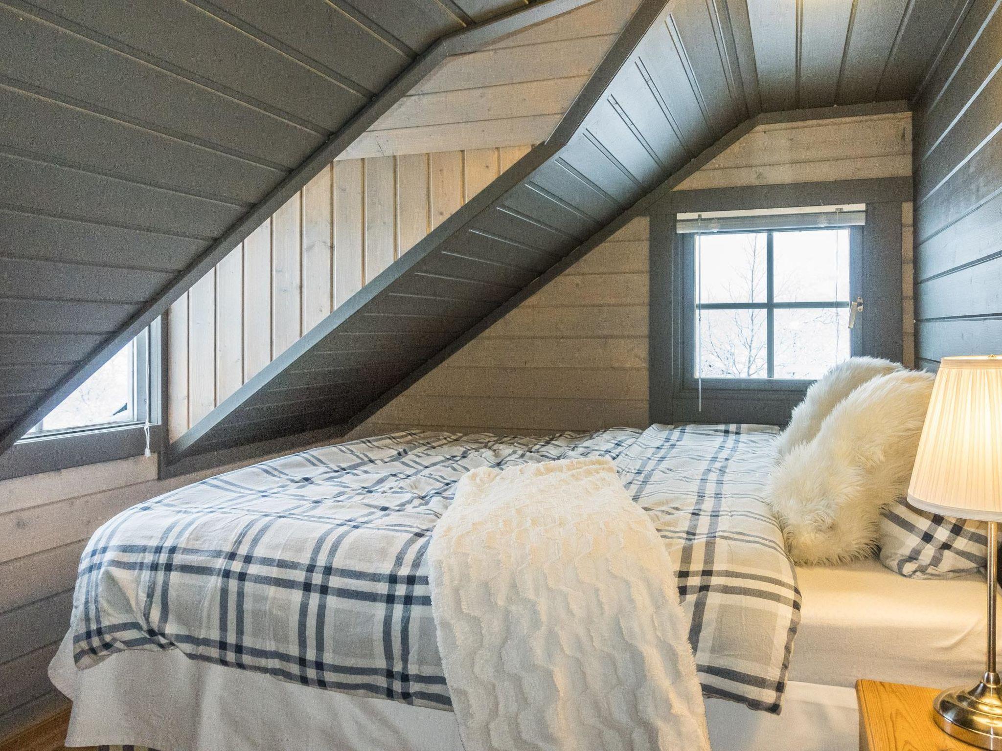 On the upper floor, bedroom with double bed (180 cm wide), bedroom with 2 separate beds (90 cm wide), bedroom has sloping ceilings, living area with sofa bed, balcony and WC.