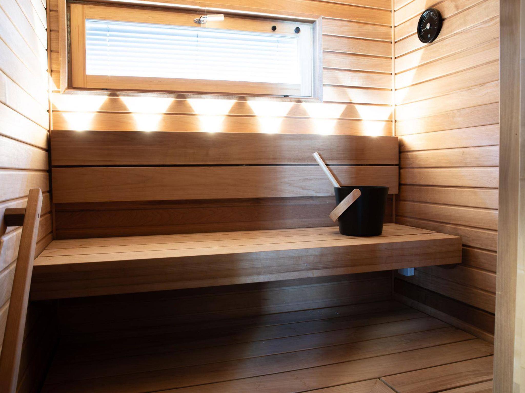 This wooden cabin was completed in 2023. There is a combined kitchen/living room, one bedroom with a double bed, and two additional bedrooms each with two single beds. The cabin includes a sauna, a bathroom with a toilet, an additional toilet, a utility room, and an entrance hall. There is also a terrace.