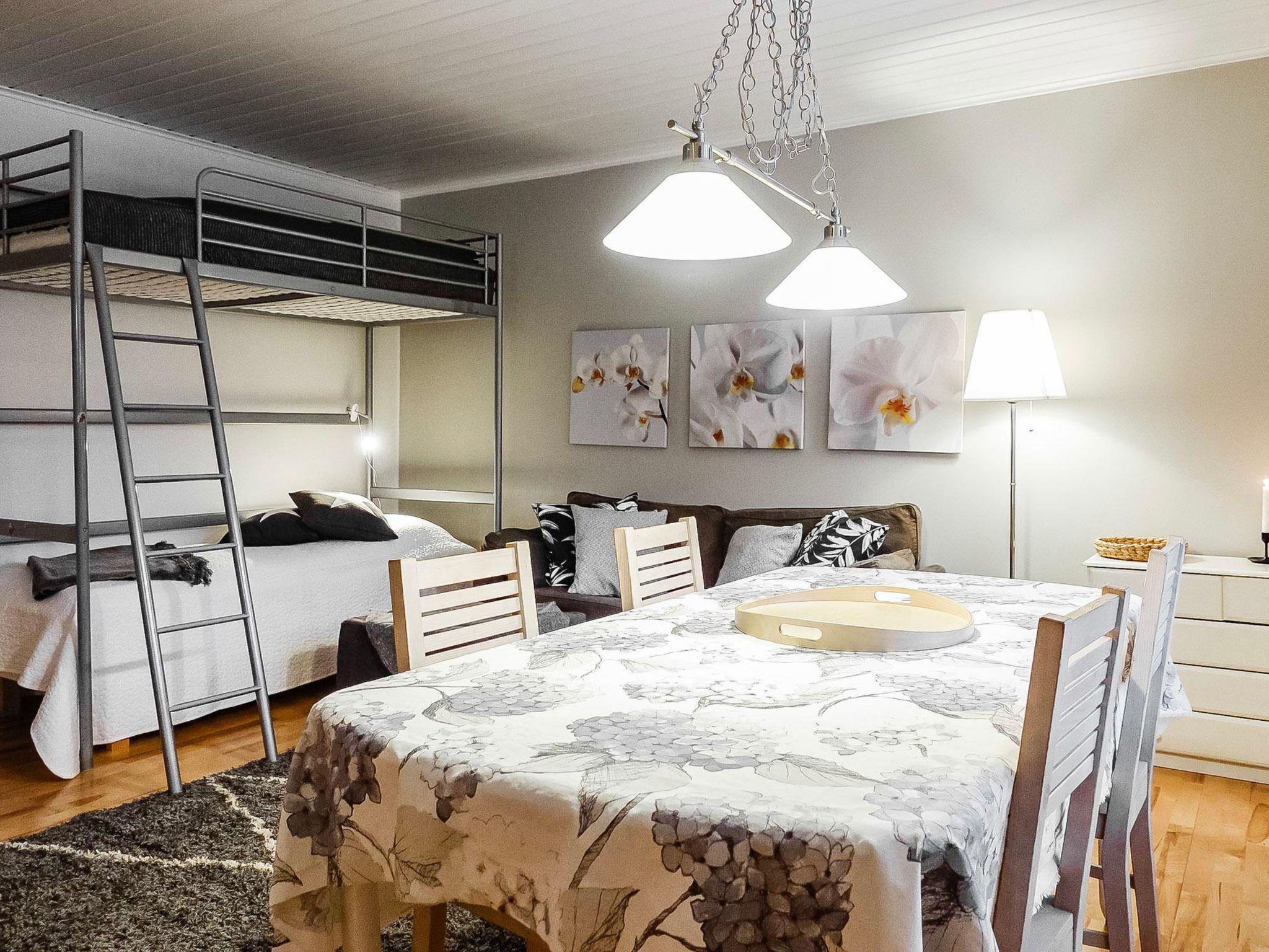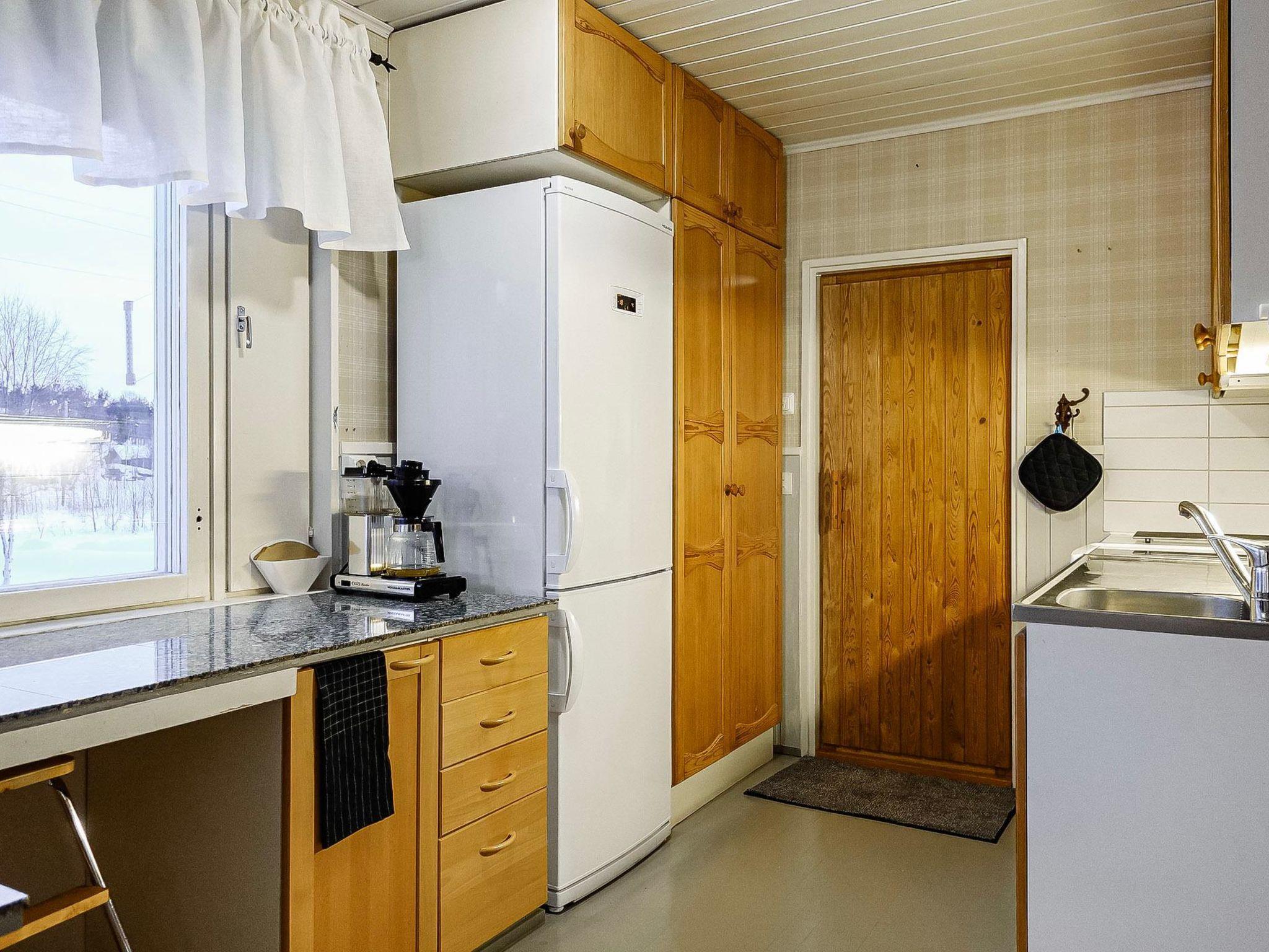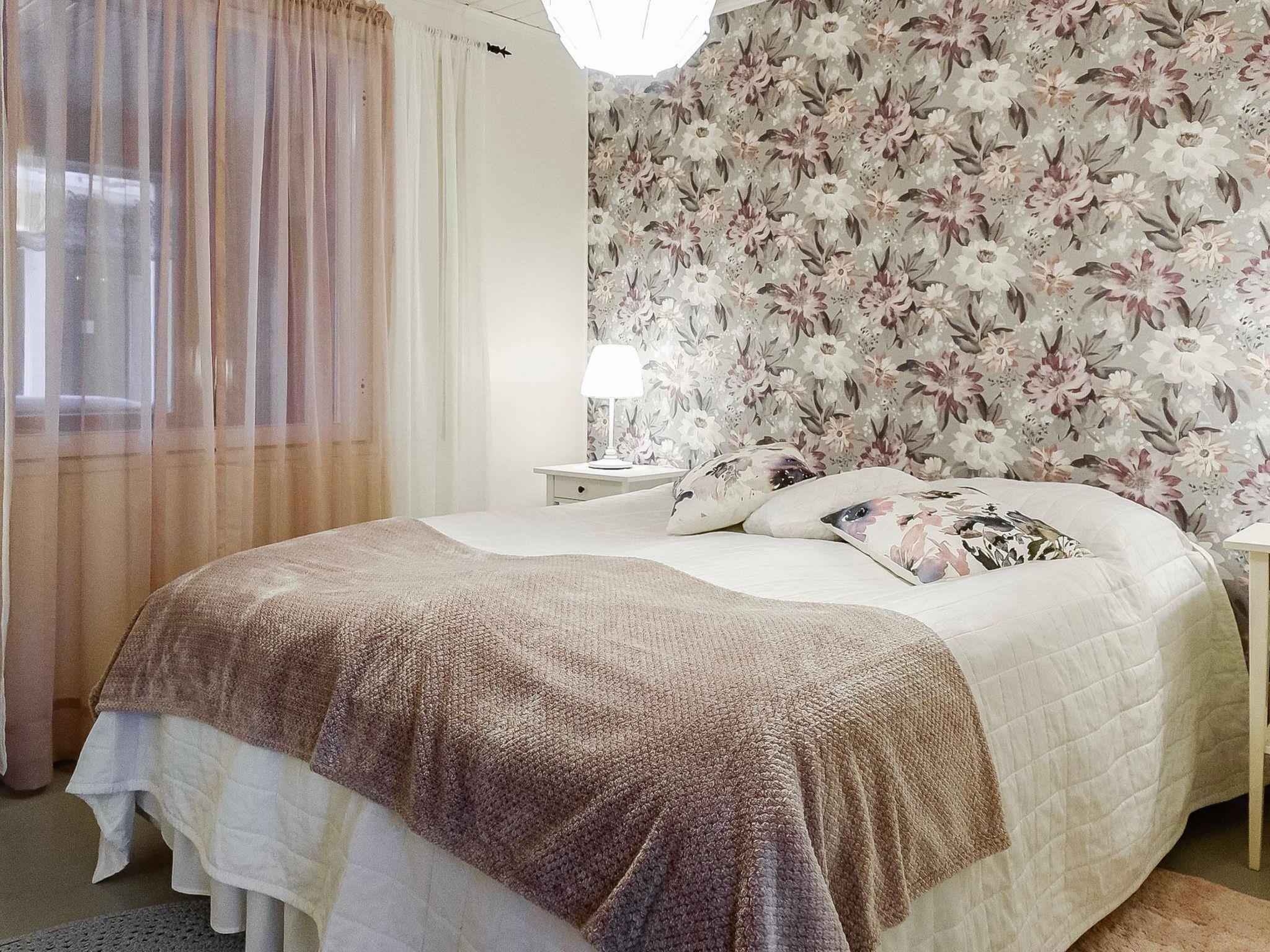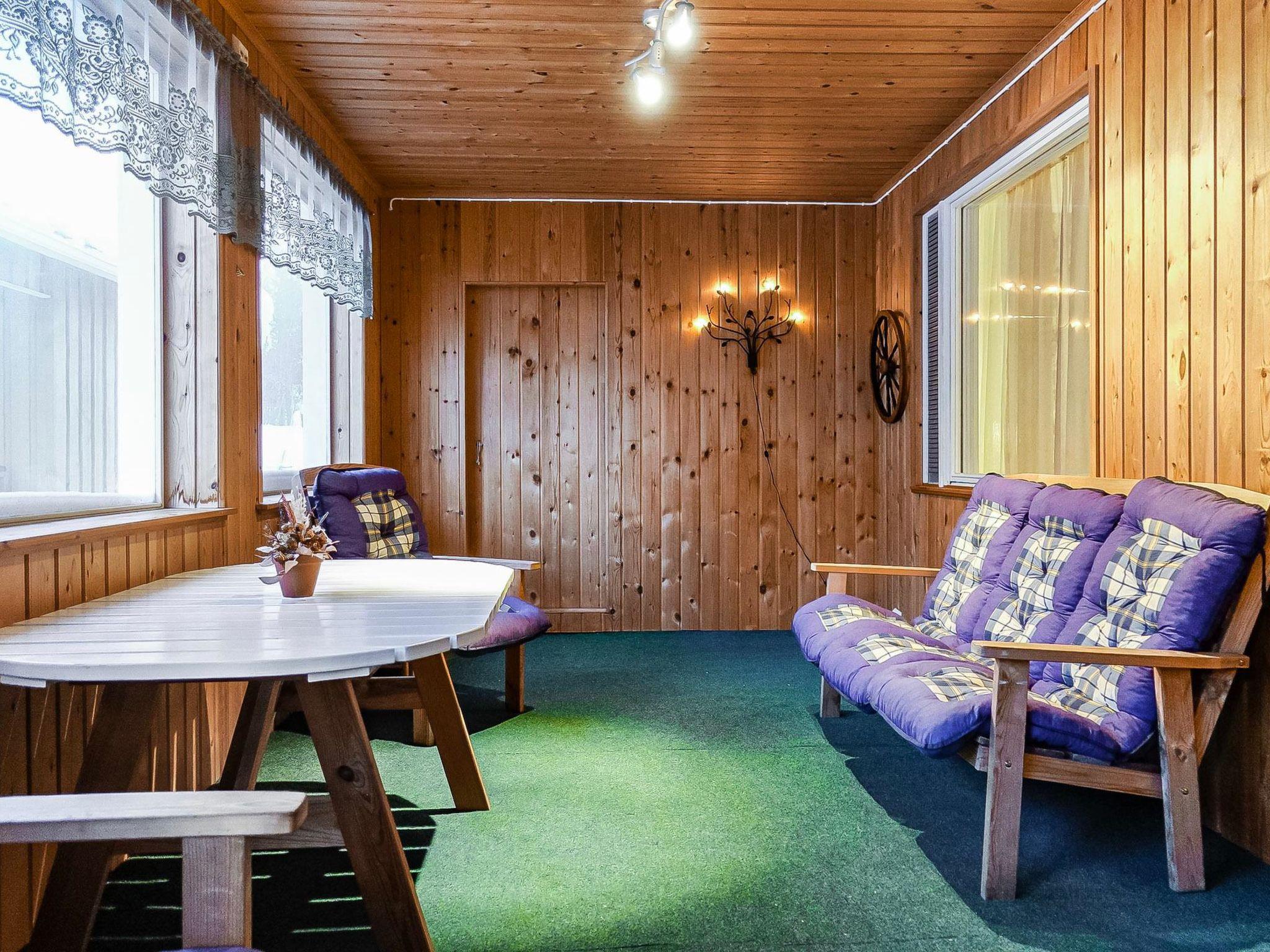 Wooden house, built in 1985, renovated in 2017. Living room with sofa bed and bunk bed, kitchen, bedroom with double bed, spreadable sofa for two (160 cm wide when spread) in the fireplace room, sauna, washroom, separate WC, walk-in closet, spacious glazed porch (no heating) and large storage.