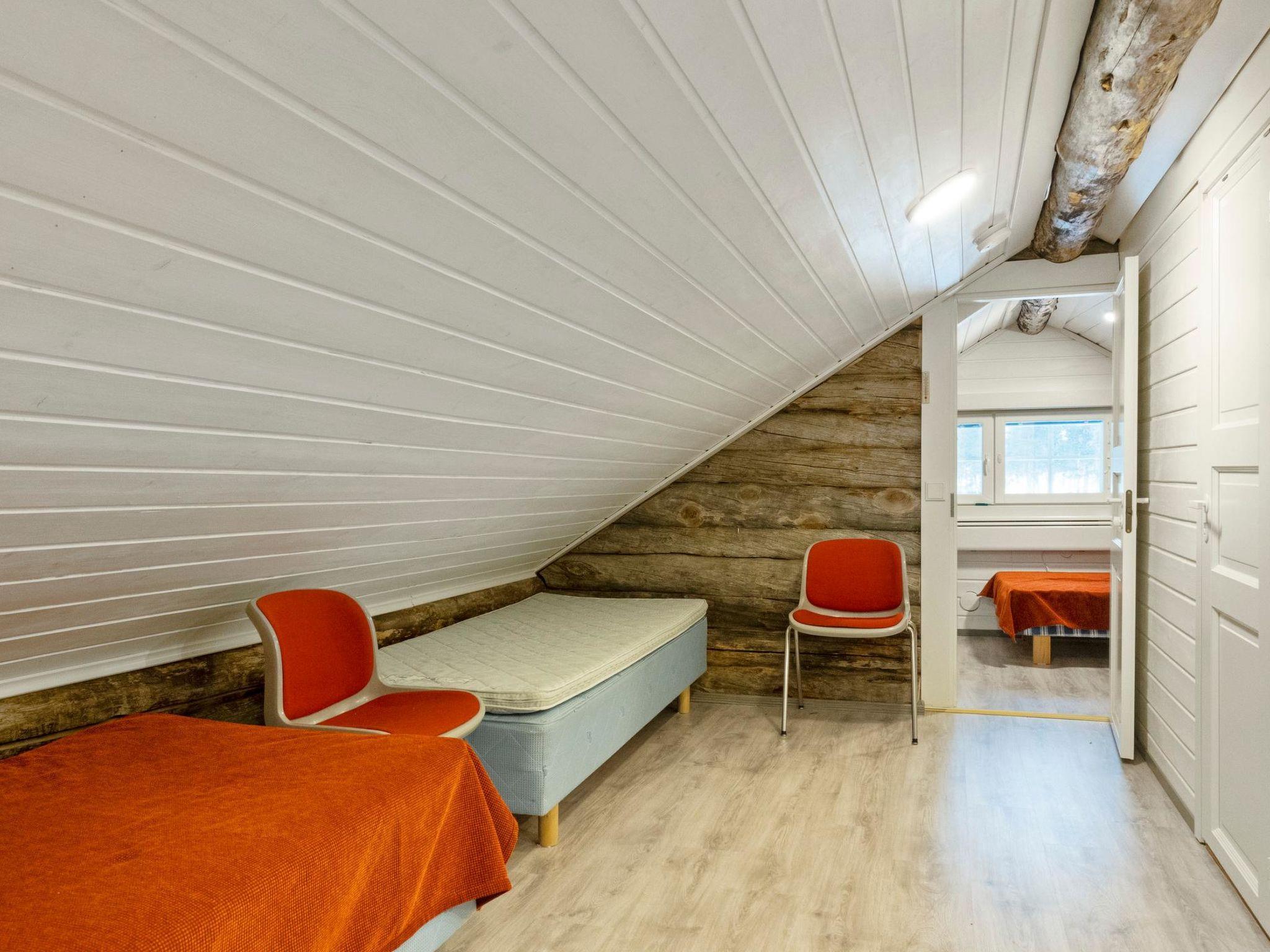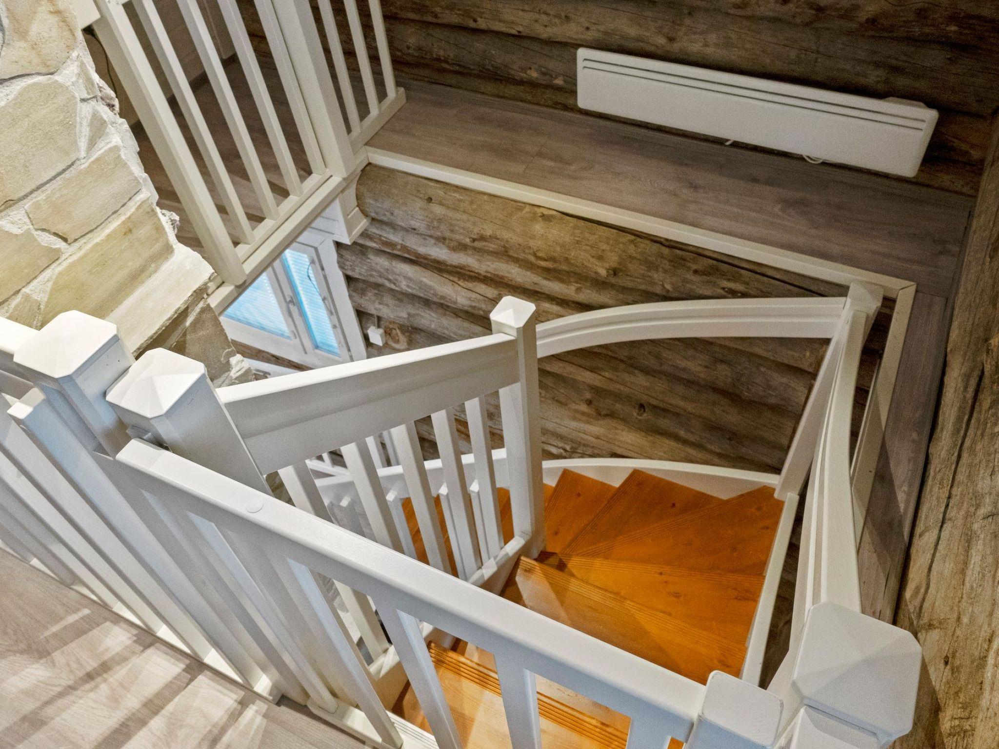 Kelo log-built cabin, facilities on three floors, built in 2022. The middle floor is the entrance floor and has living room / kitchen. The room height in the middle floor is lower than normal, 190 cm. Access to balcony and open terrace from the middle floor. On the upper floor, there are two beds and an additional bedroom with 2 beds. The upper floor has a sloping ceiling. The length of the another bed located in the bedroom can be adjusted. In the picture, the length is 170 cm. The bed can also be placed in some another location on the upper floor, then the bed can be extended to normal length. WC also on the upper floor. Access to the uppermost balcony from the upper floor. On the ground floor, there is sauna, washroom/WC and fireplace room (sofa bed as an alternative bed; the maximum number of people is 4).