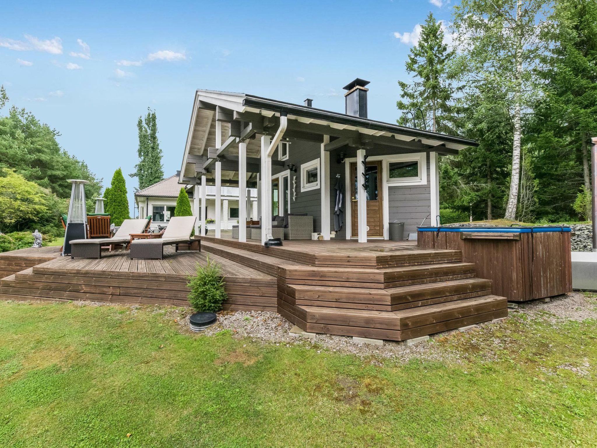Large furnished terrace, hot tub (included in the price), sun beds, infrared heaters and gas grill in front of the sauna building.