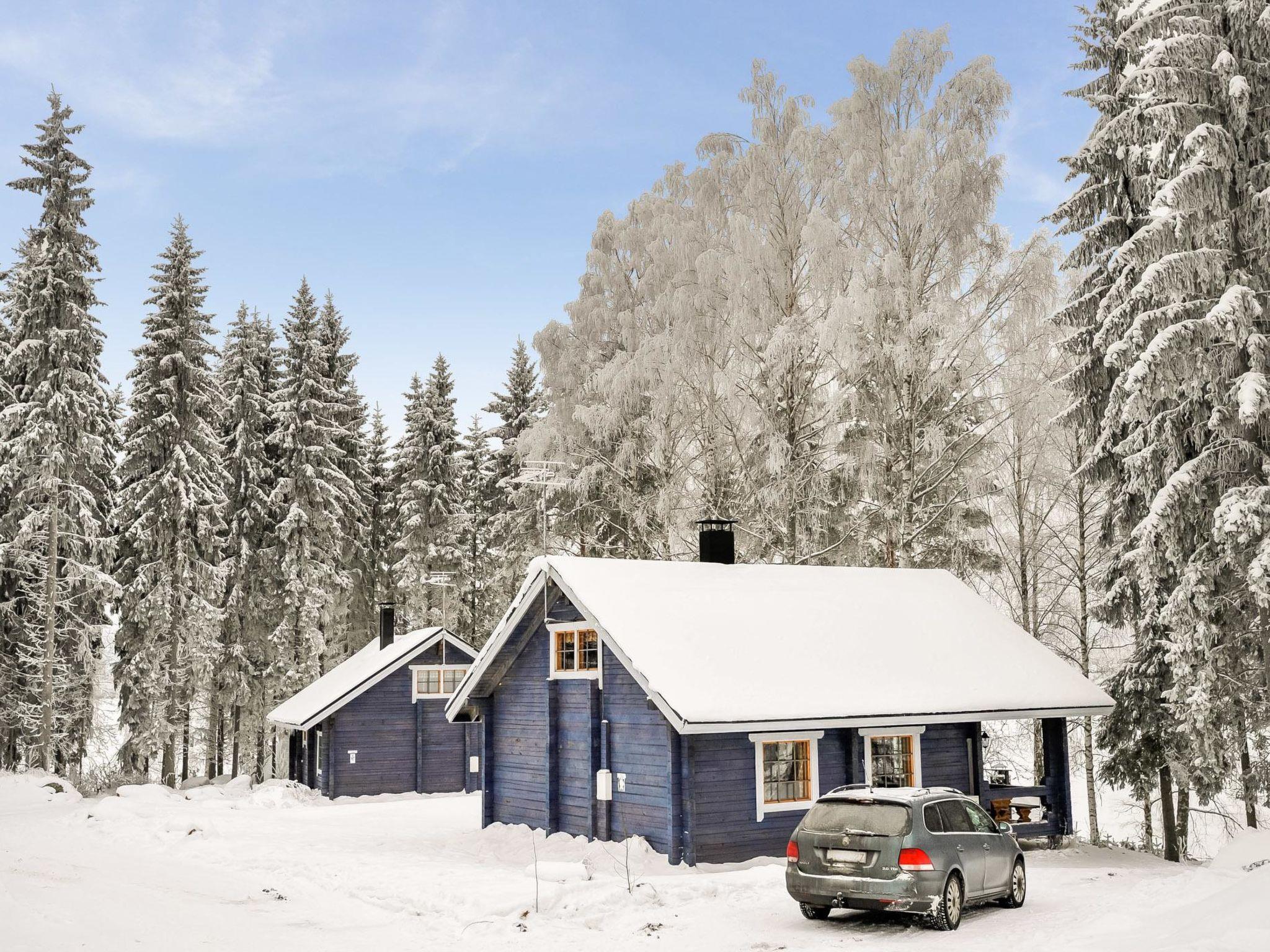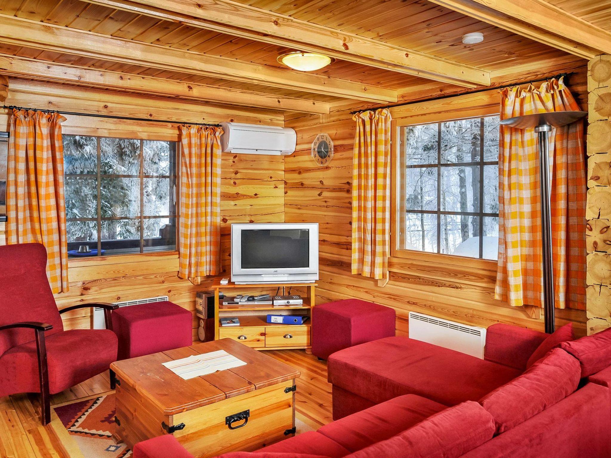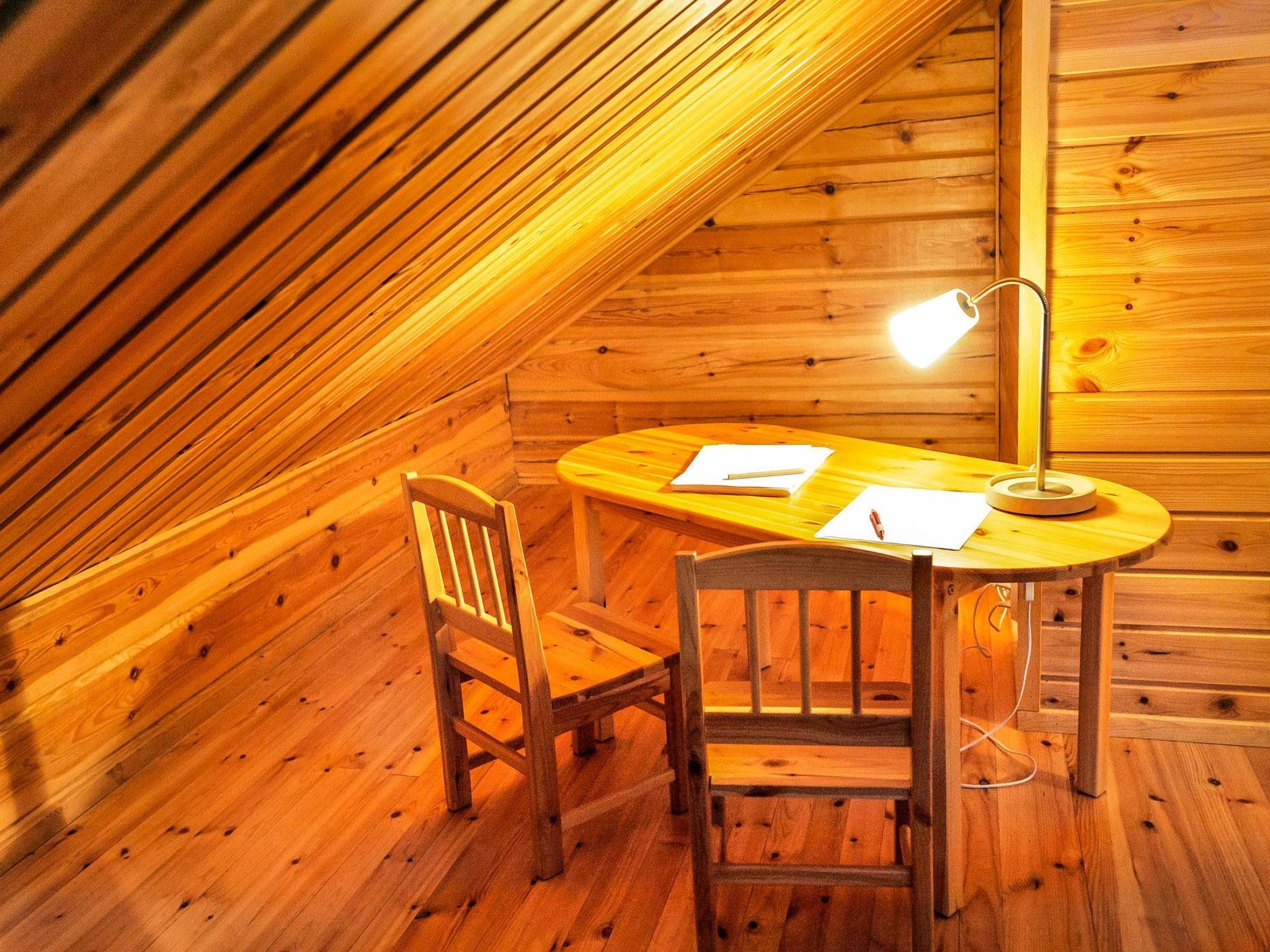 Log cabin 2006, living room / kitchen with sofa bed, 2 bedrooms with 2 beds in each (one downstairs, another upstairs), sleeping loft with 4 beds, wood-heated sauna, washroom, toilet downstairs and upstairs, covered porch.