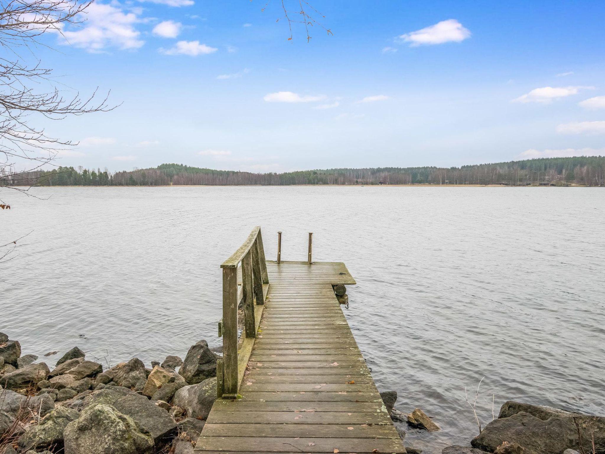 37 km to the north from Hämeenlinna, lake Iso-Roine 20 m (length 8 km, width 2 km), hard rocky (also bigger stones) bottom, pier. There is a steep slope down to the shore. There is a nature trail in front of the cabin, descending the slope to the pier, where you can go swimming by stairs. Not child-friendly shore. There is a shallow child-friendly sand beach within 200 m from the cabin (shared with neighboring cabins).