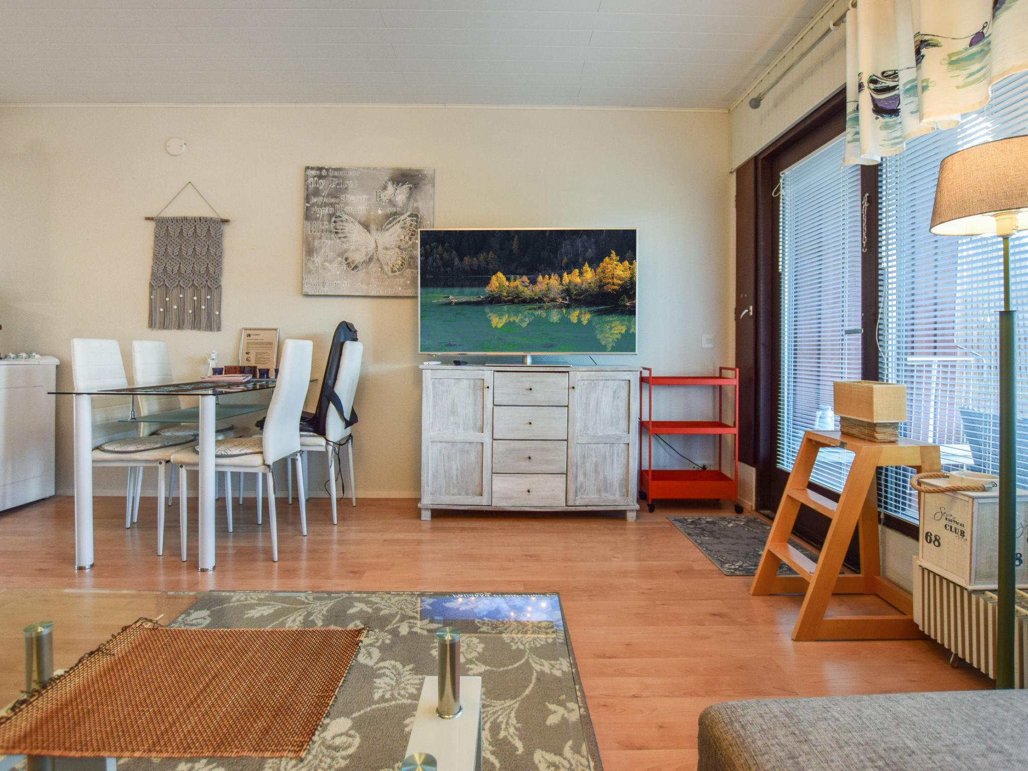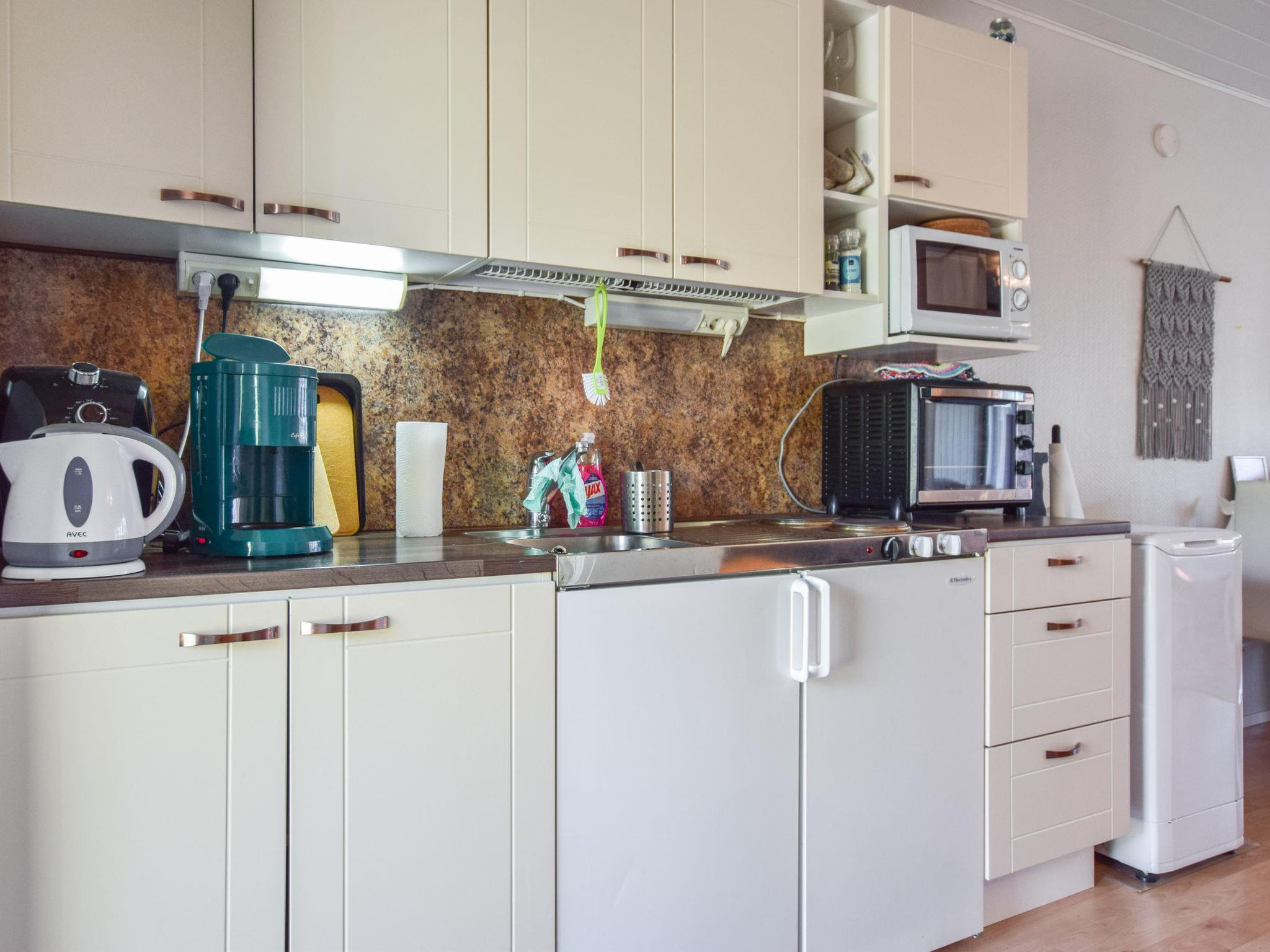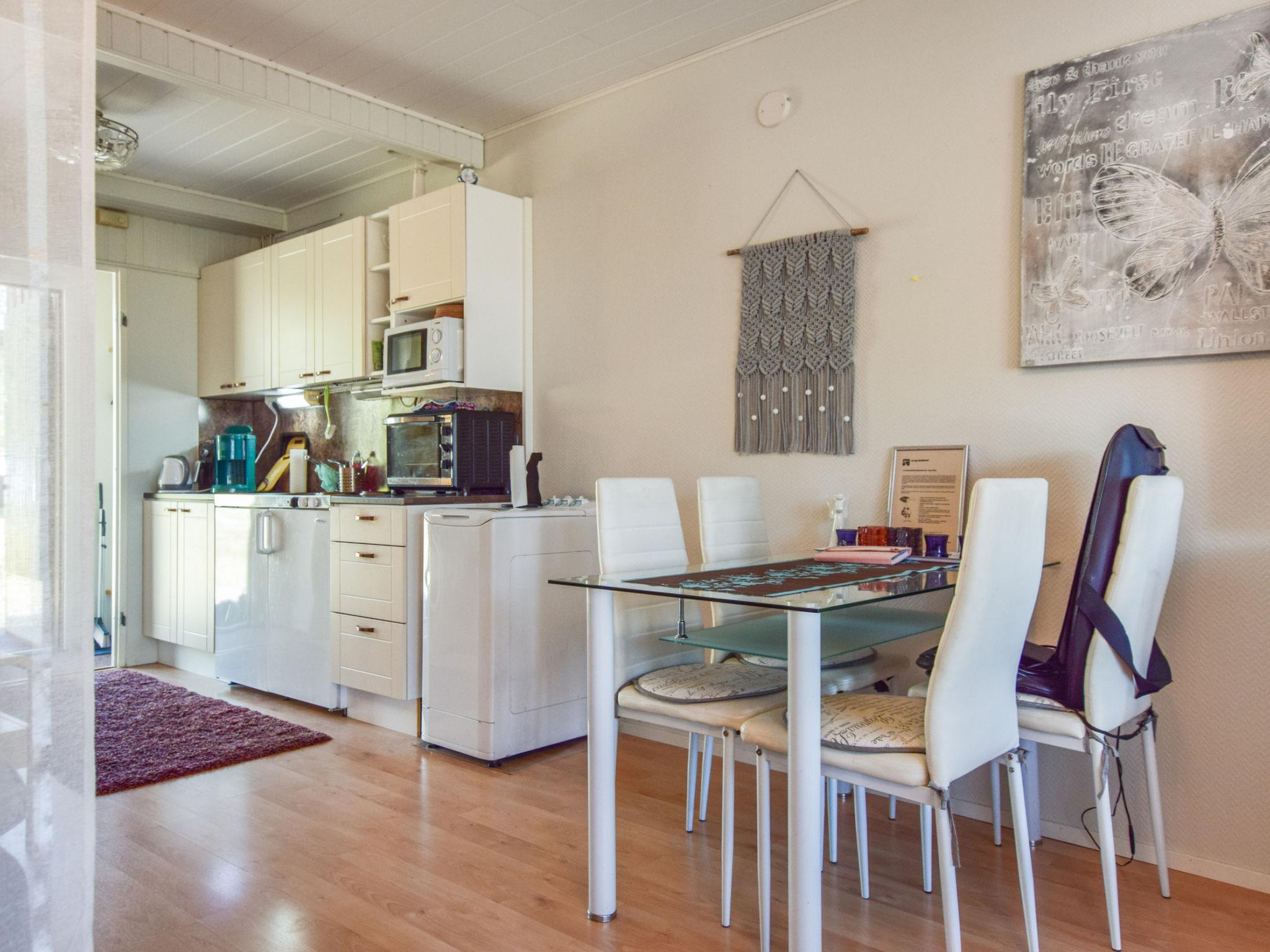 Board-paneled terraced house apartment 1975, living room-kitchen, hallway, living room with a 160 x 200 cm double bed and a sofa bed, which becomes an additional 140 x 200 cm bed for two. The living room-kitchen has a separate small oven / hob, microwave, airfryer, coffee maker, kettle and toaster.