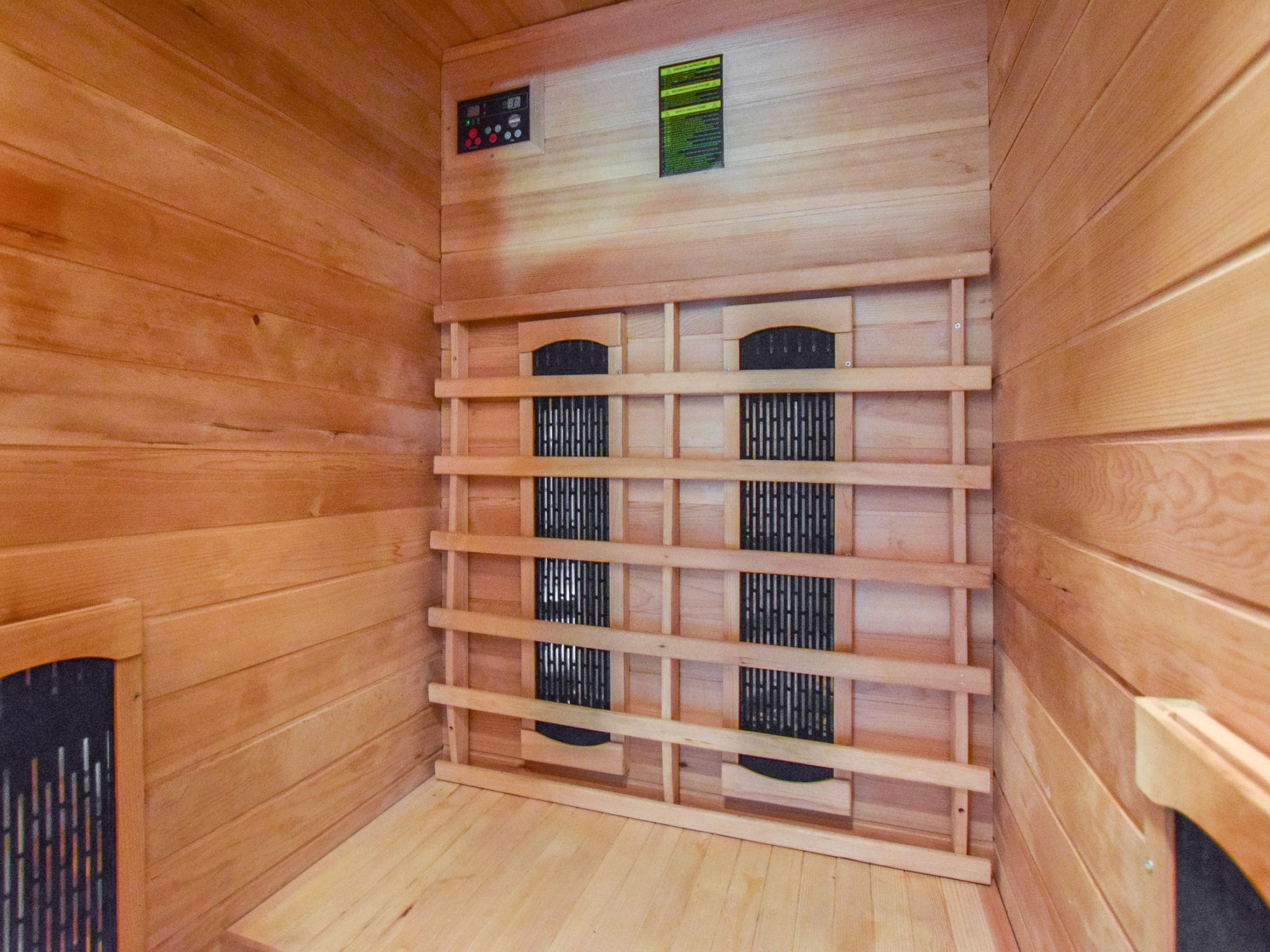 The washroom has a toilet and shower. The apartment also has a small infrared sauna.