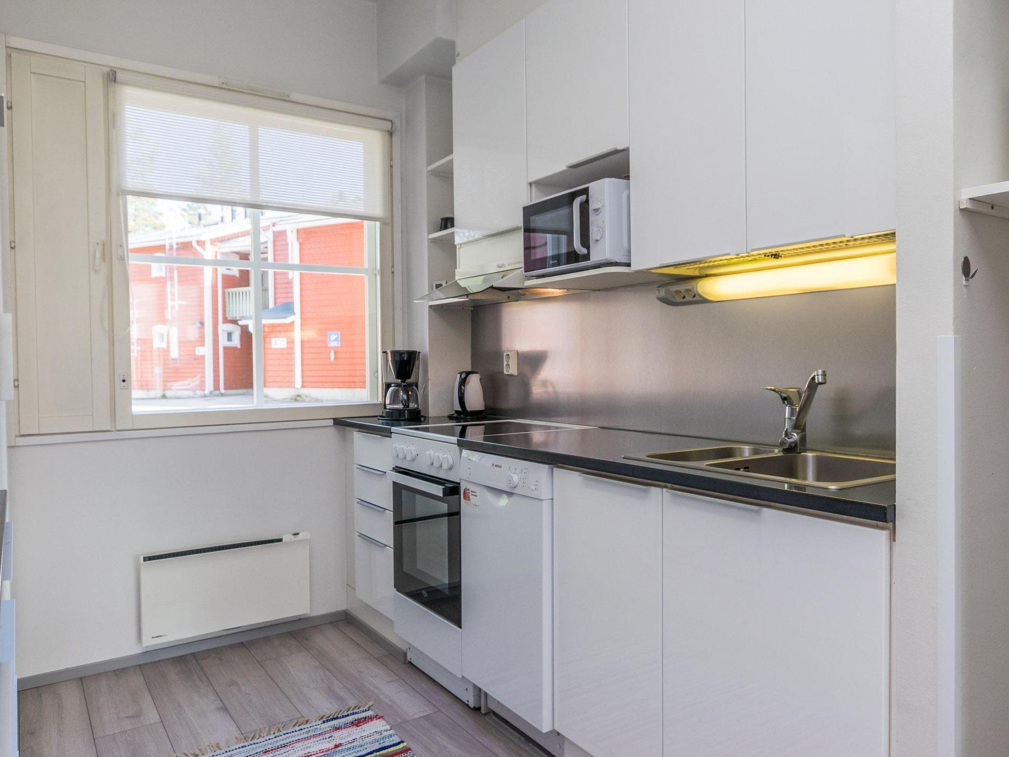 The spacious living room/kitchen offers space for socialising and relaxing. A soapstone fireplace in the living room adds to the cosiness and warmth of the accommodation. The kitchen makes it easy to prepare tasty meals, and the dining area is right next to it.