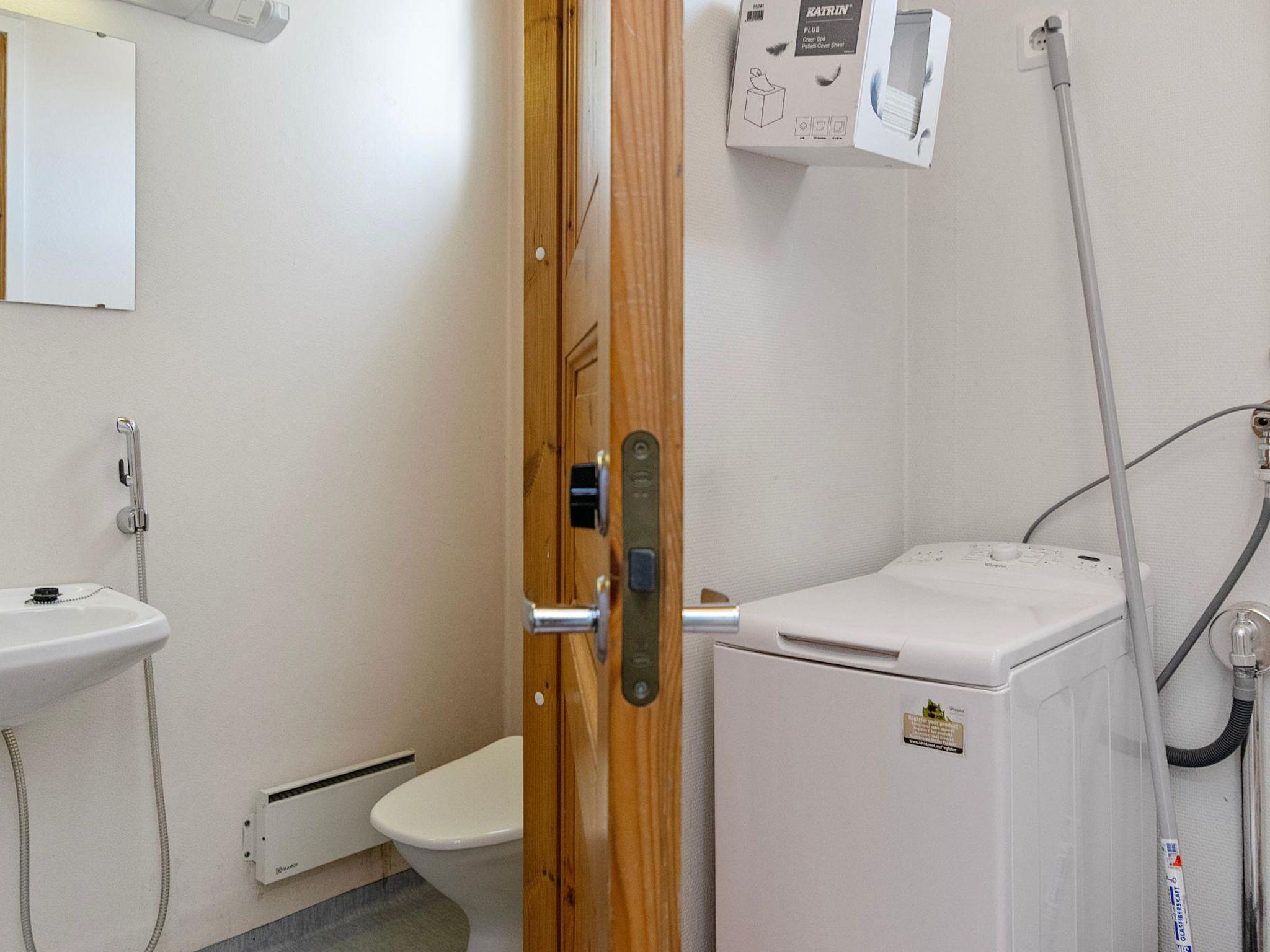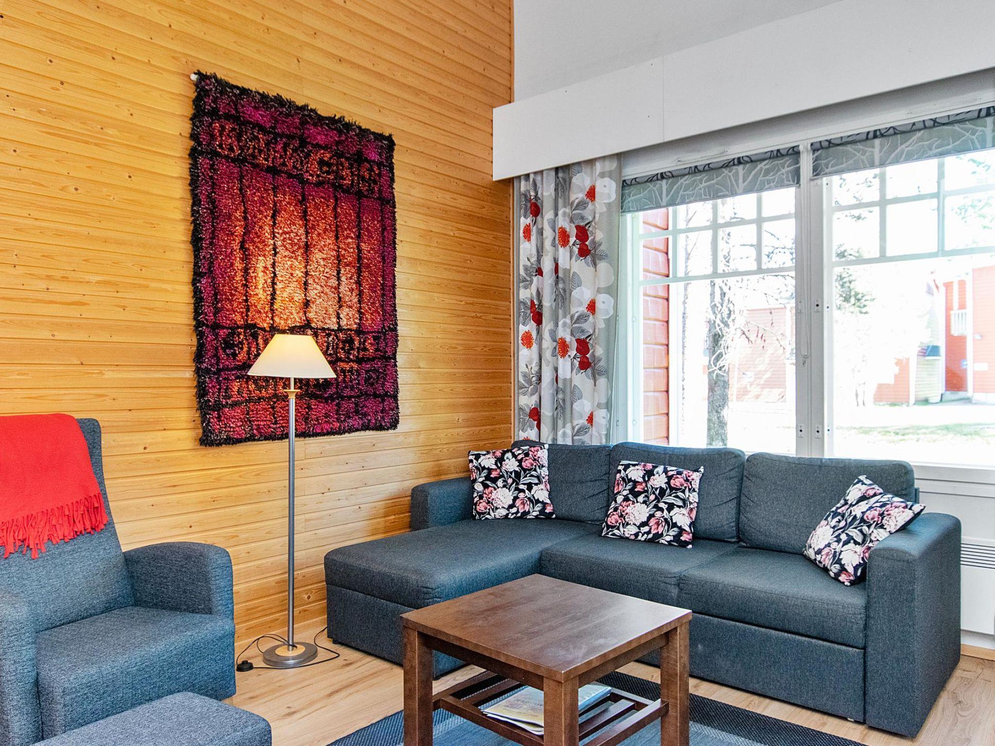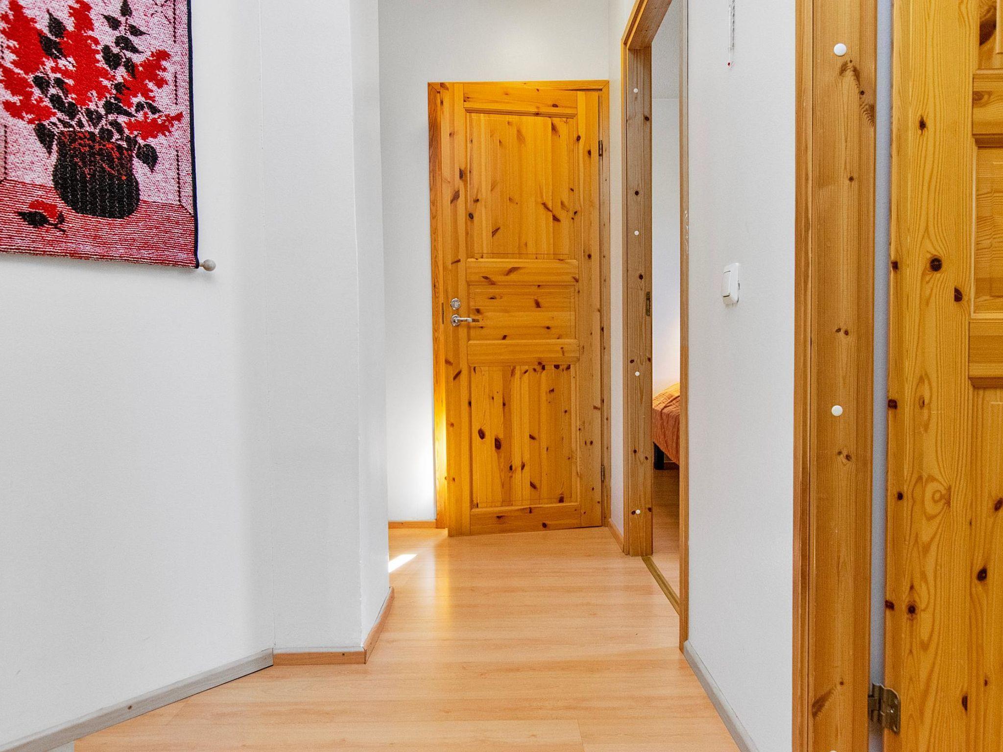The kitchen living room has space for socialising as well as relaxing. A soapstone fireplace in the living room adds to the cosiness and warmth of the accommodation. There are spiral stairs from the living room to the upper floor.