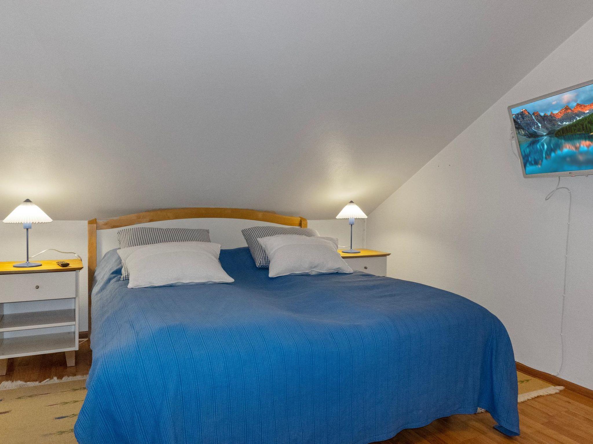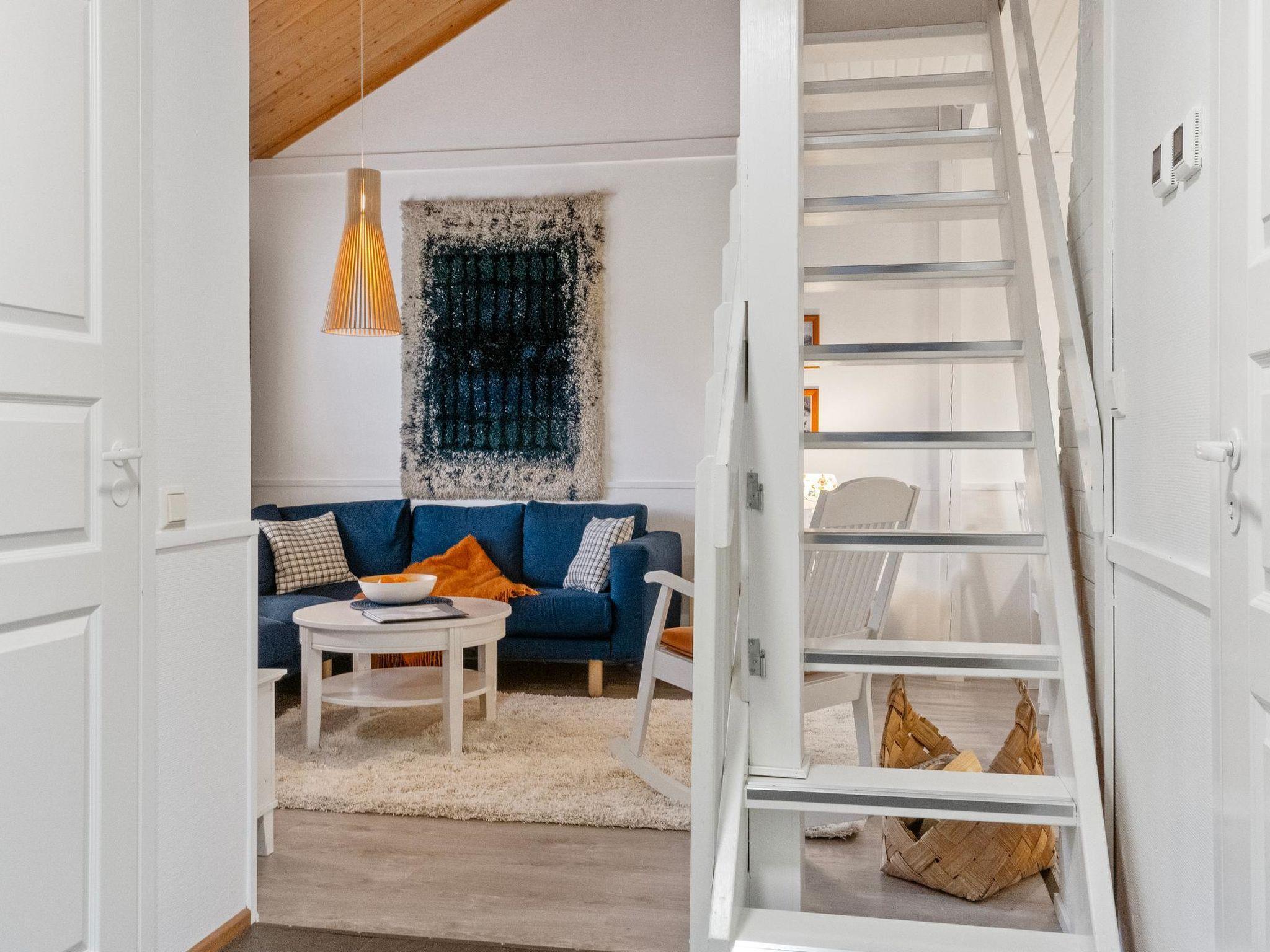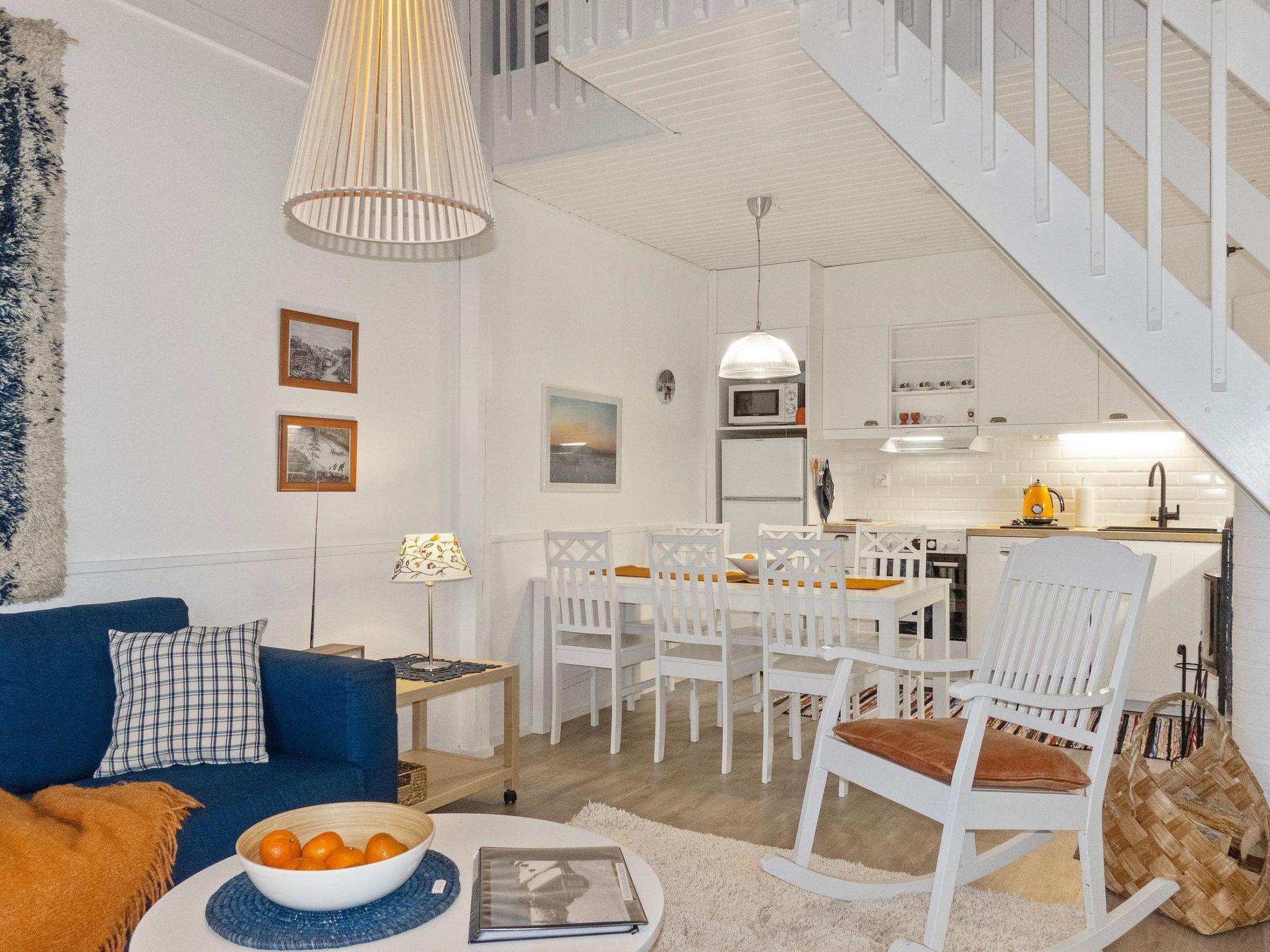 The apartment has a living room/kitchen, bedroom with 2 beds, loft with 2 beds, and an additional bedroom separated by a sliding door on the upper floor, featuring a double bed and access to the bedroom through the loft. Sauna, a shower room, a separate WC, and a storage room.