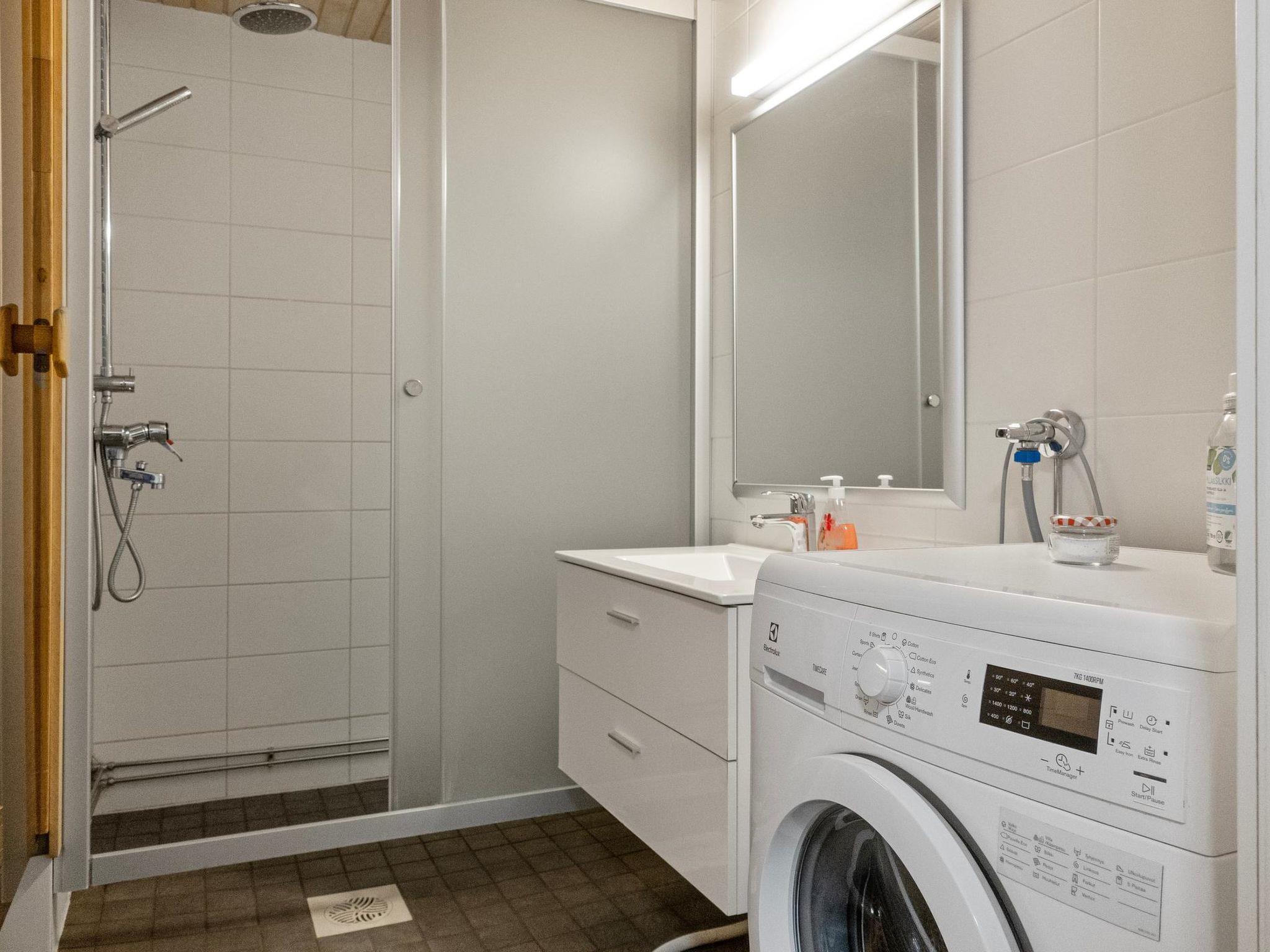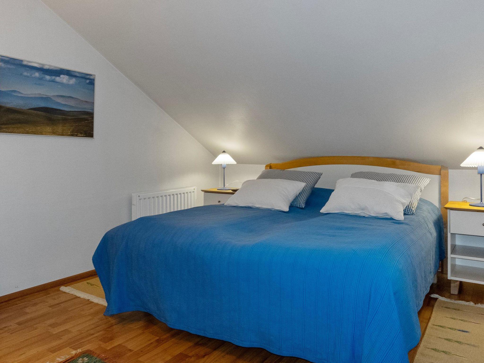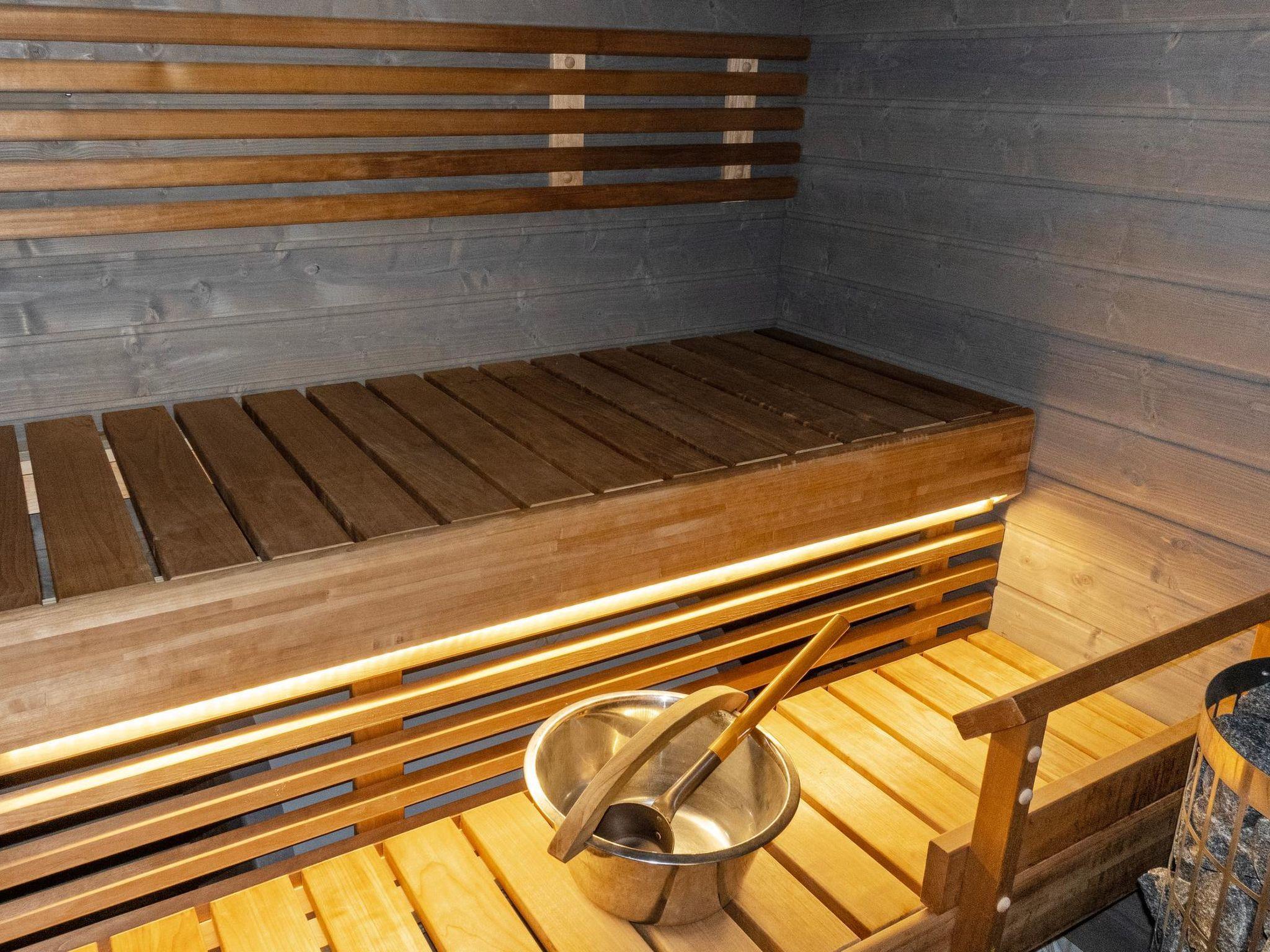 The apartment has a living room/kitchen, bedroom with 2 beds, loft with 2 beds, and an additional bedroom separated by a sliding door on the upper floor, featuring a double bed and access to the bedroom through the loft. Sauna, a shower room, a separate WC, and a storage room.