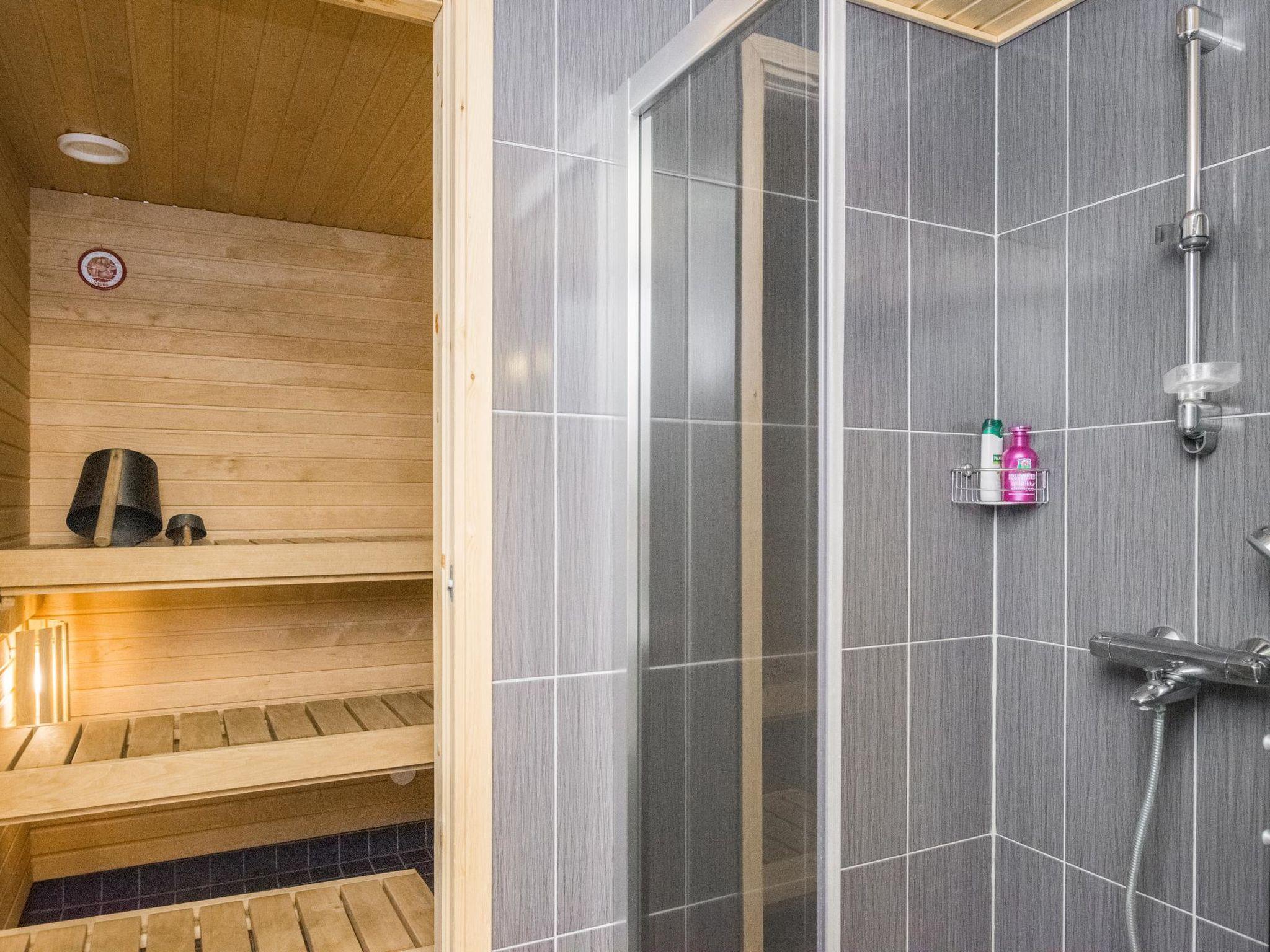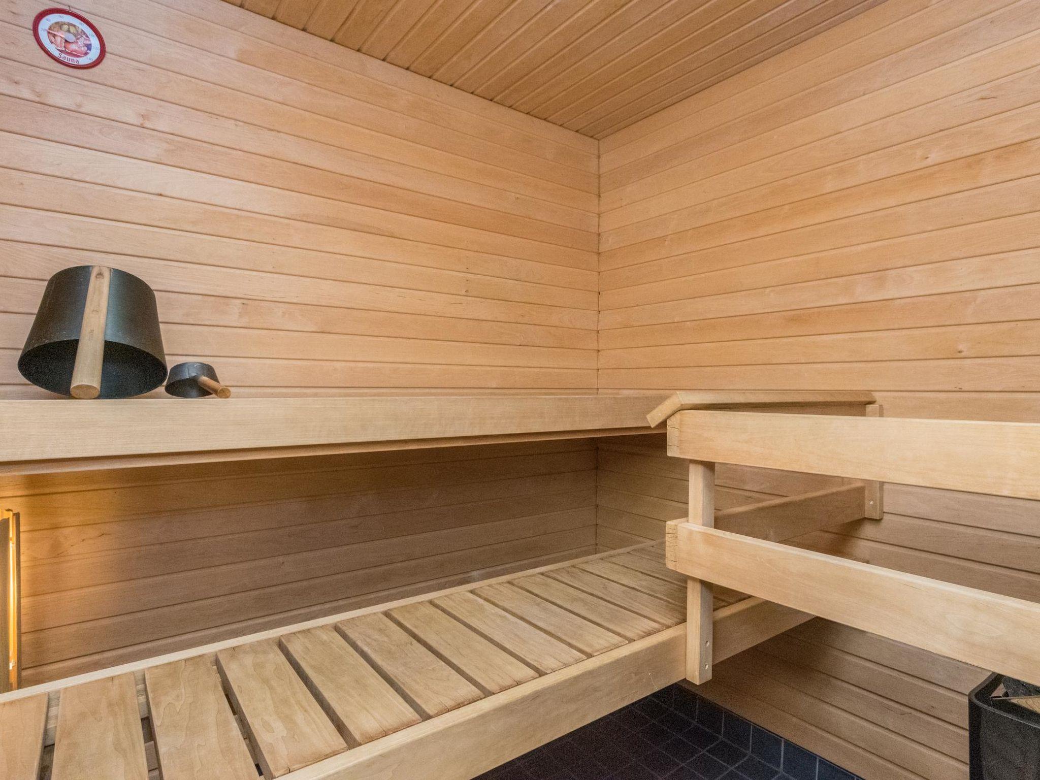 The sauna, washroom and toilet are located in the same room.
