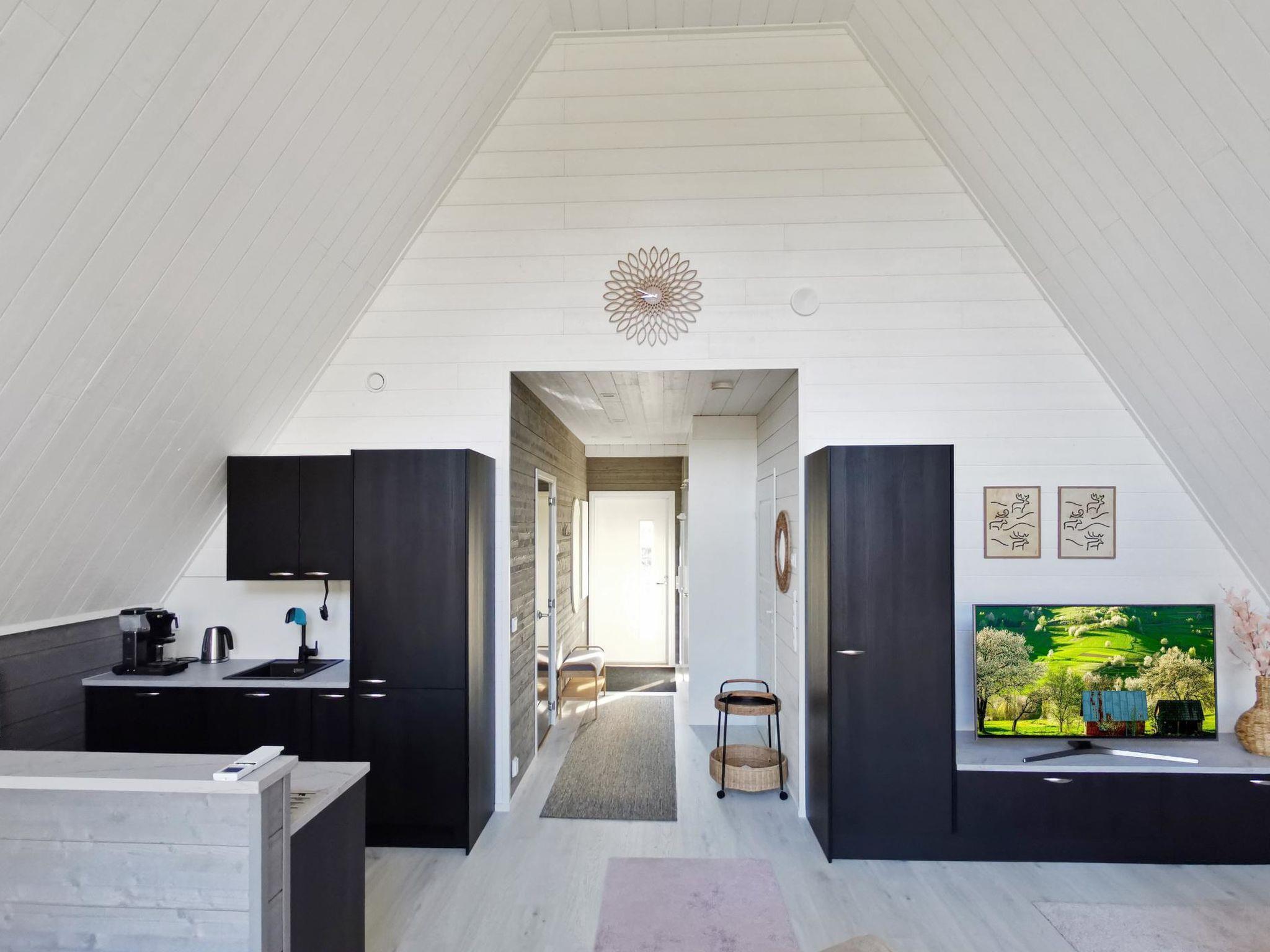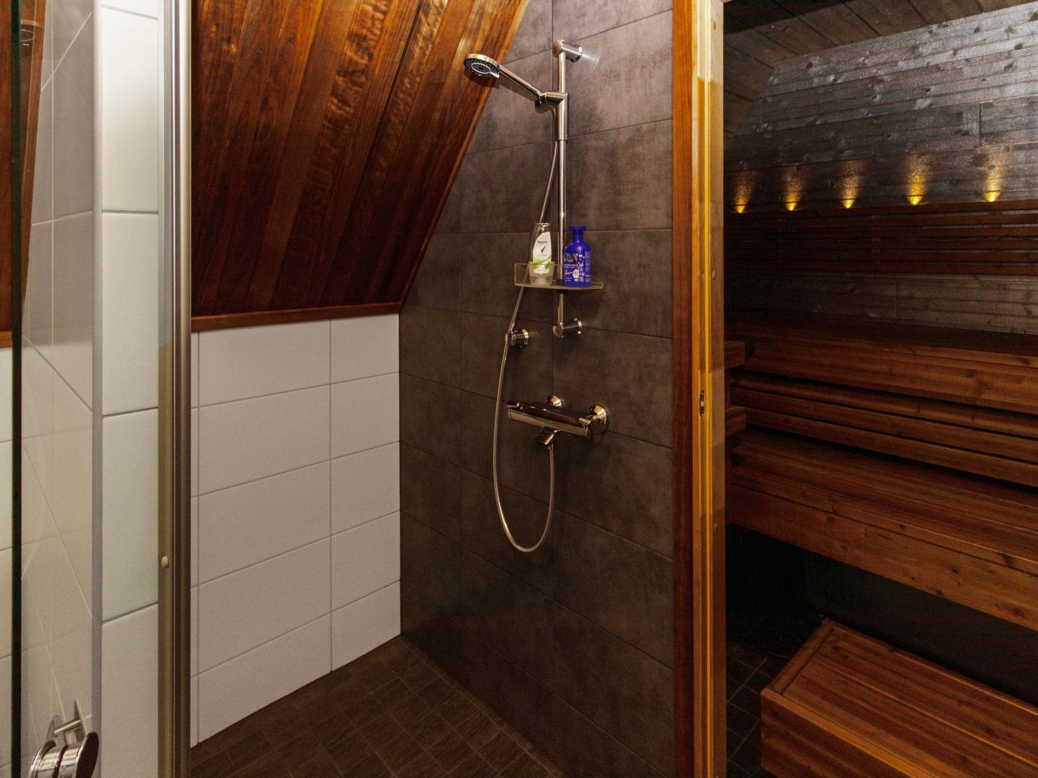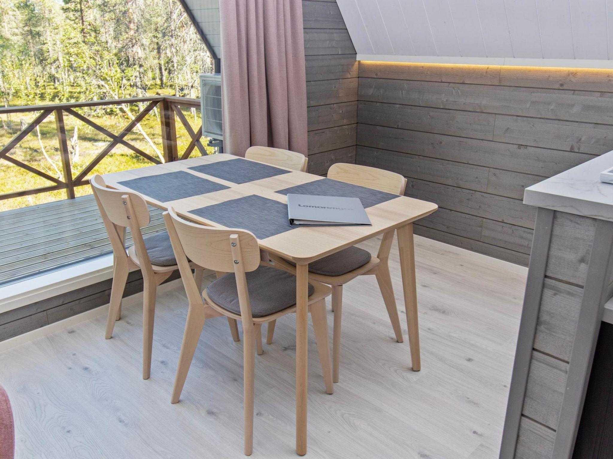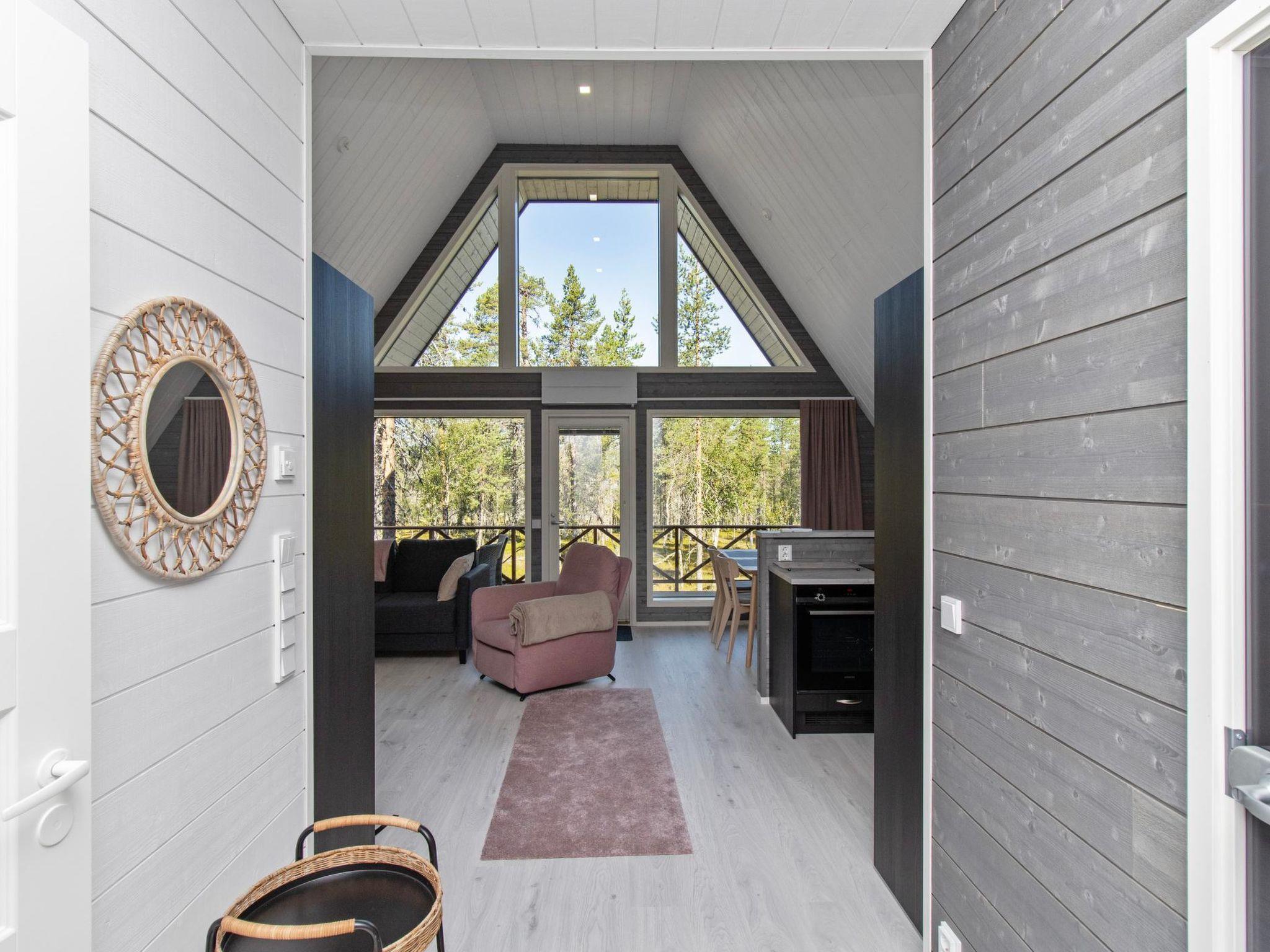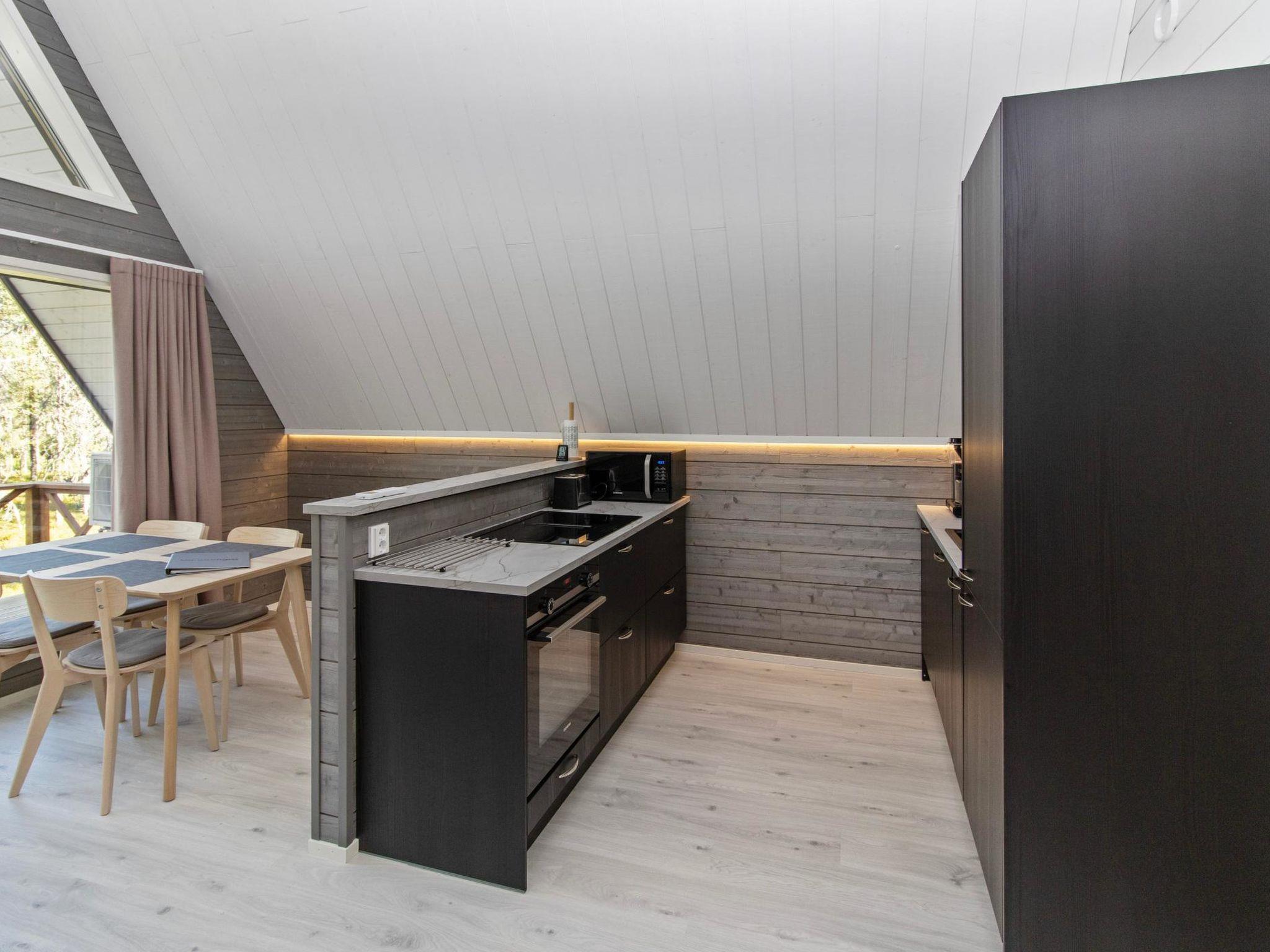 The bright, high-ceilinged living room/kitchen opens onto a rear terrace with a beautiful forest view. The kitchen is equipped with high-quality, modern appliances that make your stay effortless and enjoyable. The cabin also features a luxurious bathroom, shower, and sauna, providing relaxation after a day of outdoor activities.