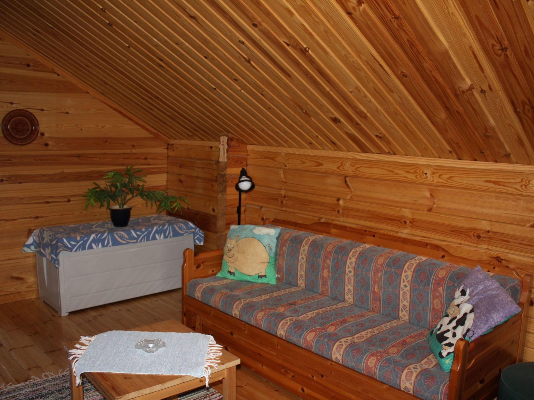 The cottage has 3 separate bedrooms on the first floor -two (two beds), one on the second floor (three beds). In the hall on the second floor of a sofa bed, a single bed, an extra refrigerator. Additionally there are cot and mattress. There is a cot and highchair. Maximum capacity - 8 people (two for an additional fee). Living room with sofas, fireplace, TV, CD, Wi-Fi. Fully equipped appartment: large dining table, fridge-freezer, microwave, dishwasher, coffee maker, toaster, dishes for 12 people and other kitchen utensils, electric stove, wood stove. On the ground floor toilet, wood-fired sauna, shower, washing machine. The cottage has hot and cold water, electric heating (+ wood-burning fireplace and stove). There is a vacuum cleaner, ironing board and iron.