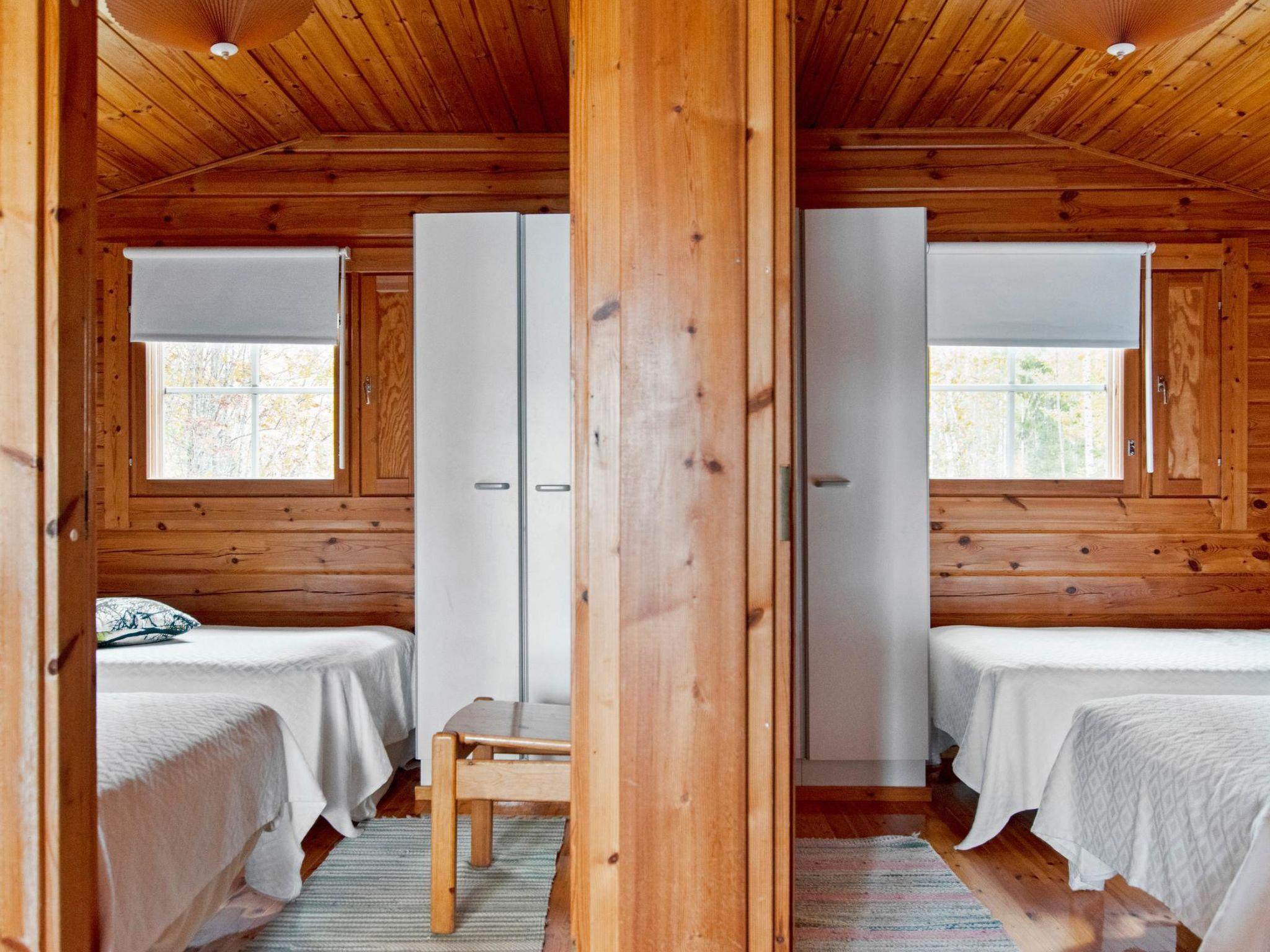 70 km east of Kuopio. Lake Vihtajärvi 20 m (length 4 km, breadth 1 km), shallow water, firm sanded clay bottom. Pier, own boat. Log cabin 1993, living room/kitchen, 2 bedrooms with 2 beds in each, dressing room, sauna, open veranda.