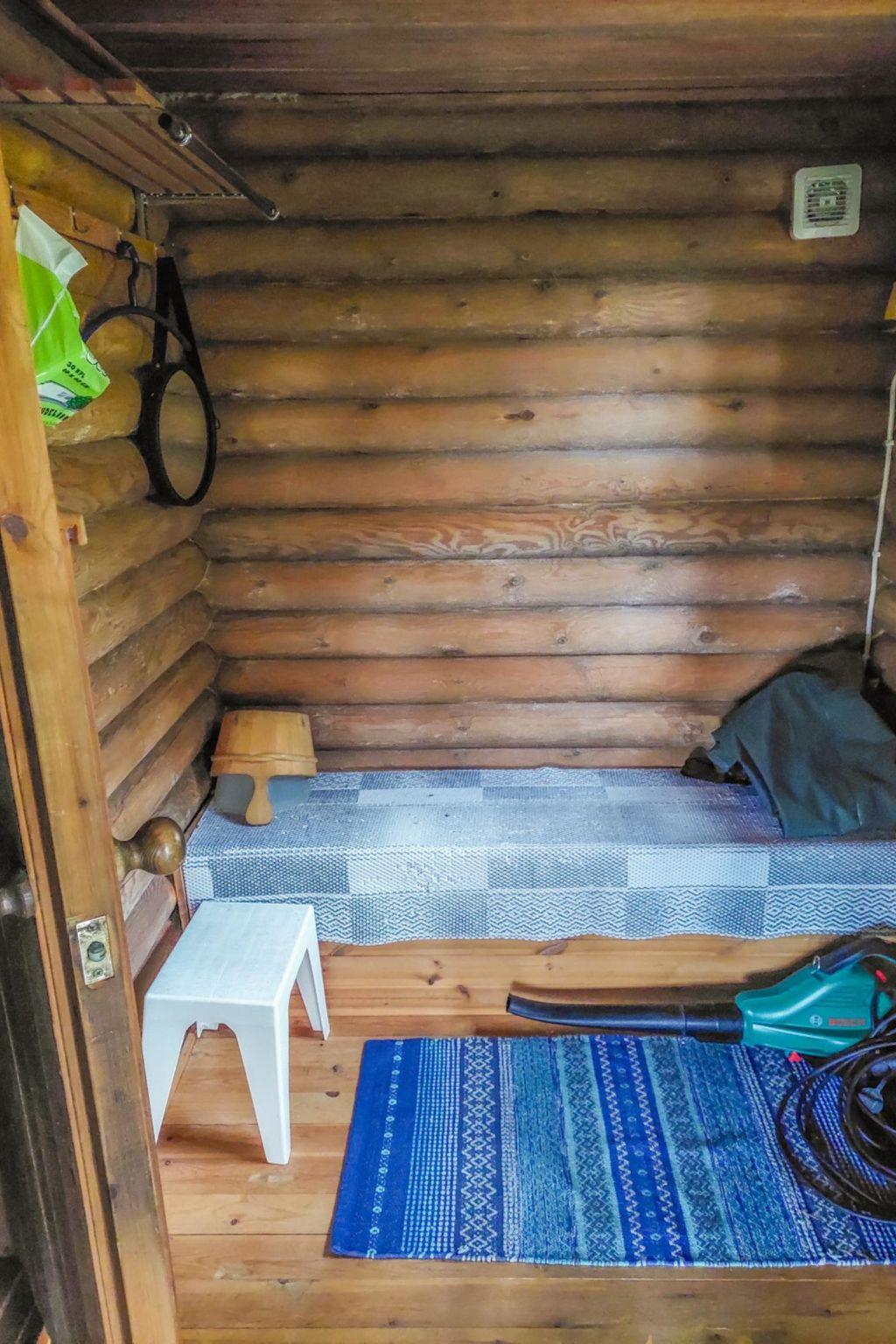 Wooden cottage, built in 2006. On the ground floor living room-kitchen, living area with sofa bed, sauna (electric soapstone stove), bathroom / WC (shower stall), covered porch. Upstairs a room with 2 single beds and a sofa bed for 2, terrace. Entry to the upstairs via porch stairs. Entry to the sauna and shower through porch.