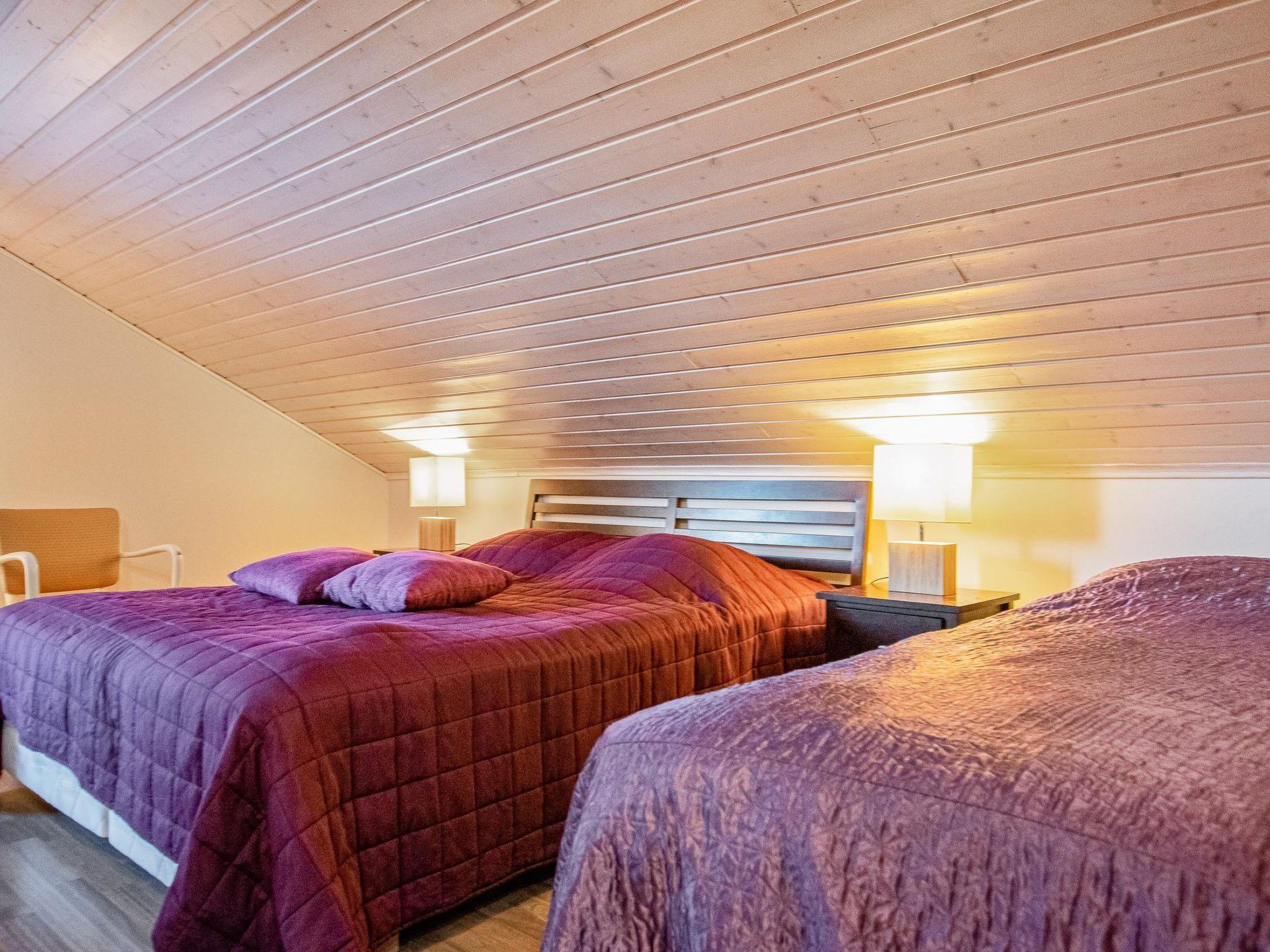 The cabin features a spacious living room with a sofa group, a heat-storing fireplace, large dining area, and a piano. The ground floor has one bedroom (double bed), a separate well-equipped kitchen, and a WC with a shower cubicle and washing machine. The upper floor includes two spacious bedrooms, each with a double bed and an additional single bed.