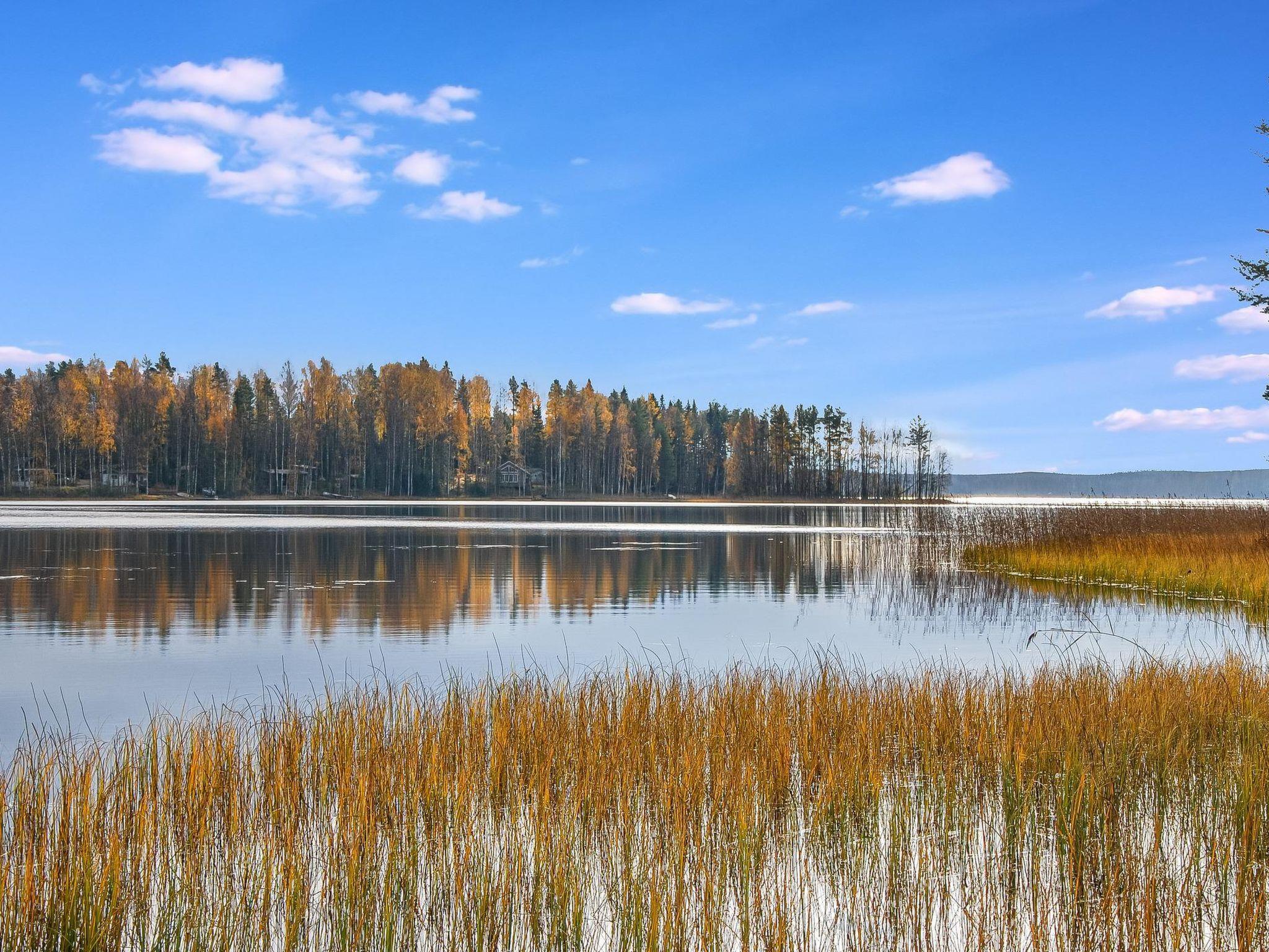 There is a separate lakeside sauna with living area. The living area is equipped with electric heating, a fireplace, and a refrigerator. The sauna features a wood-heated stove and cold water from a tap, with a cauldron for heating water.